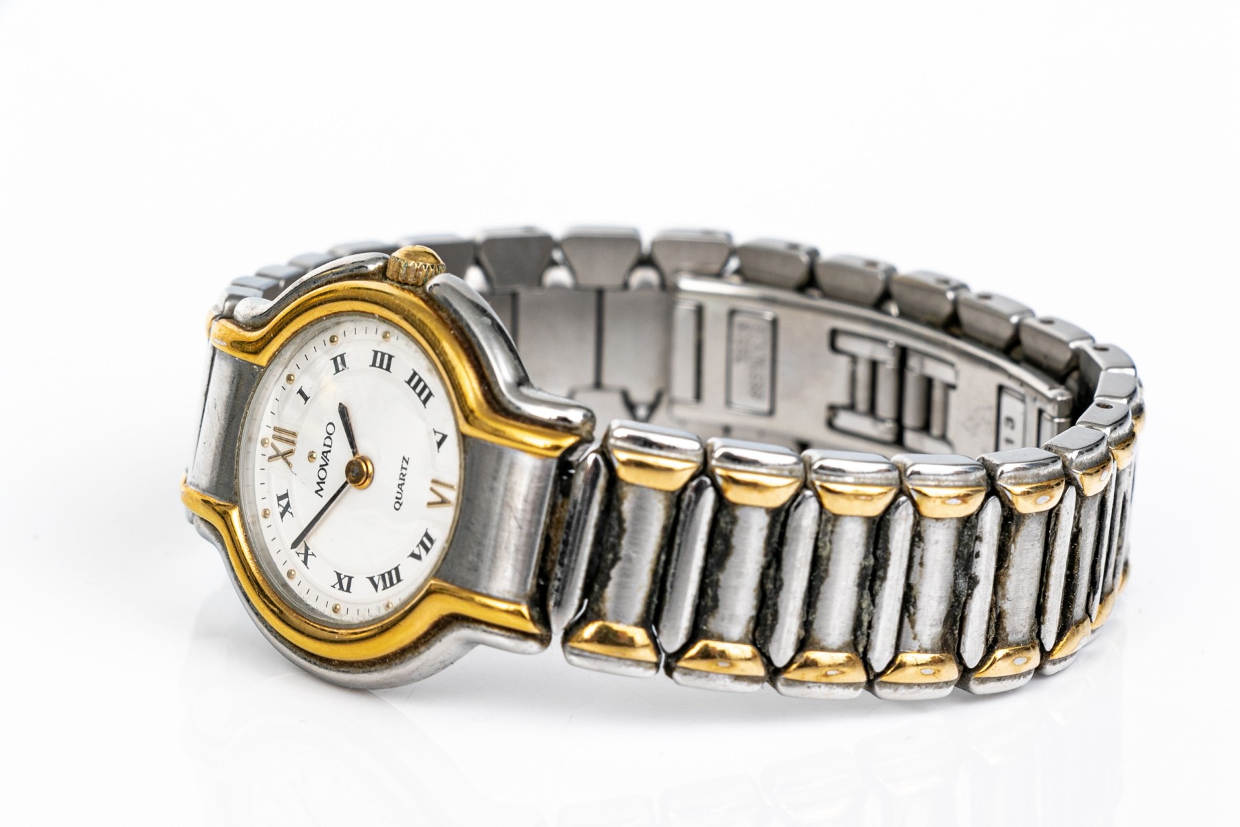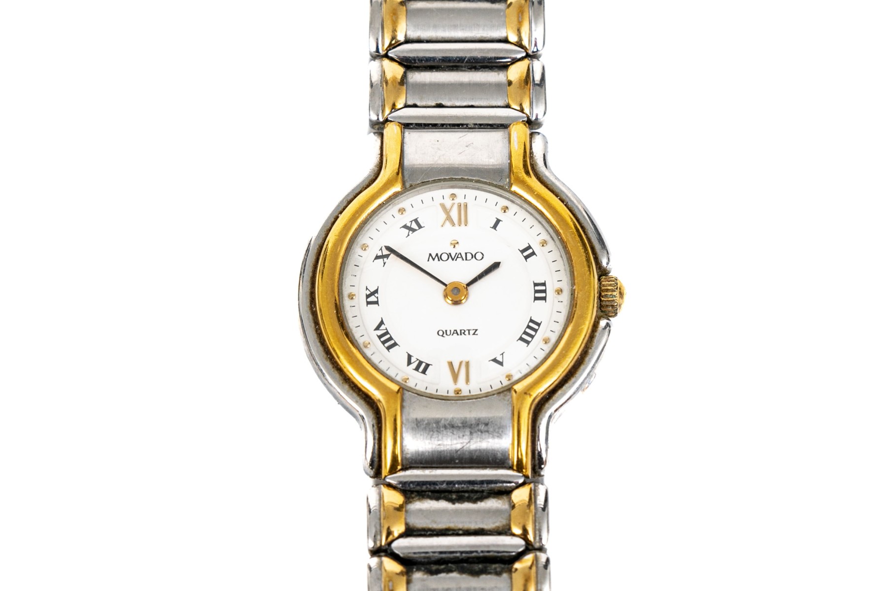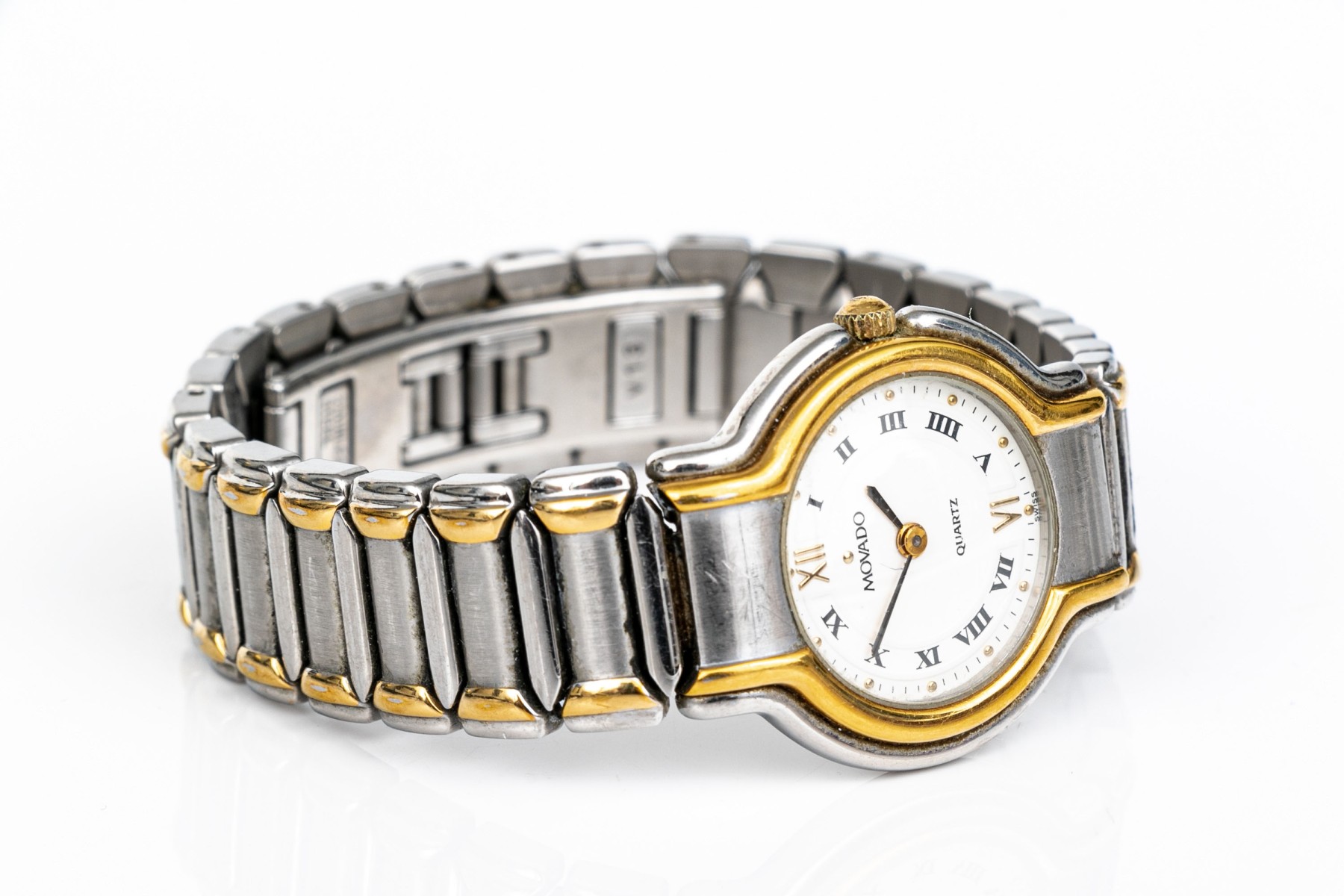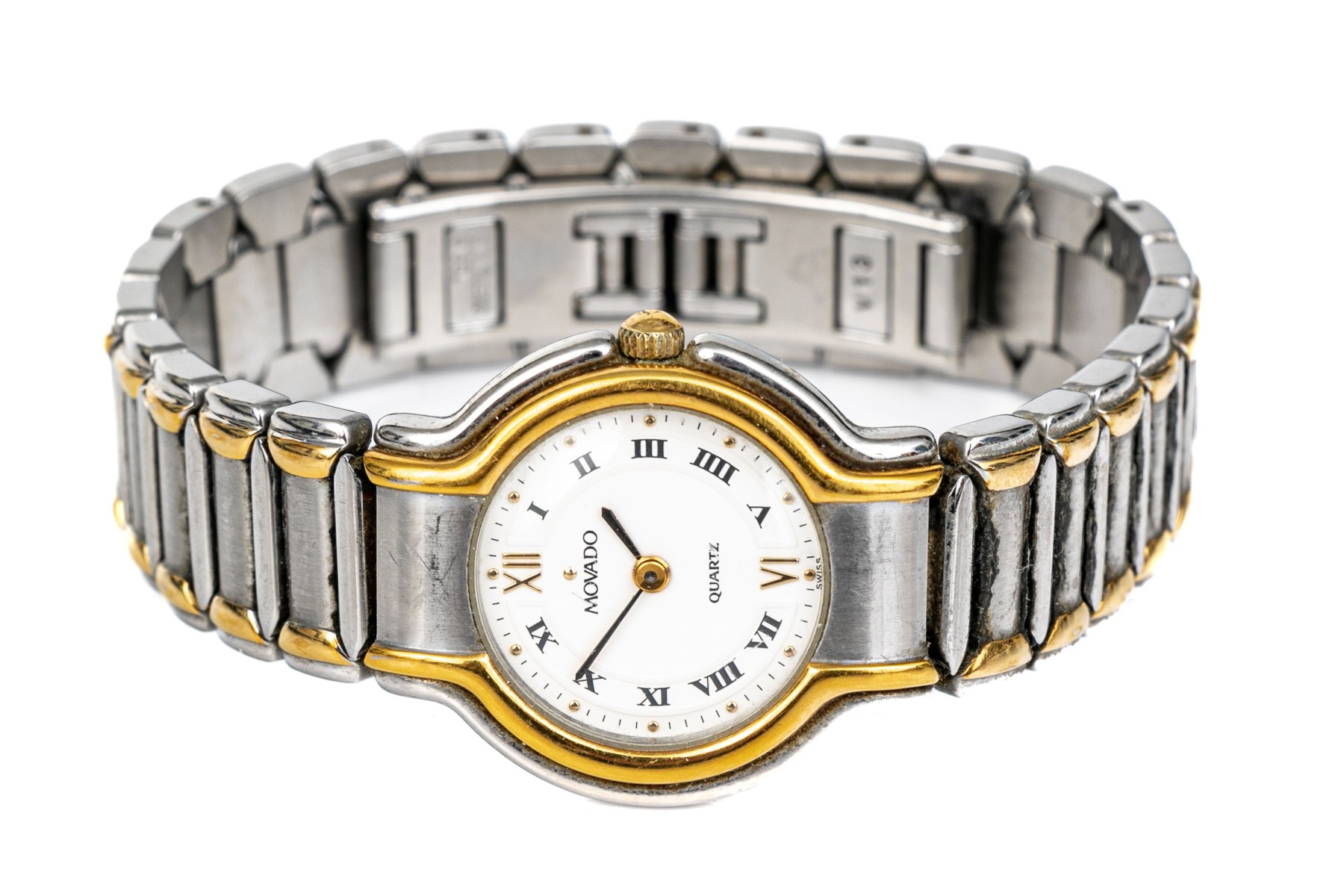 Movado small quartz two tone 26mm watch, white dial black Roman, bracelet