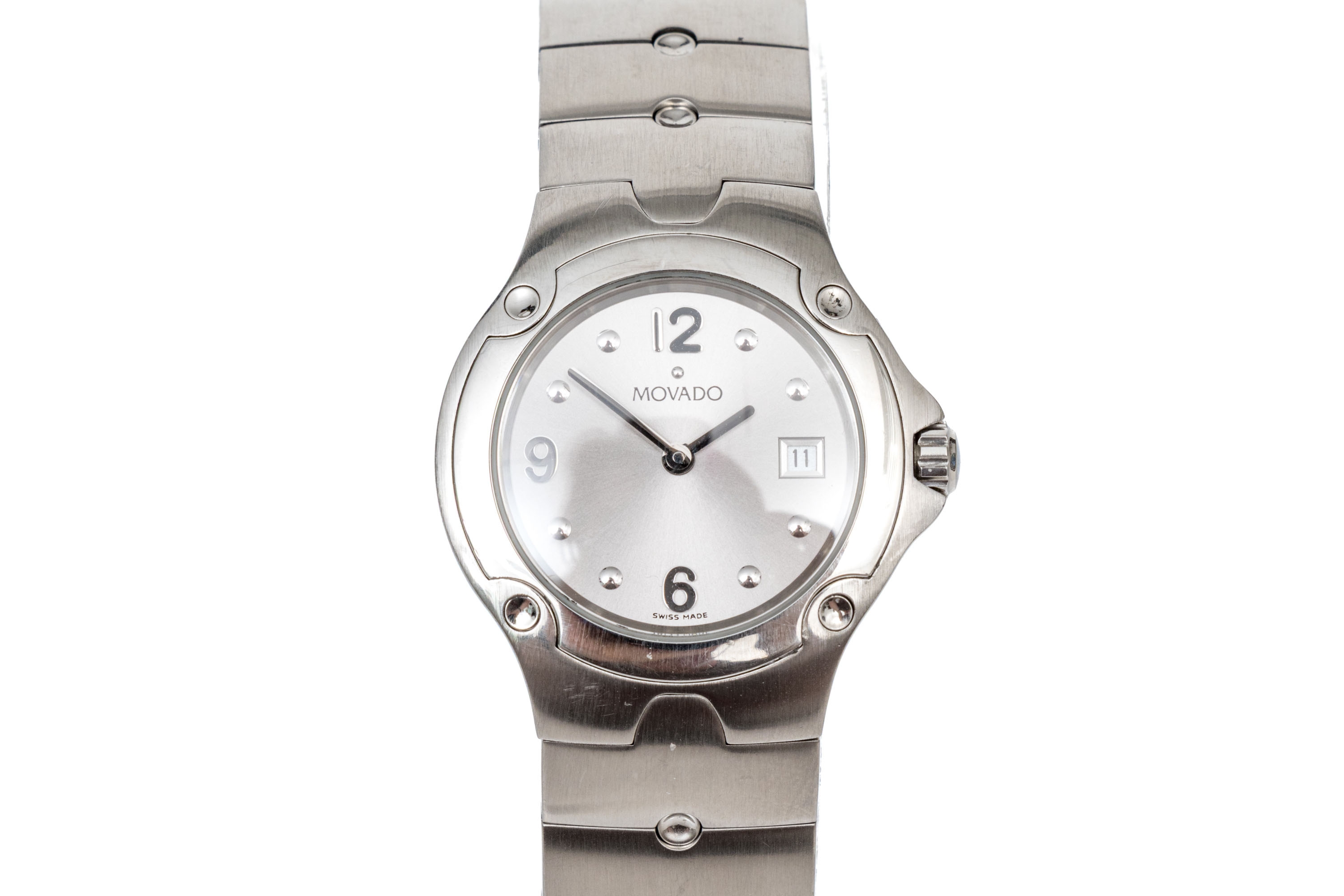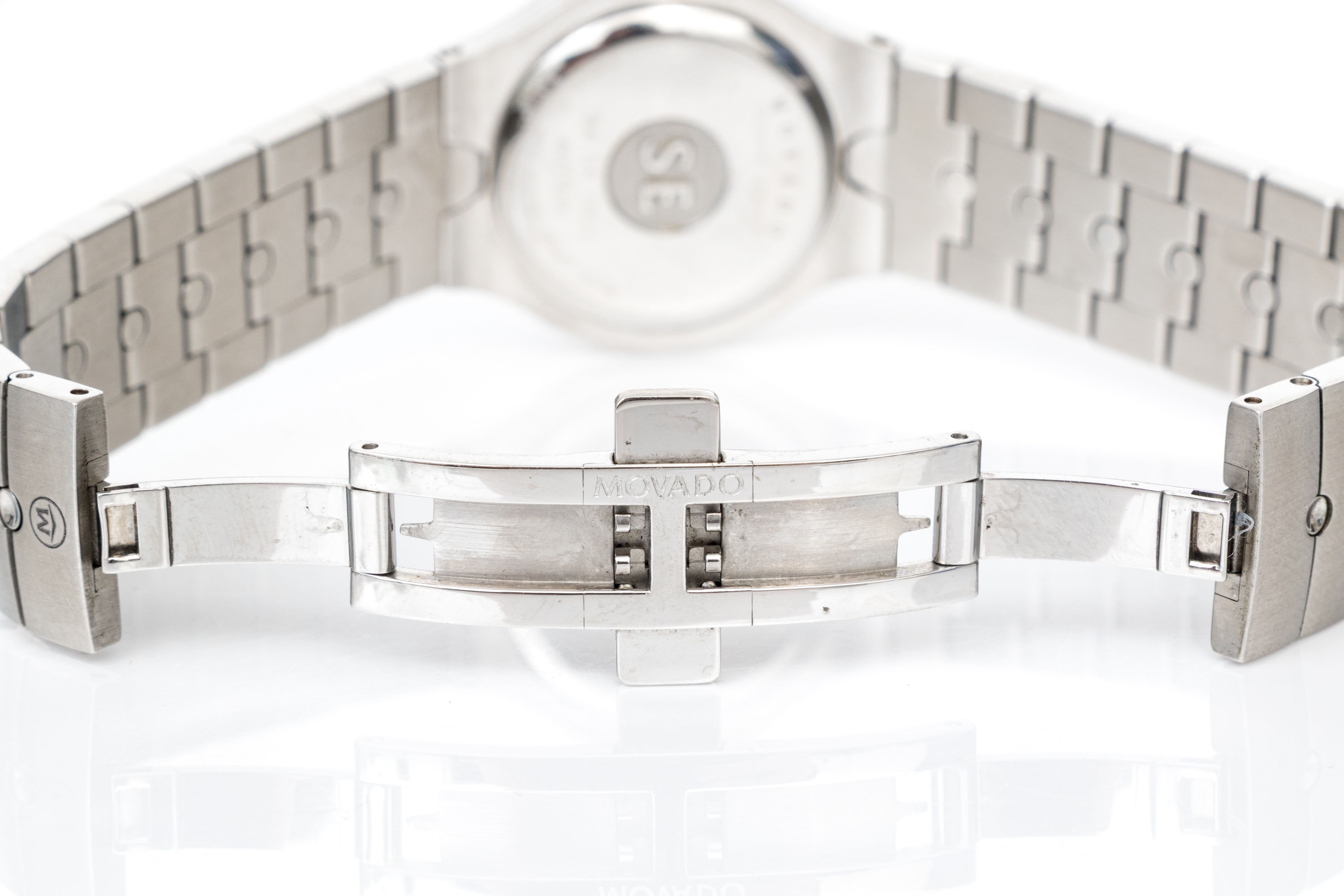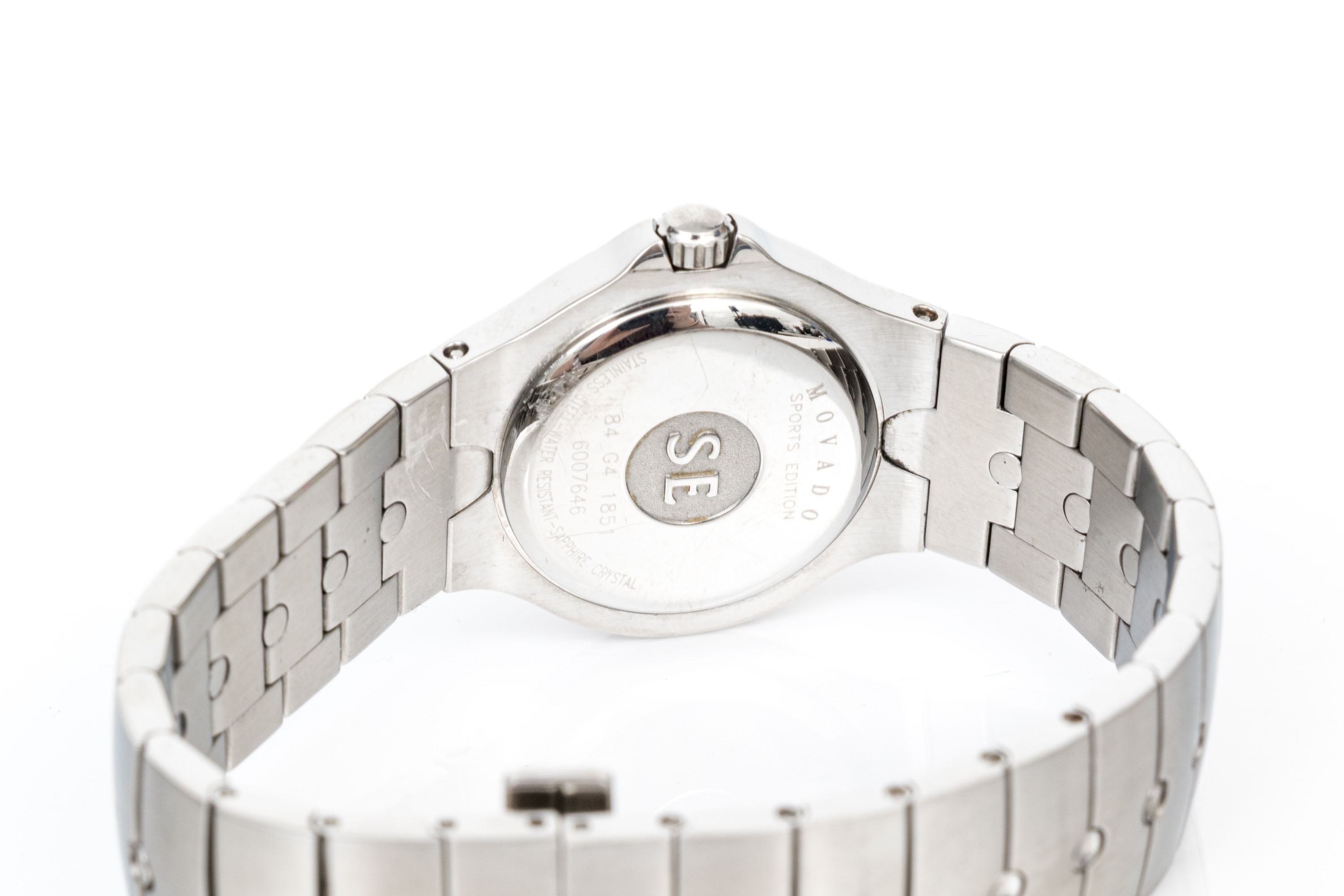Movado stainless steel 27mm Sport Edition quartz bracelet watch, silver dial