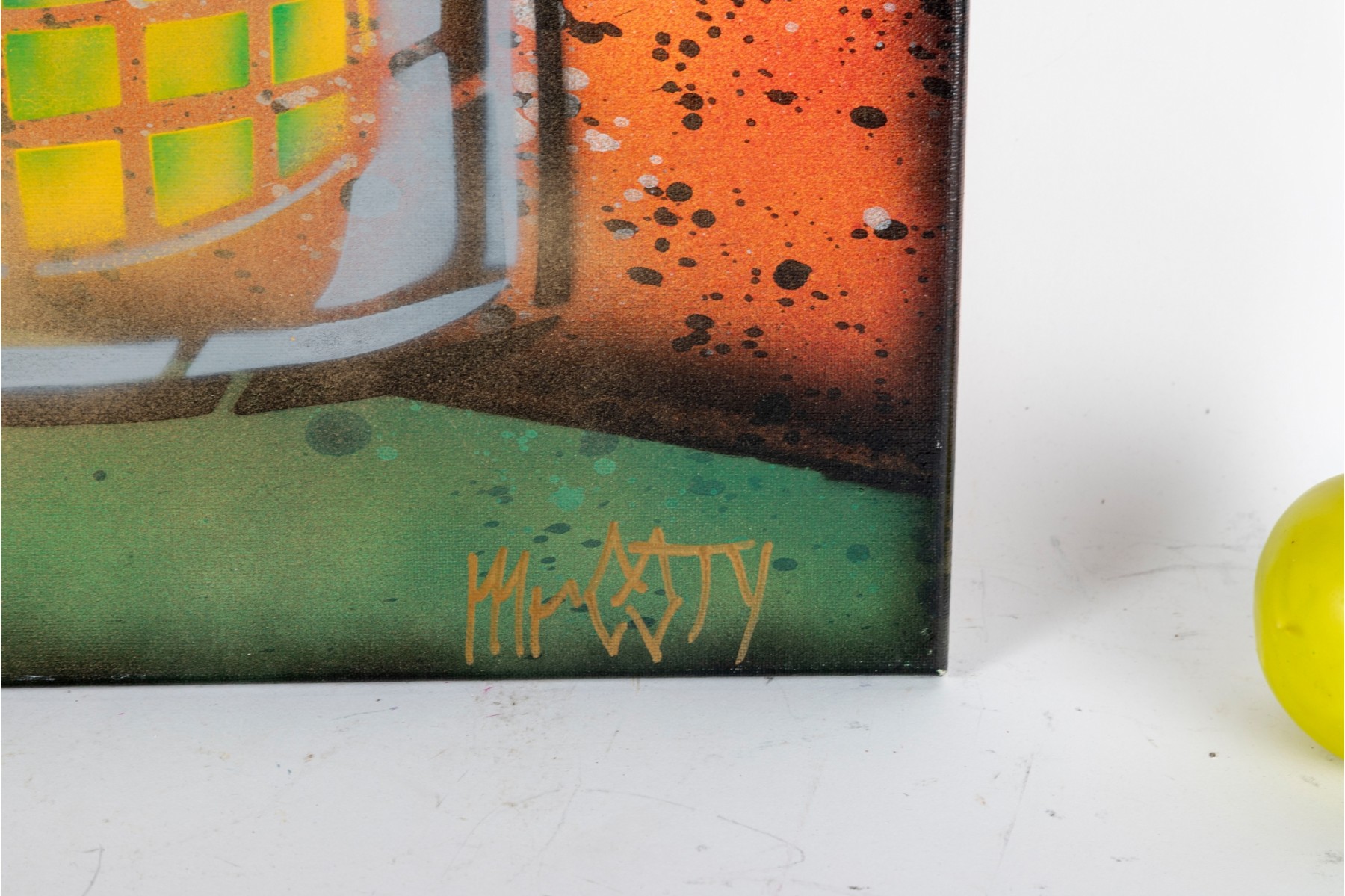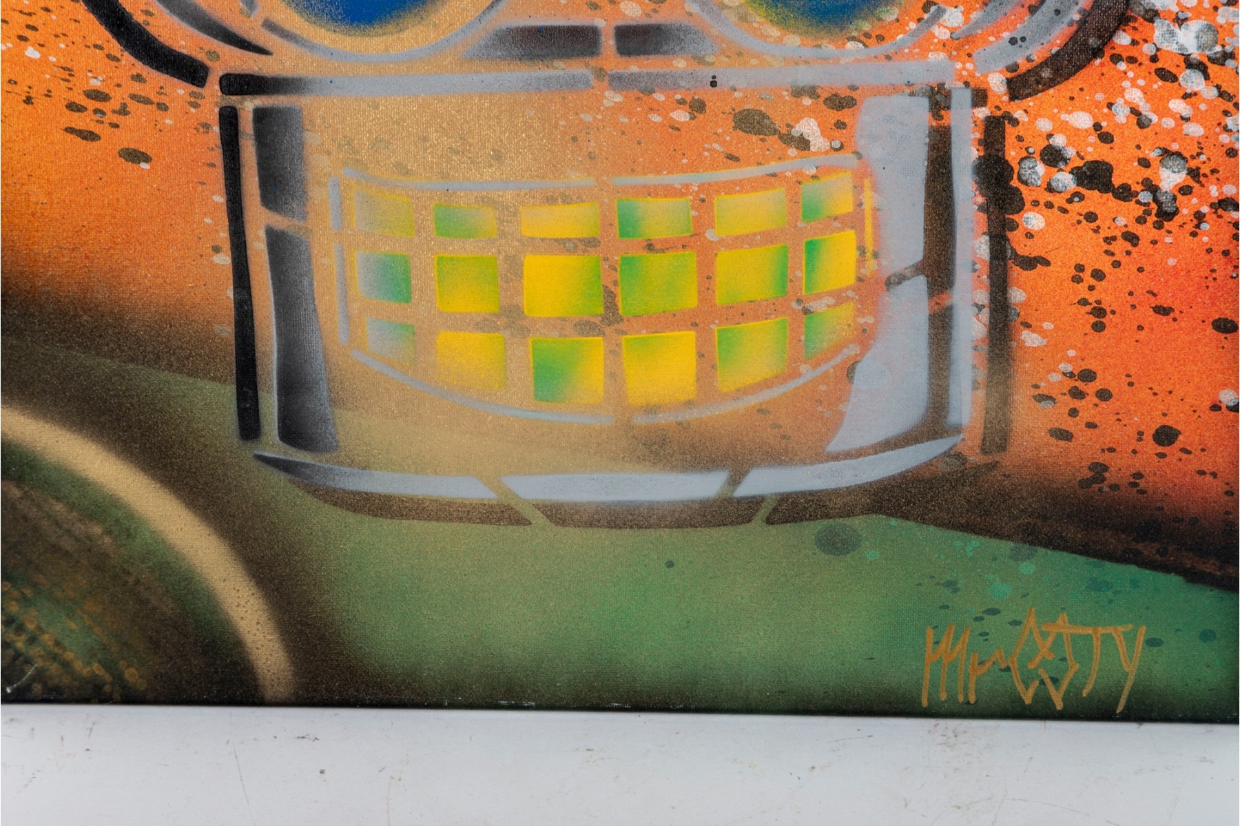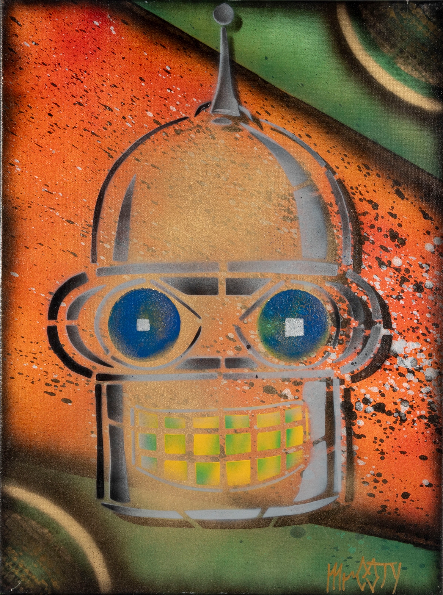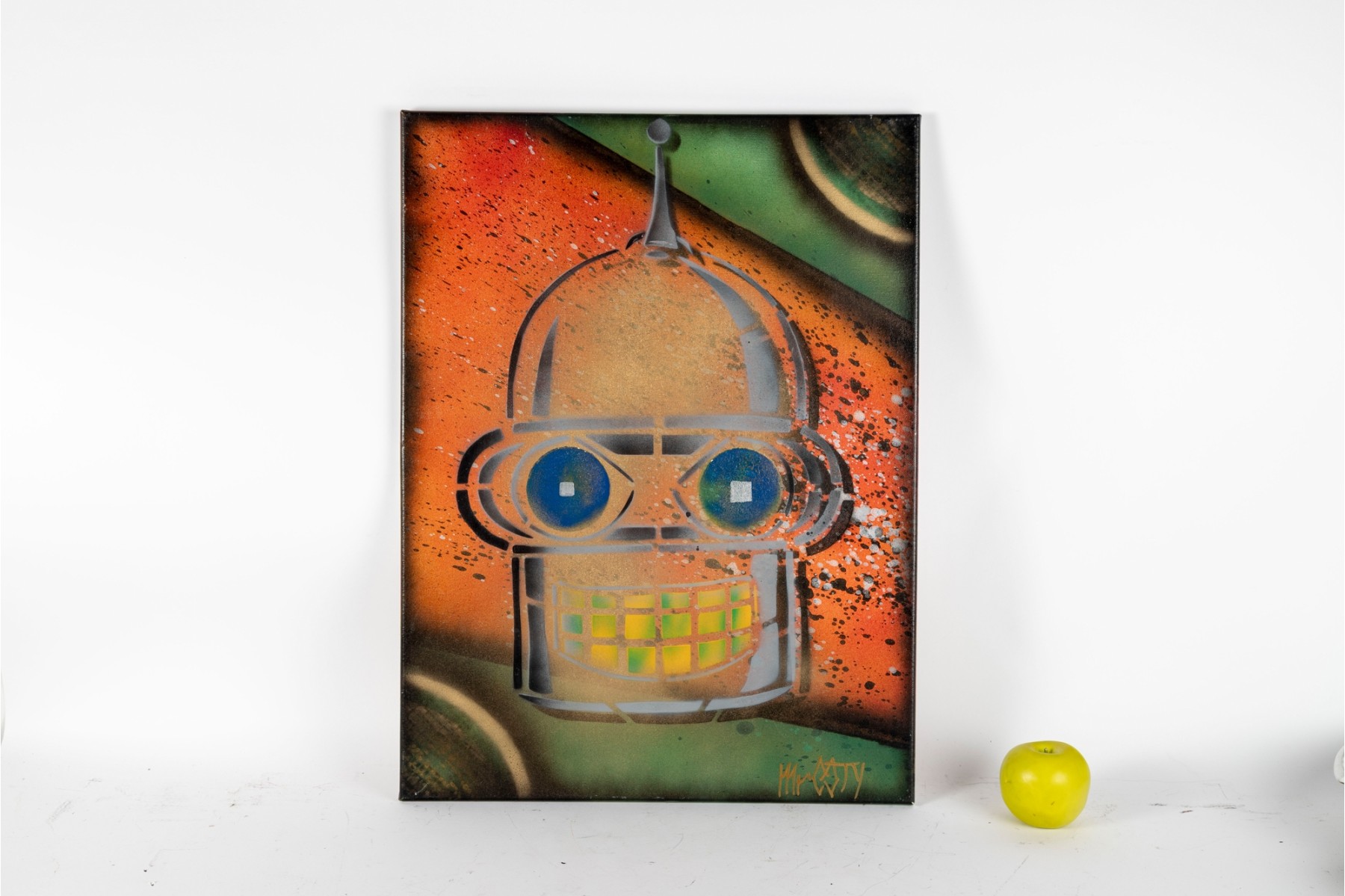 Vibrant rattlecan artwork on canvas by MR. COTY, featuring the iconic Futurama character Bender in bold stencil style with dynamic colors and splatter effects. Unframed.
