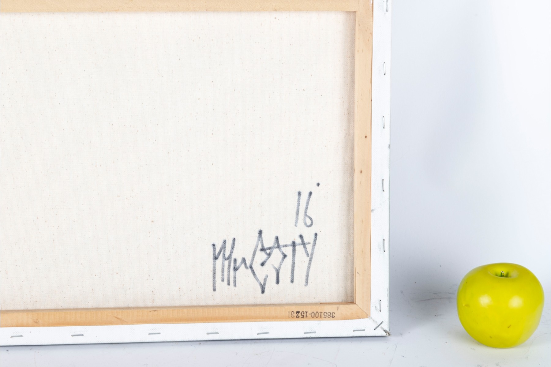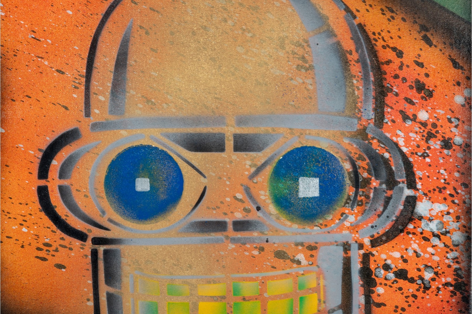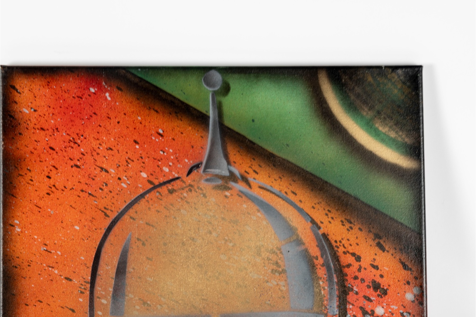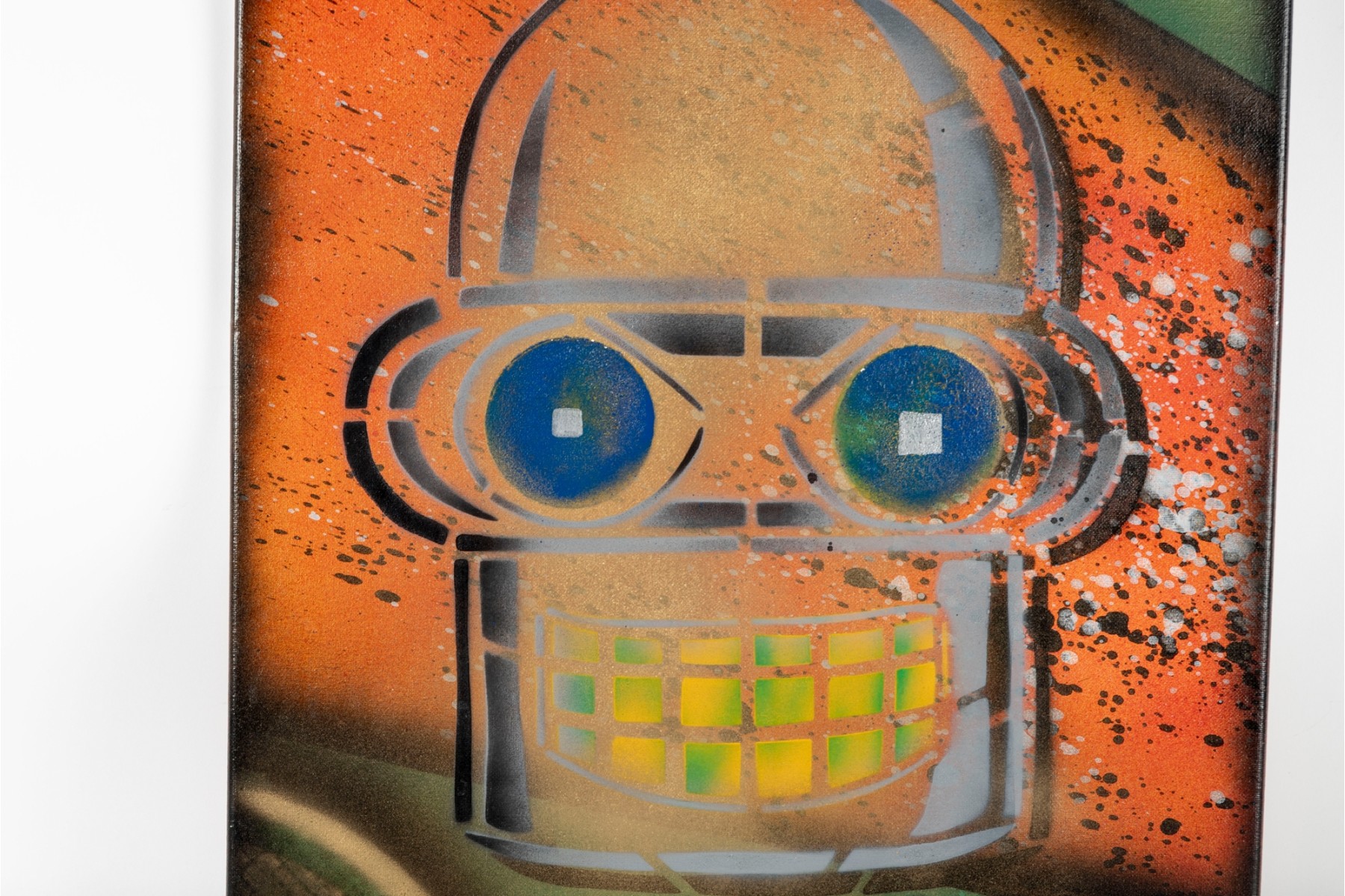 Vibrant rattlecan artwork on canvas by MR. COTY, featuring the iconic Futurama character Bender in bold stencil style with dynamic colors and splatter effects. Unframed.
