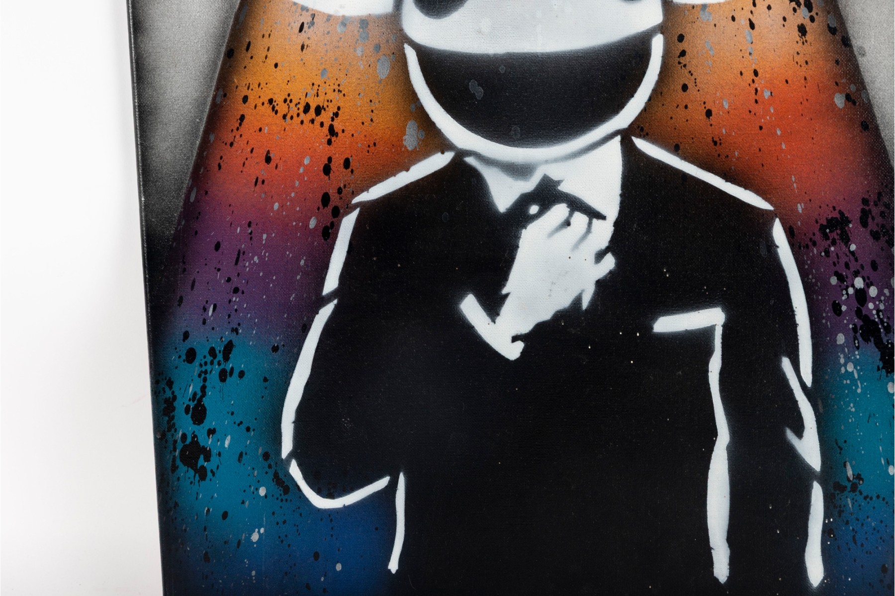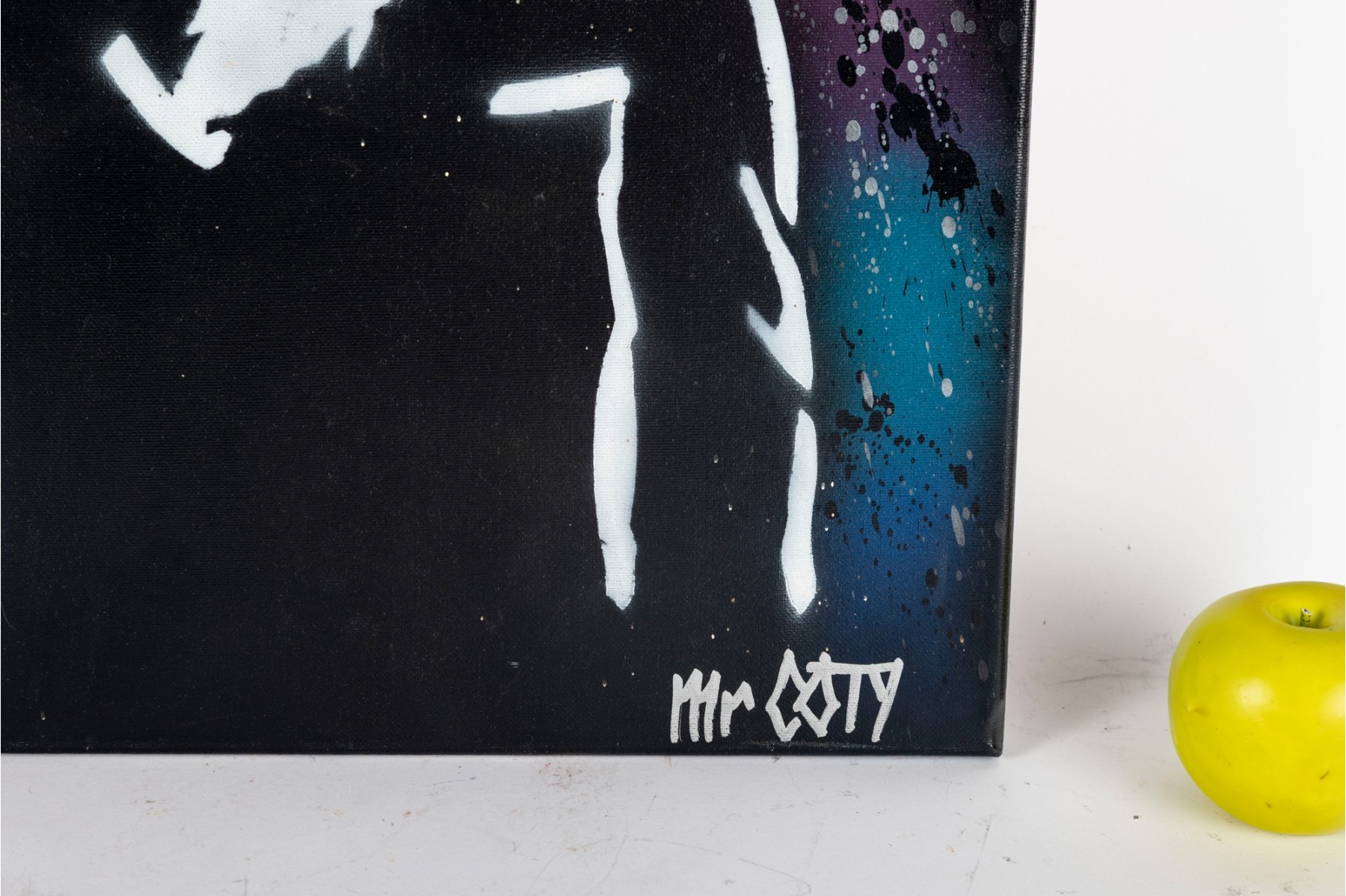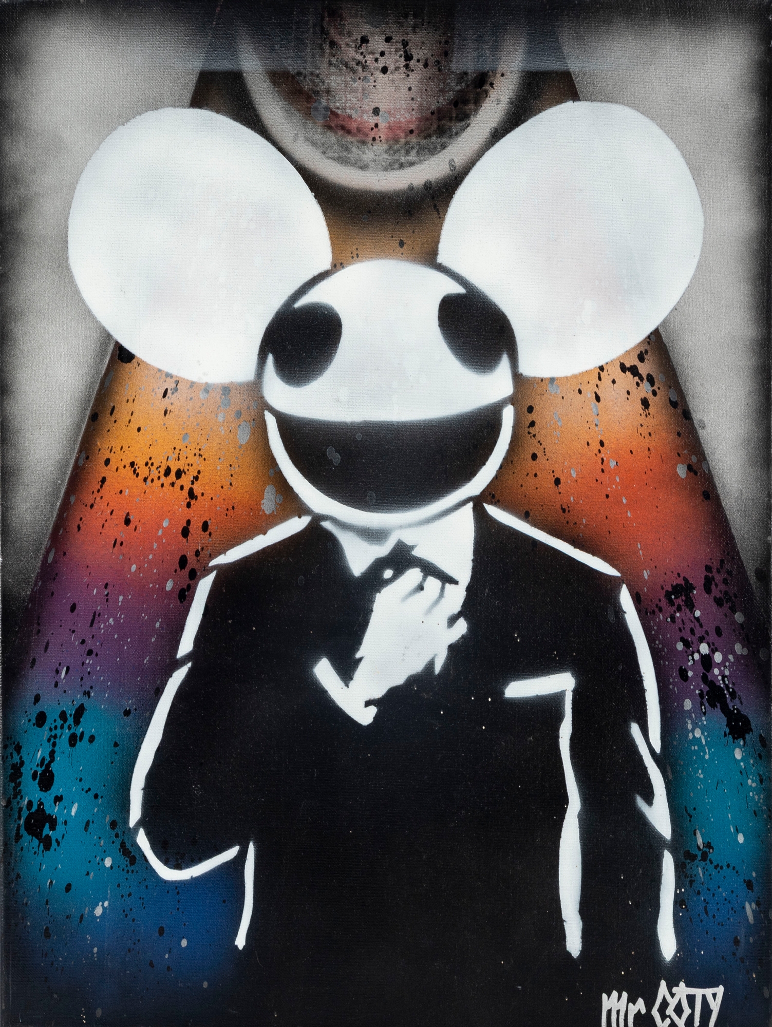 A bold street-art style spray paint piece signed by "MR. COTY", depicting the iconic Deadmou5 helmet atop a suited figure.