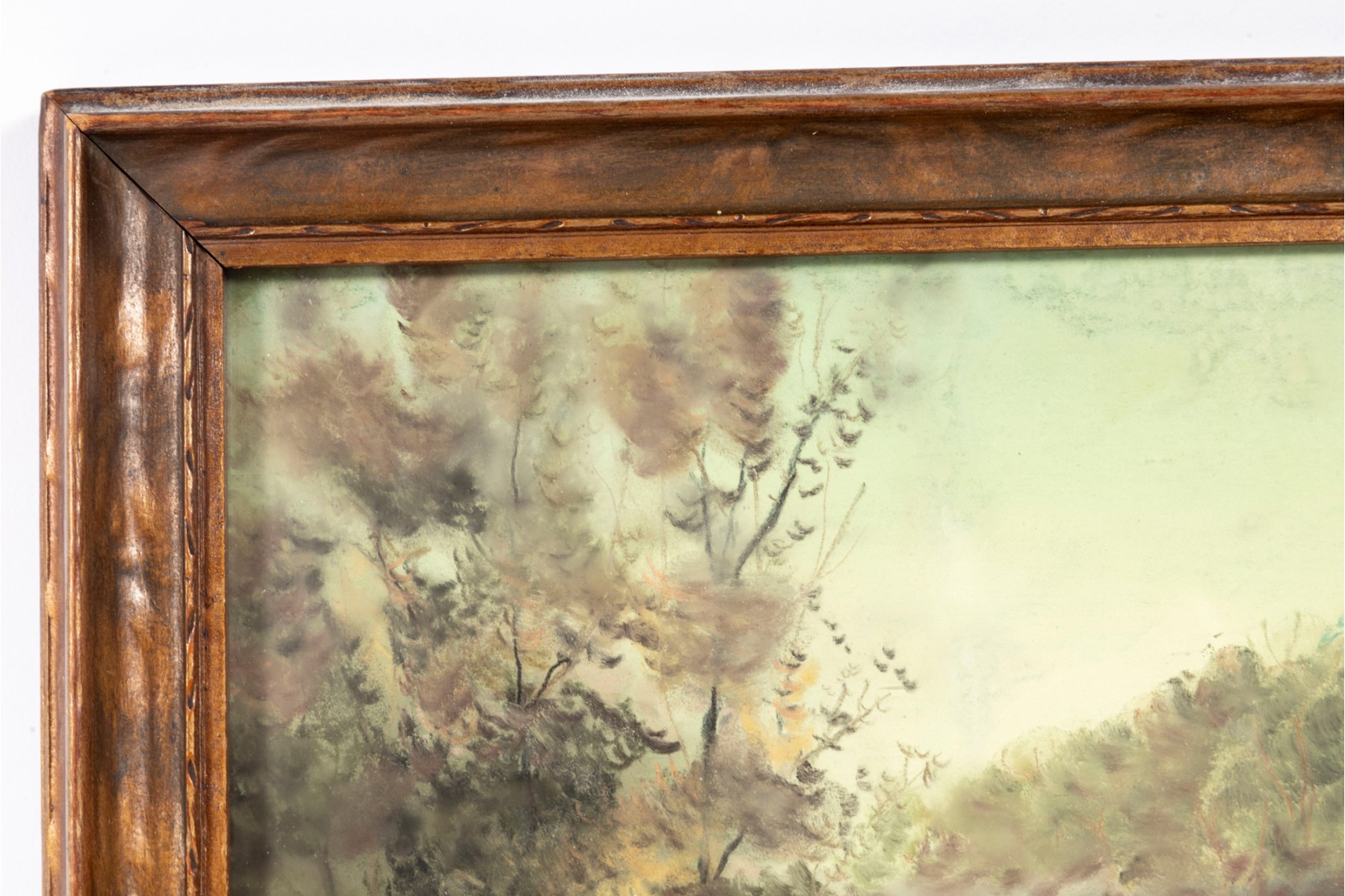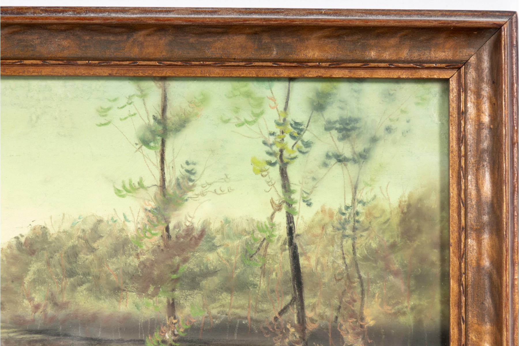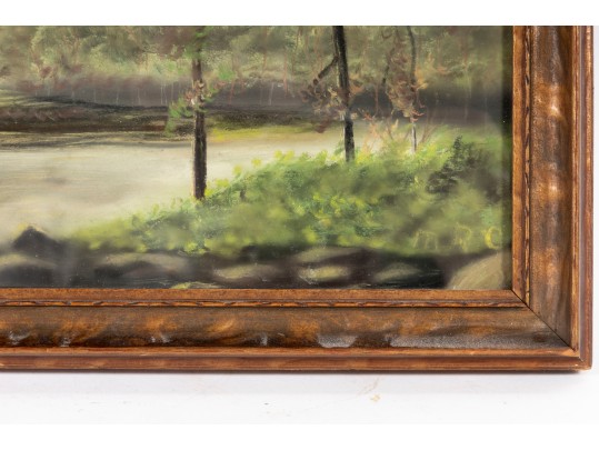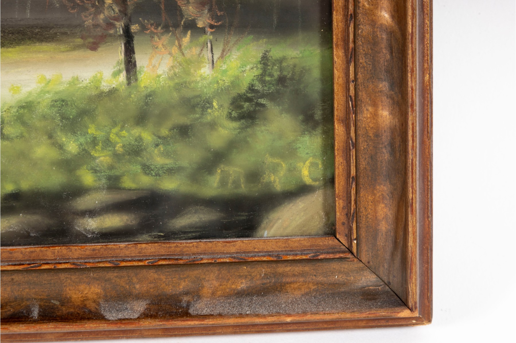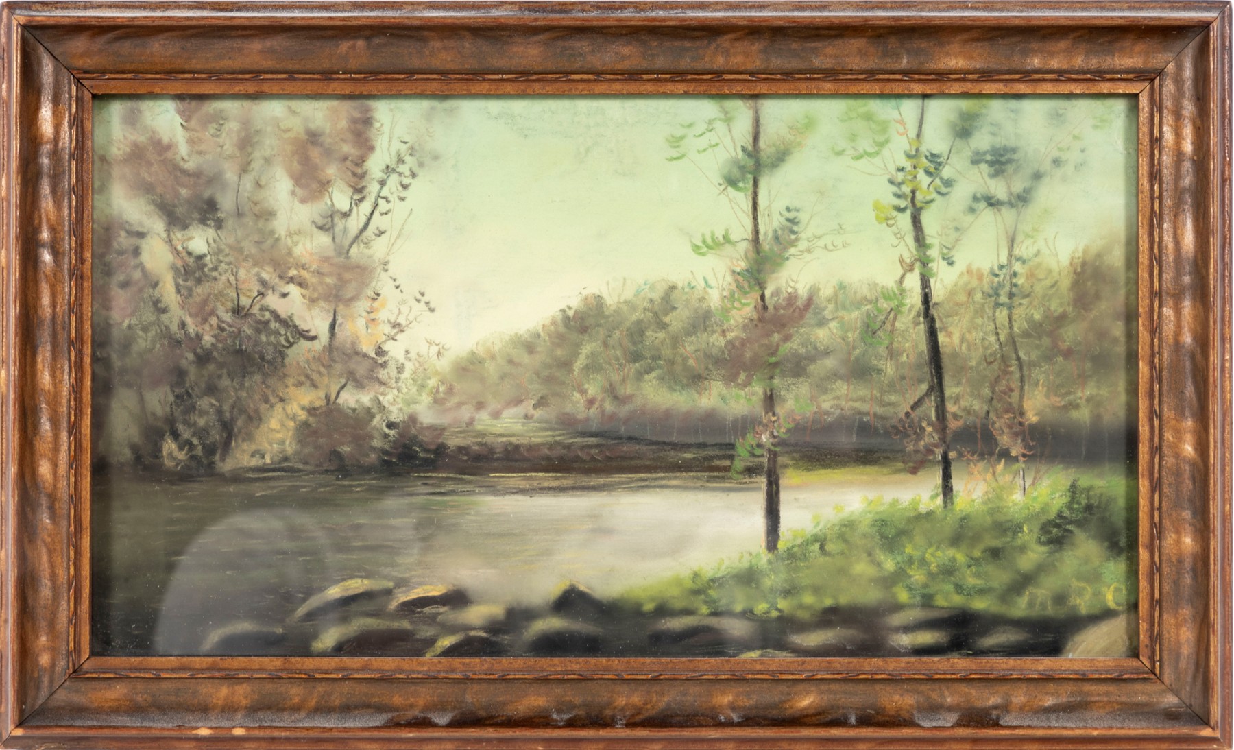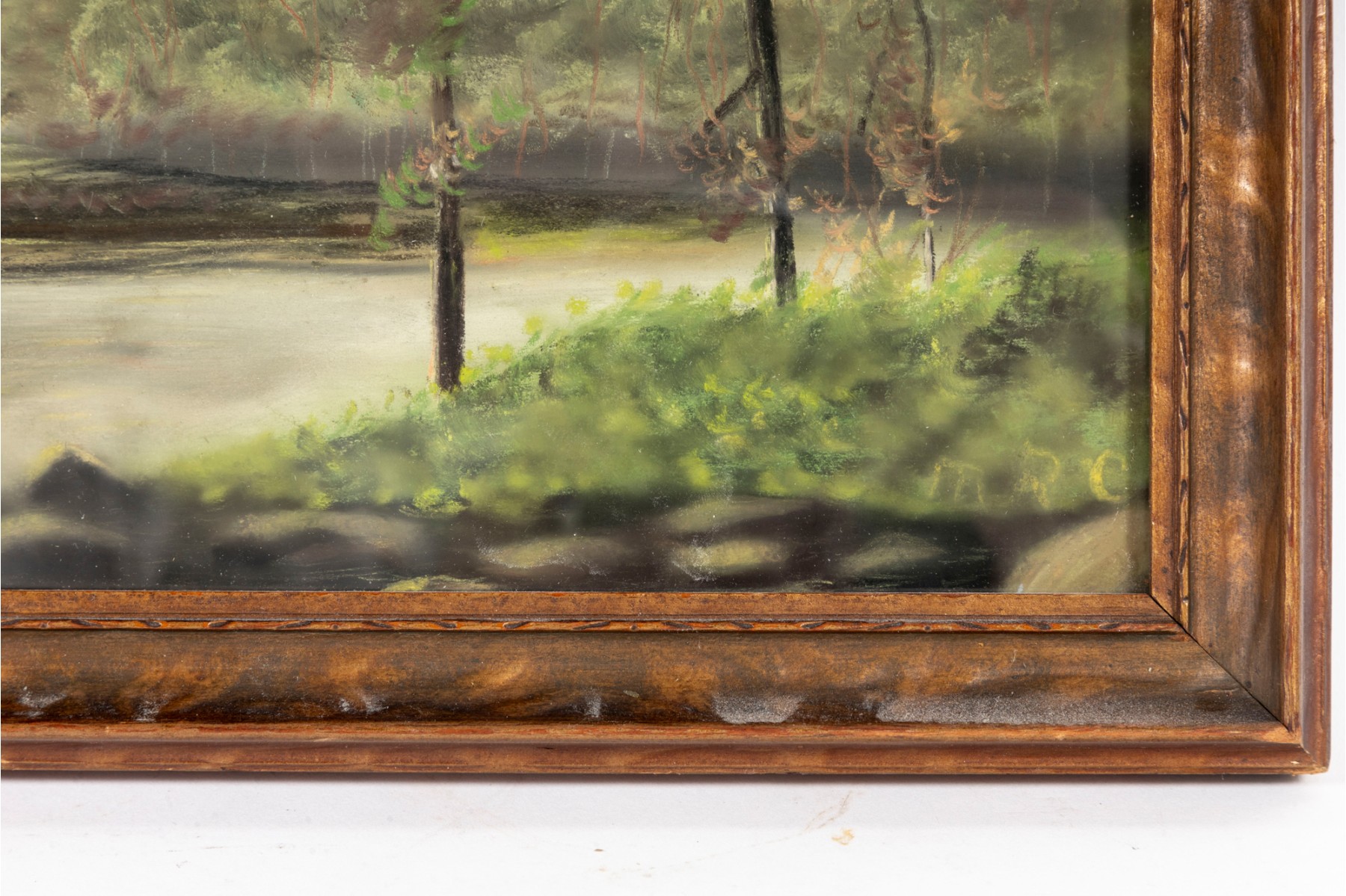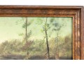 A small oil landscape painting indistinctly marked "MRC" -- unknown, unttiled and presented within a simple wood frame faced with glass.