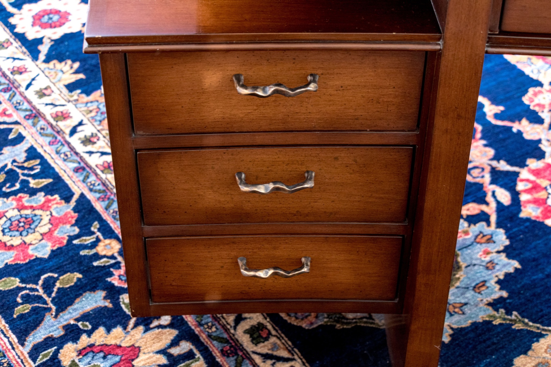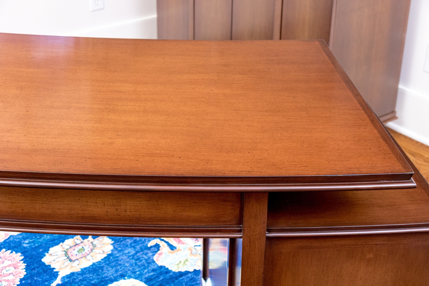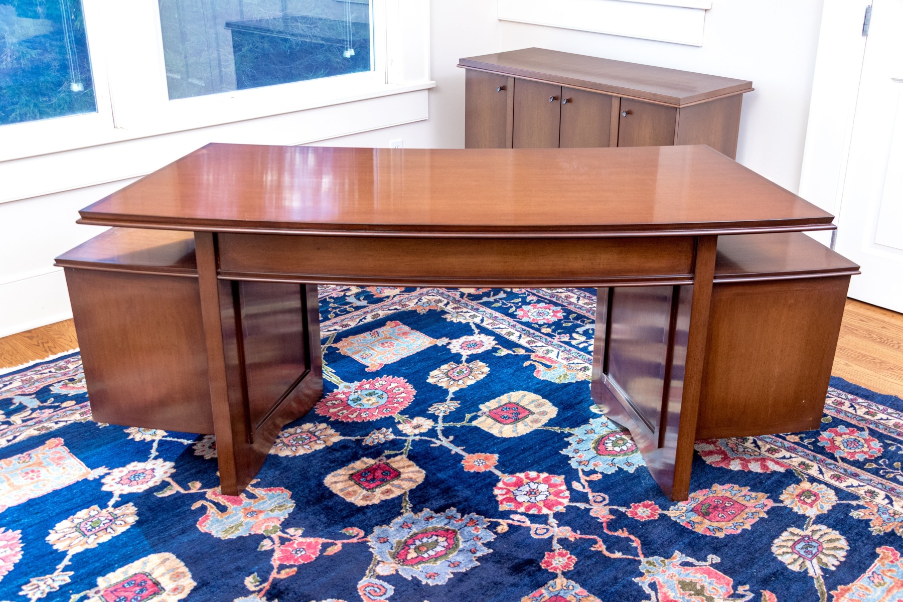 A handsome Nancy Corzine Fushion Desk in a rich, warm-toned medium brown cherry finish, showcasing a wide arching tabletop with a single long drawer raised on two paneled sleigh legs. The tabletop overextends to the sides, overhanging two floating cases with three drawers each adorned with organic form metal handles. The desk features an eye-catching design that still shines with understated elegance that combines tradition and contemporary flair flawlessly.