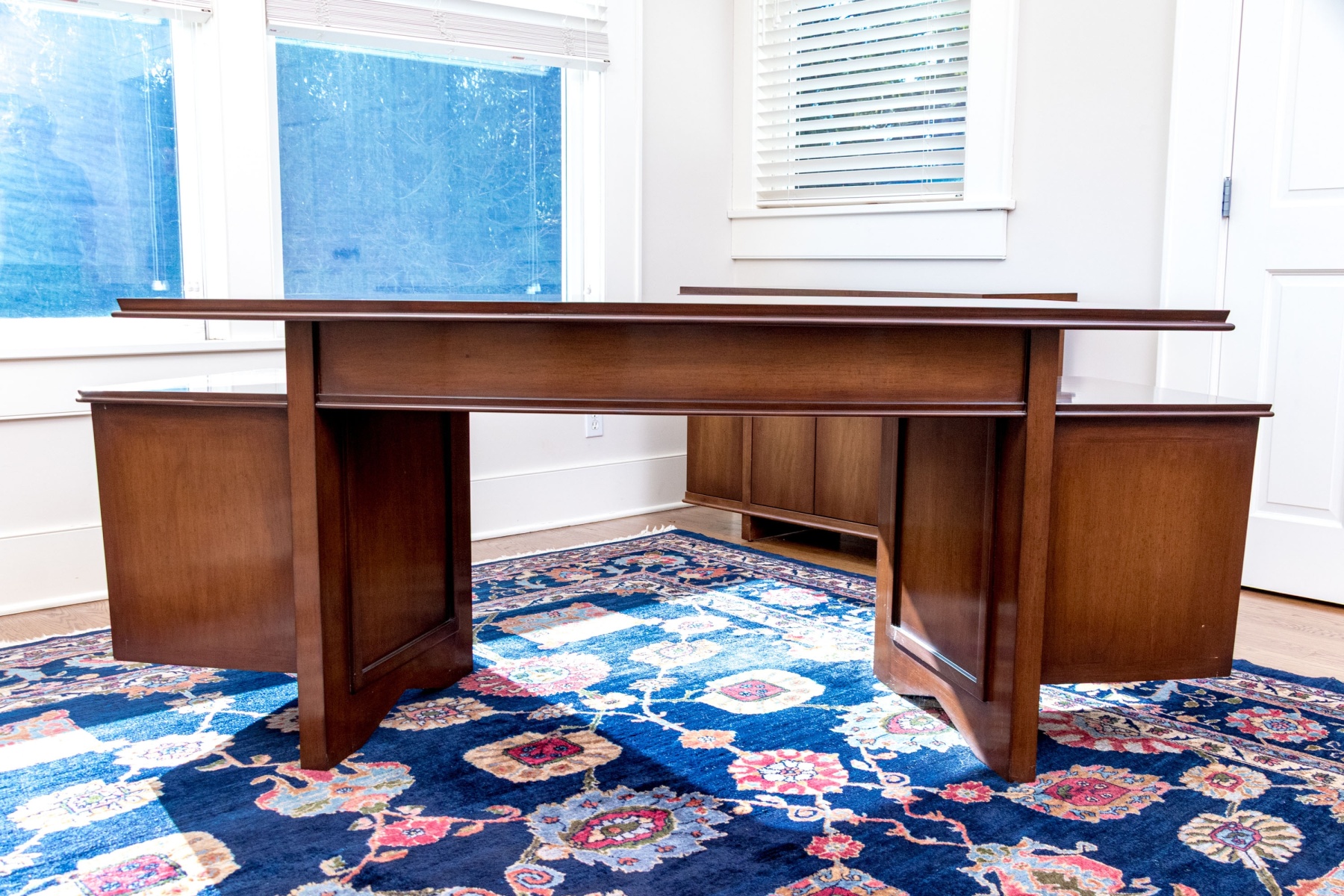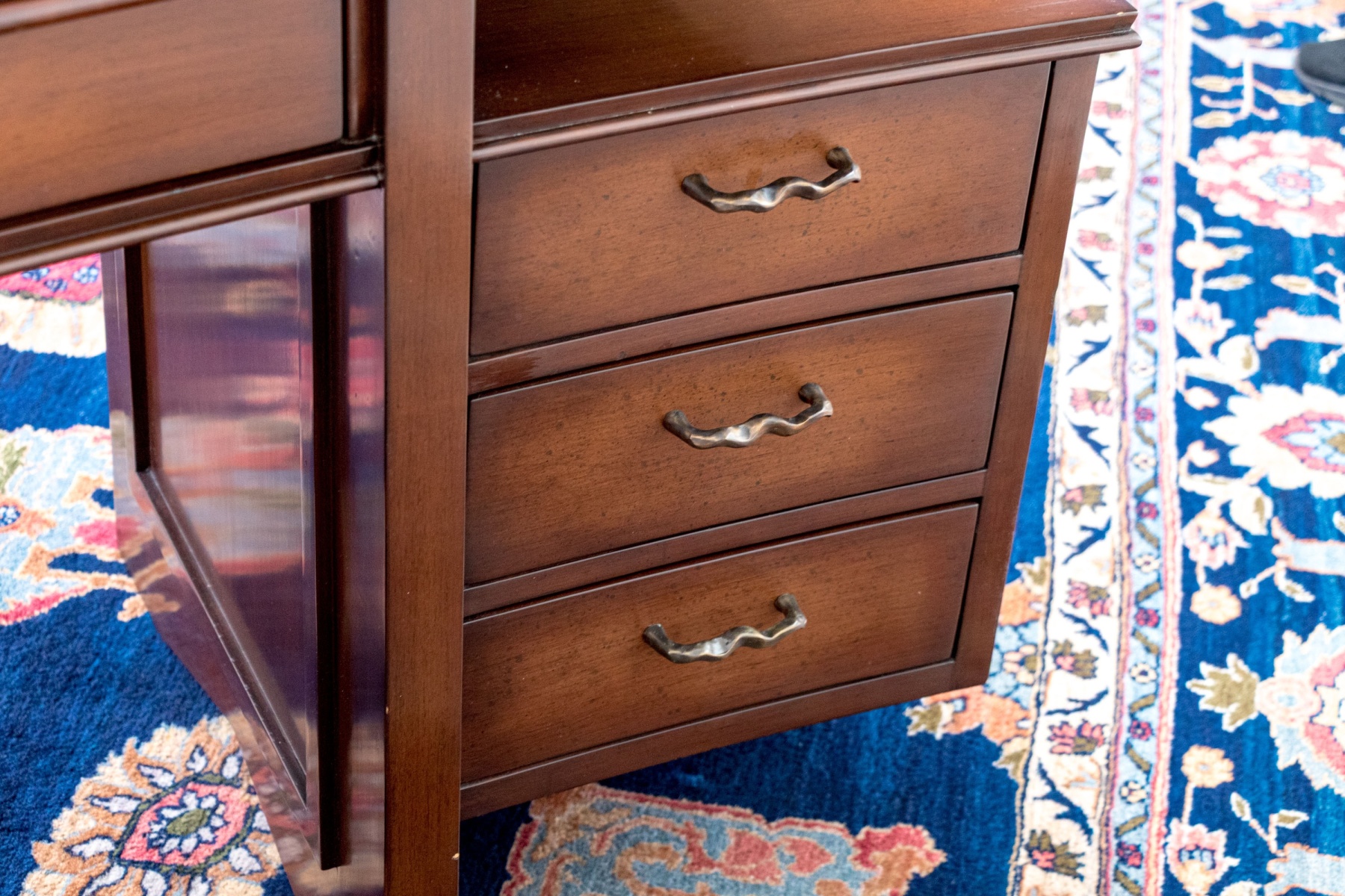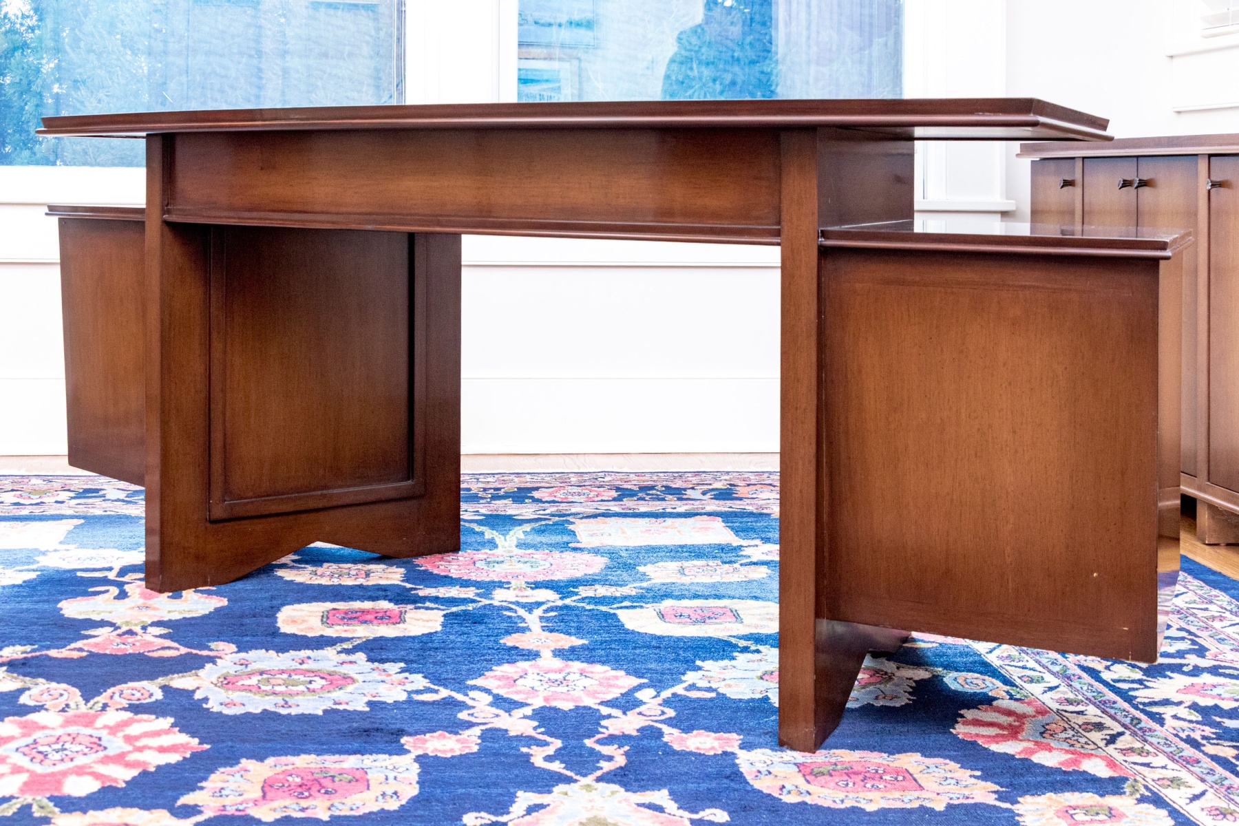 A handsome Nancy Corzine Fushion Desk in a rich, warm-toned medium brown cherry finish, showcasing a wide arching tabletop with a single long drawer raised on two paneled sleigh legs. The tabletop overextends to the sides, overhanging two floating cases with three drawers each adorned with organic form metal handles. The desk features an eye-catching design that still shines with understated elegance that combines tradition and contemporary flair flawlessly.