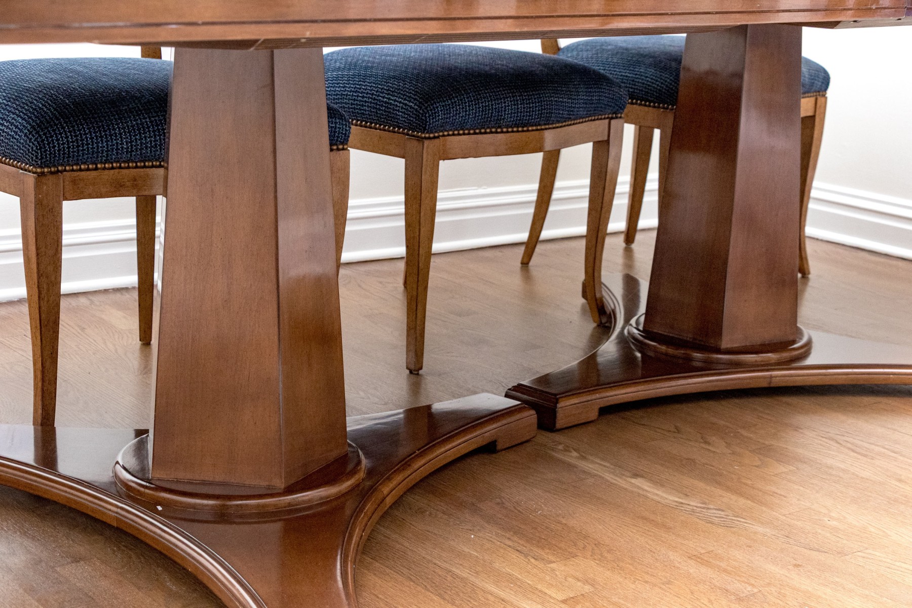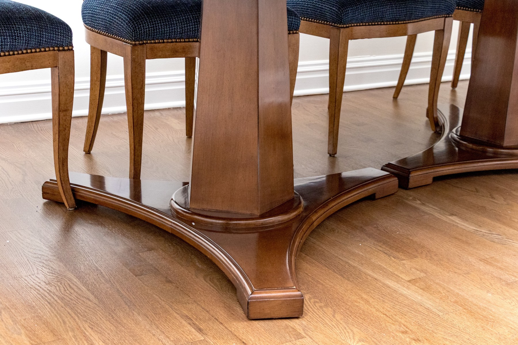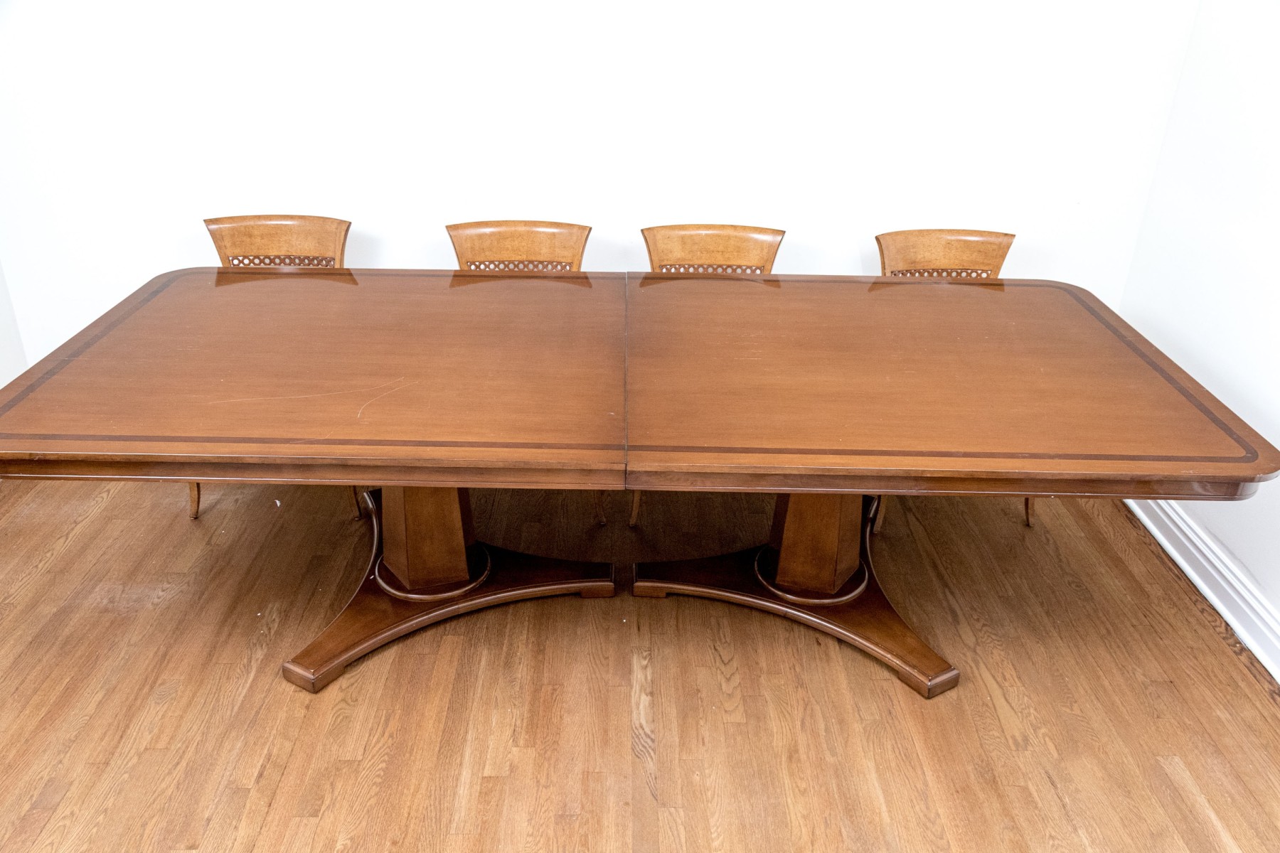 The stunning twin pedestal dining table stands on twin pedestal supports, which have footed trefoil form bases with tapered rectangular pedestals. The large table has the ability to extend but no leaves are present. The table top with rounded legs.