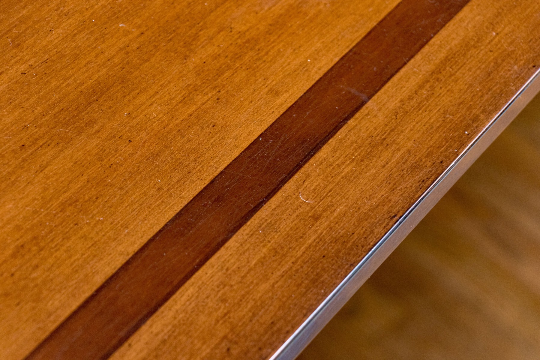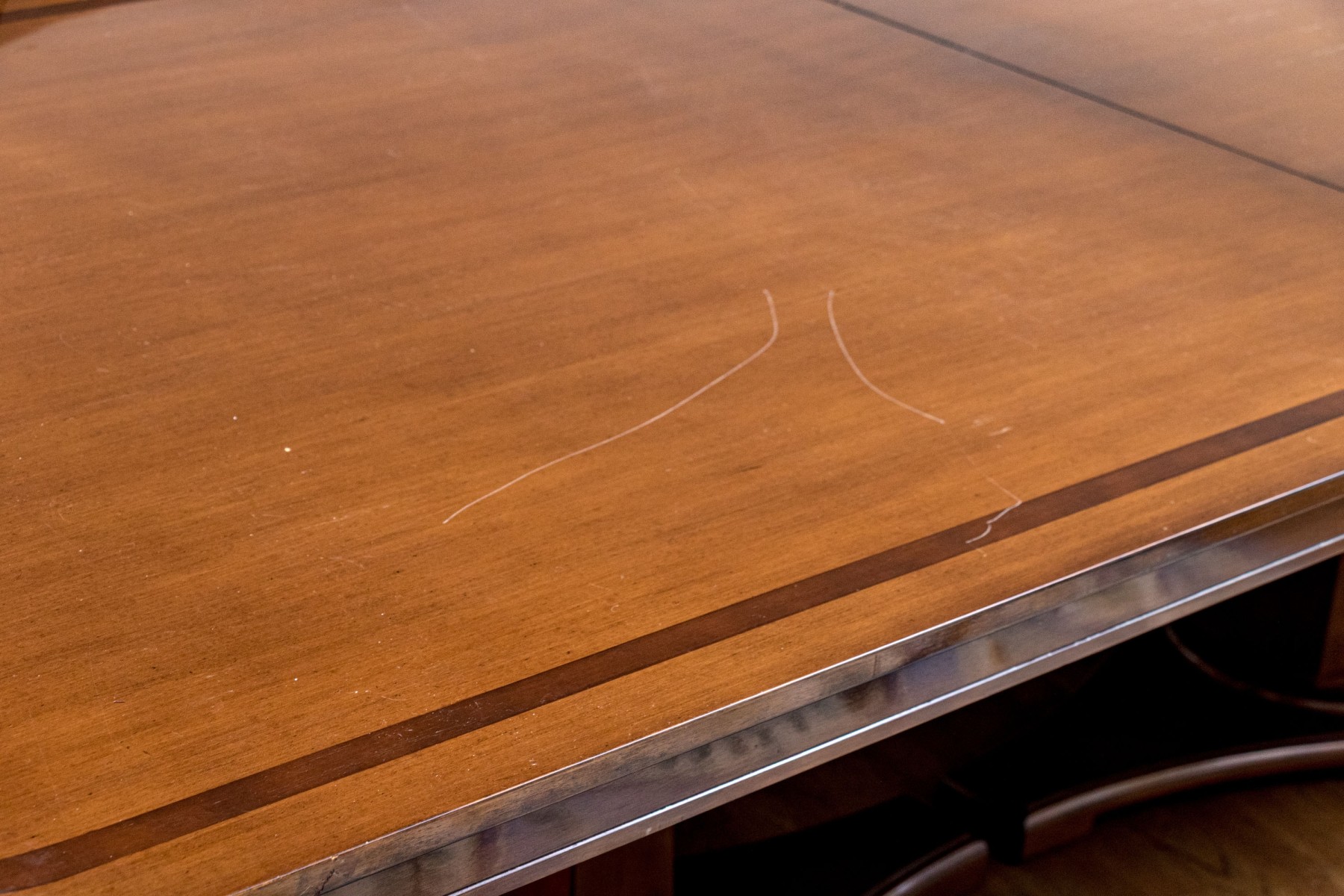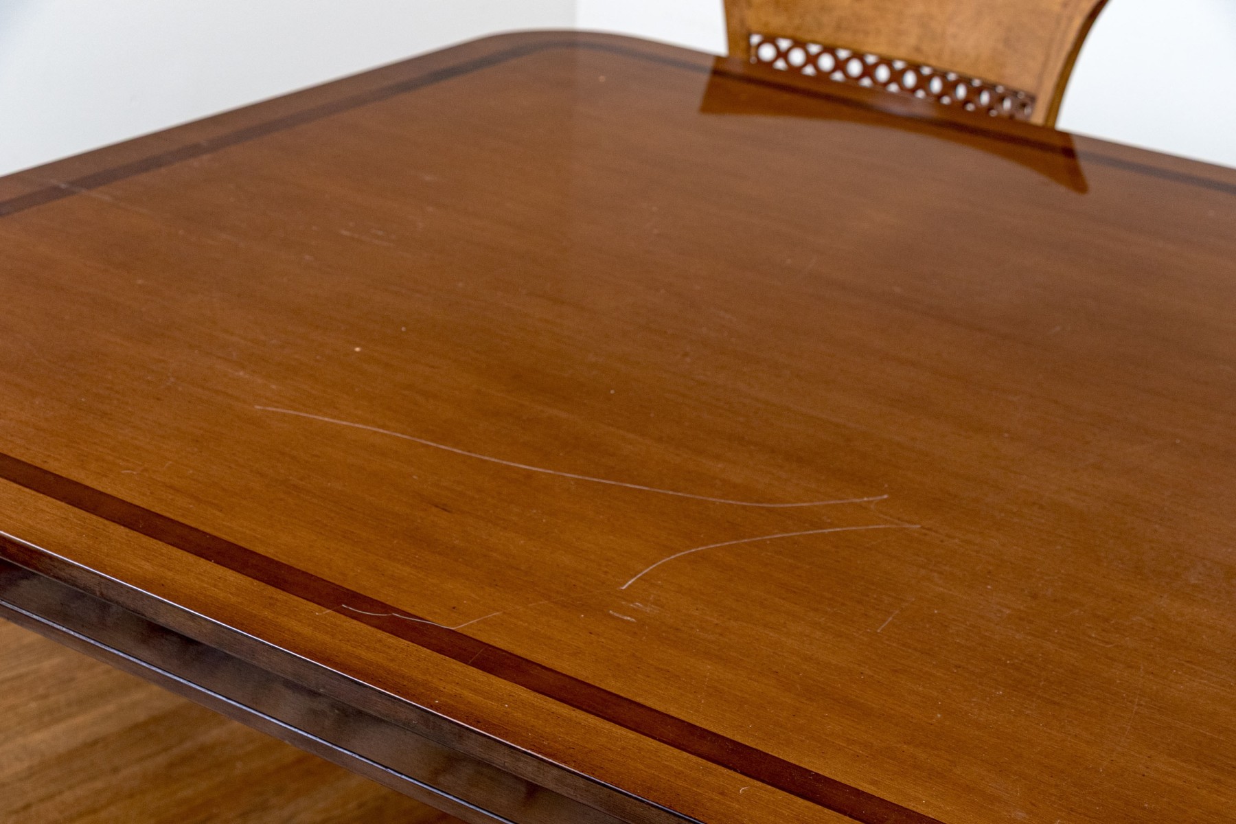 The table can be extended but no leaves are present with the table. Despite no extra expansion leaves the table is quite long as it is. There are some surface scratches to the table top with a small chip to the finish and slight indent. Despite wear the table is of high quality and presents well.