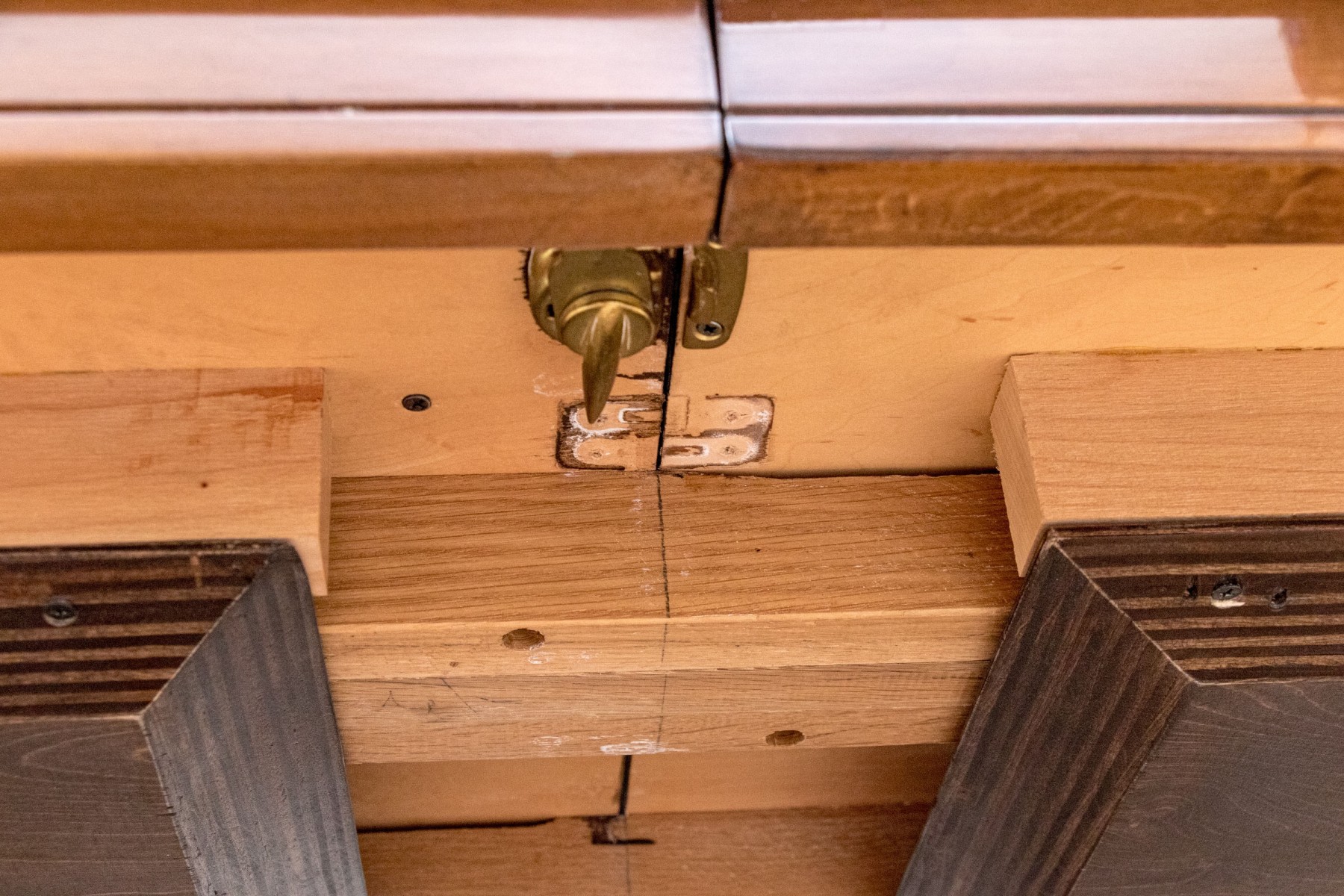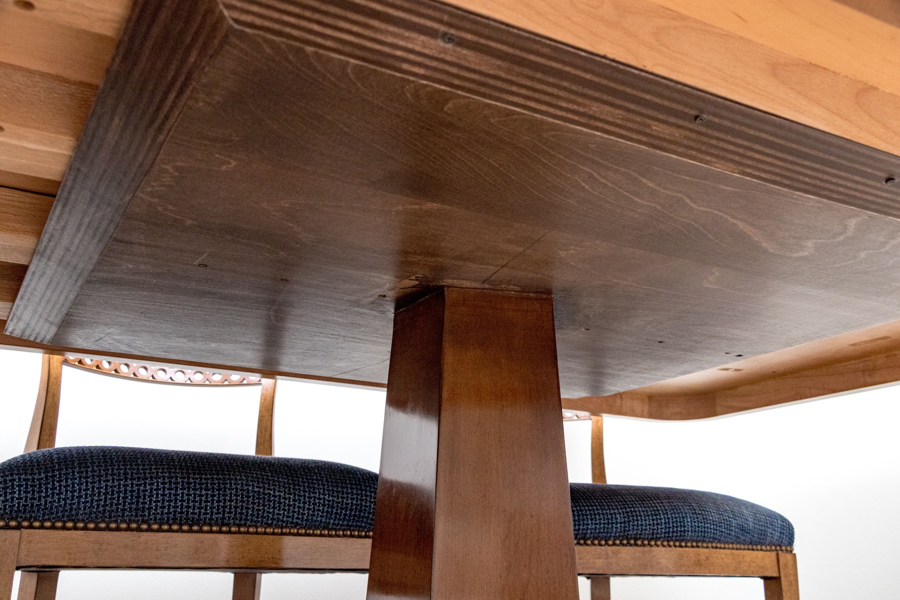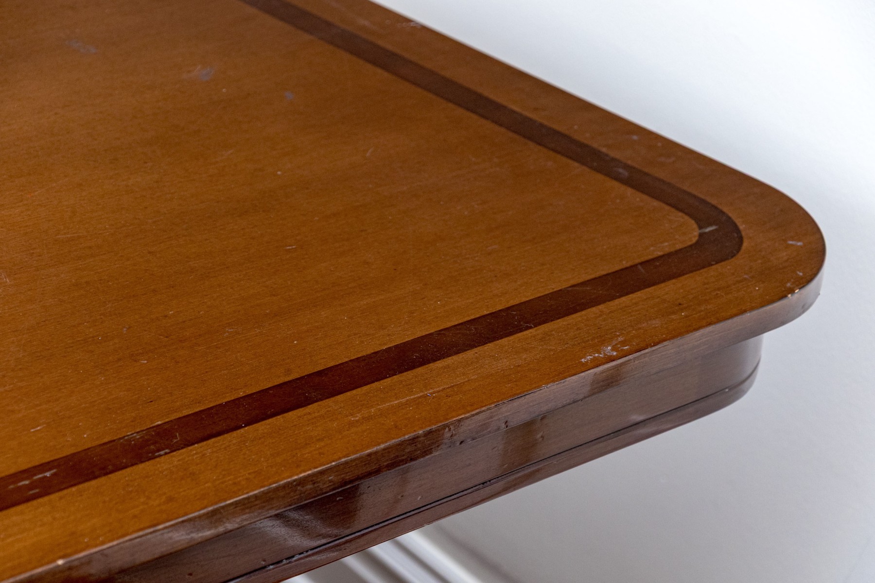 The table can be extended but no leaves are present with the table. Despite no extra expansion leaves the table is quite long as it is. There are some surface scratches to the table top with a small chip to the finish and slight indent. Despite wear the table is of high quality and presents well.