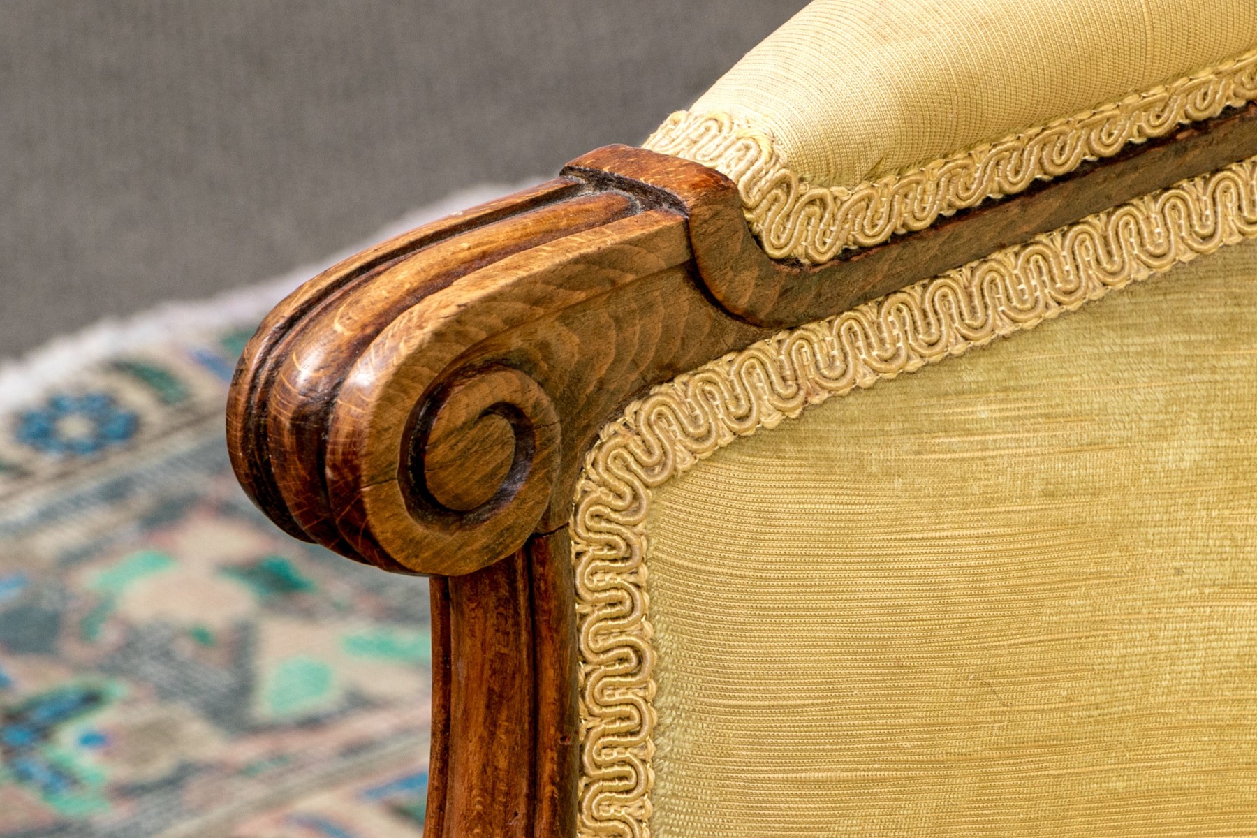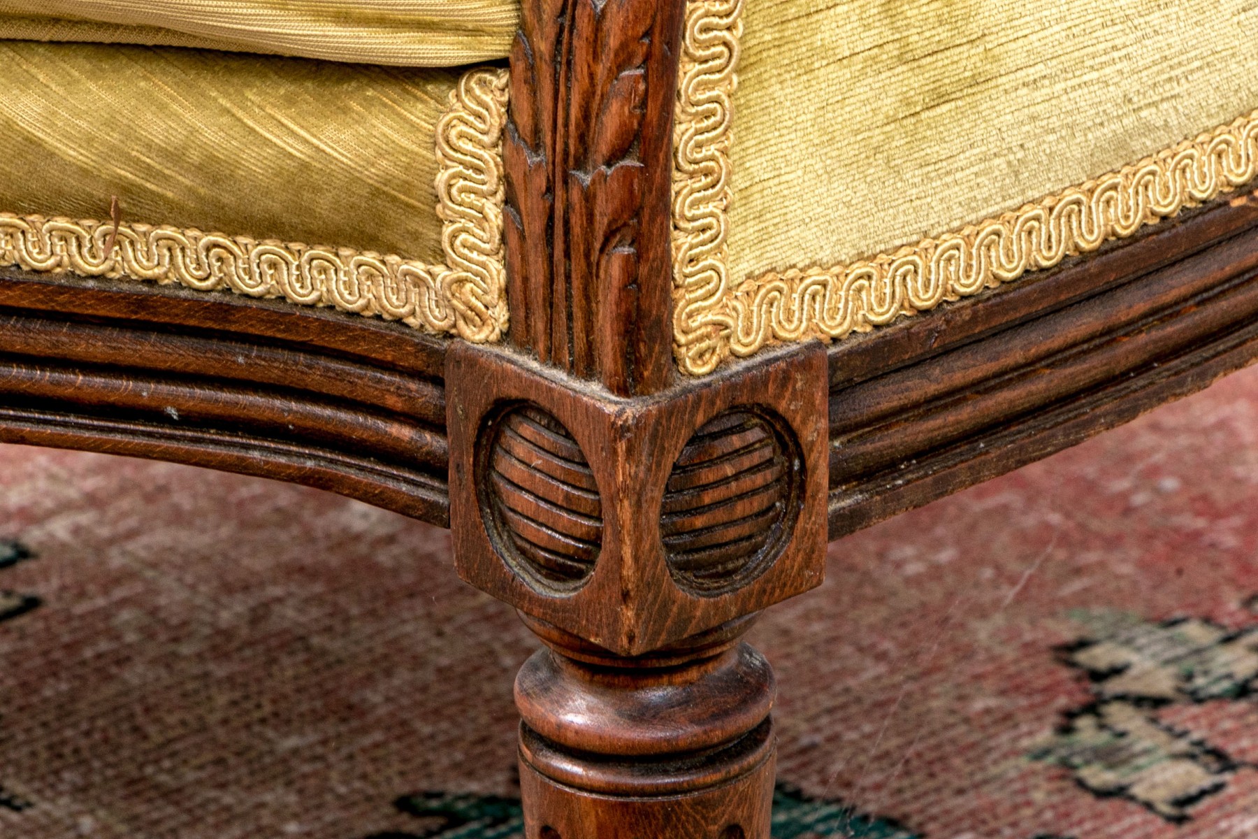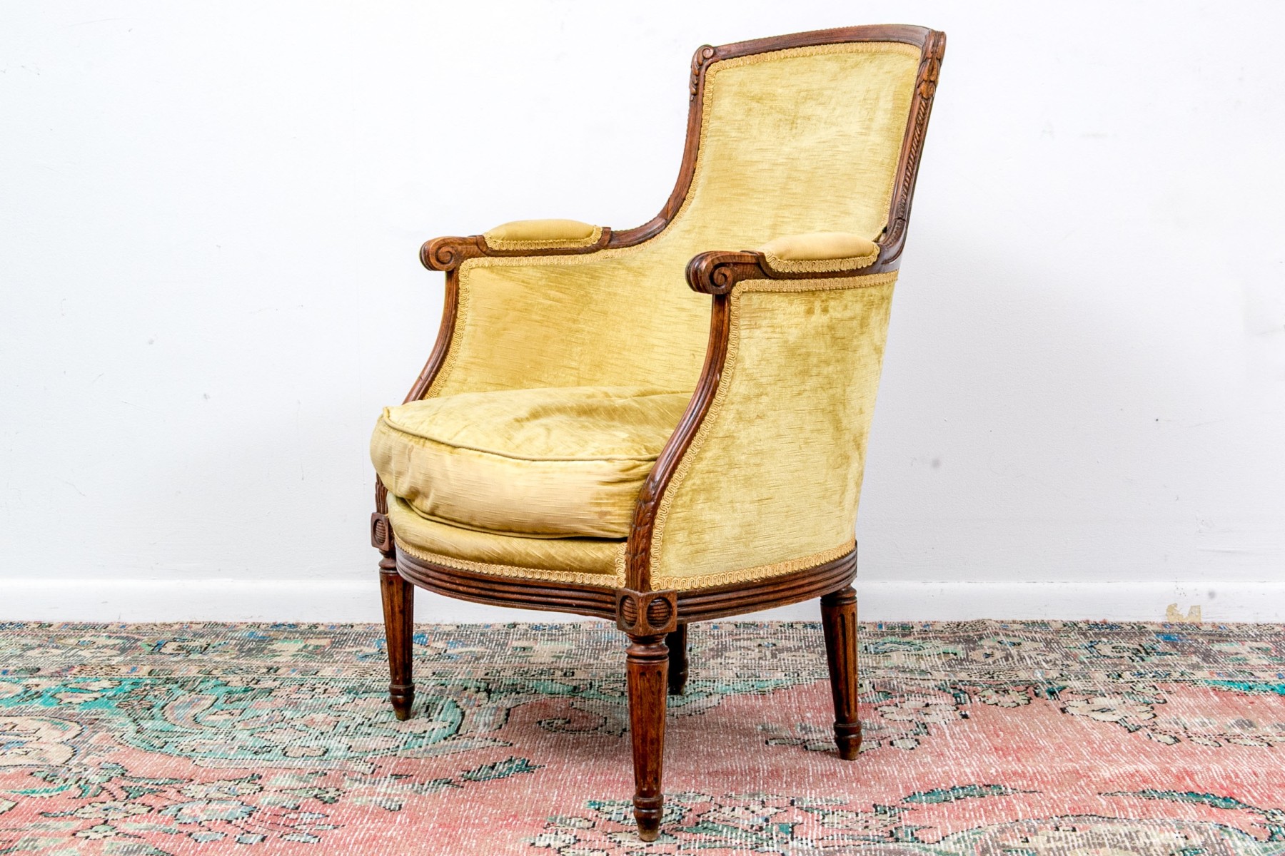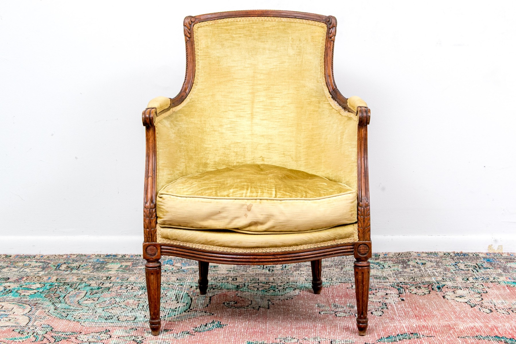 A handsome Napoleon III bergere upholstered in cheerful yellow fabric with highly decorative trims. The back is gently curved and nicely carved around the ears with foliate flourishes leading down swooping rail arms to upholstered arm pads and rolled arm fronts. Fitted with a loose seat cushion and raised over a bowfront apron atop straight, tapered and fluted legs.