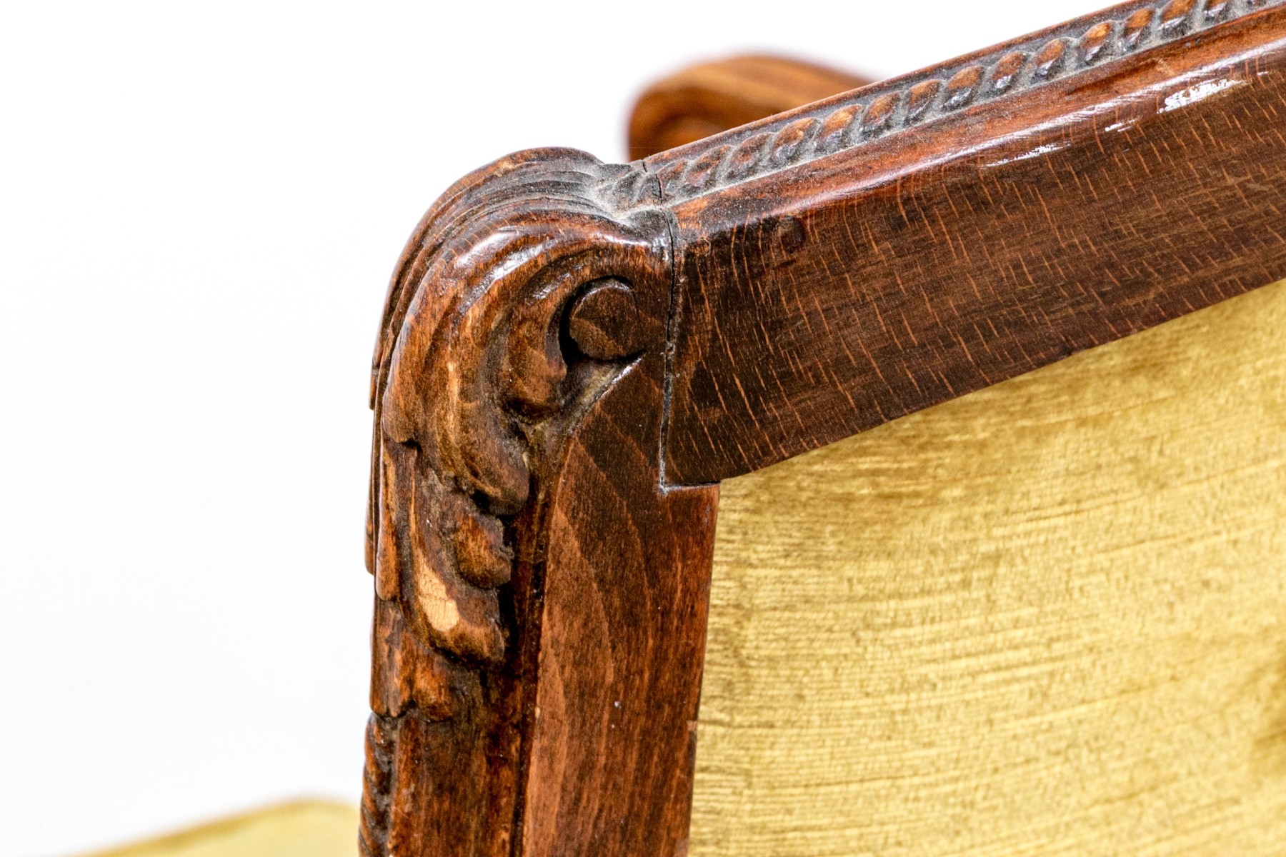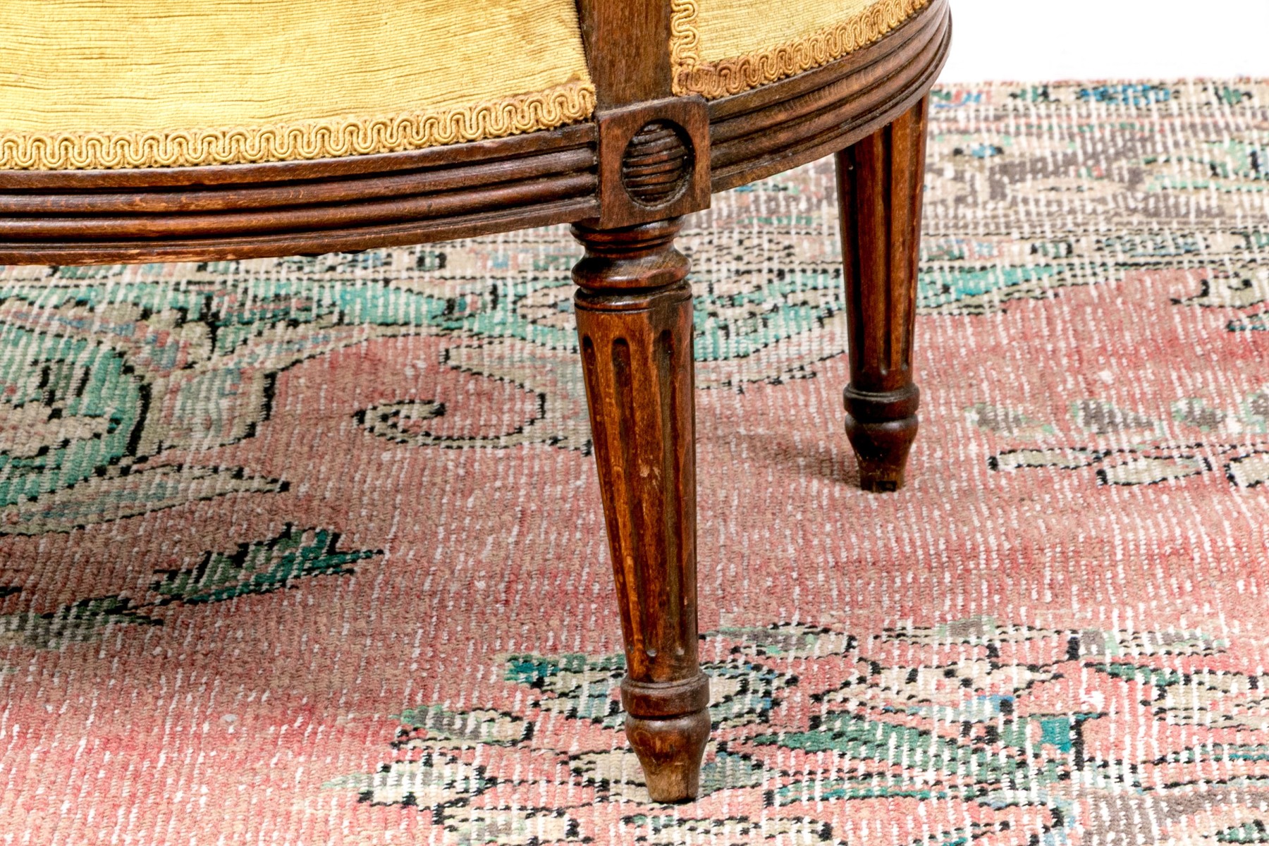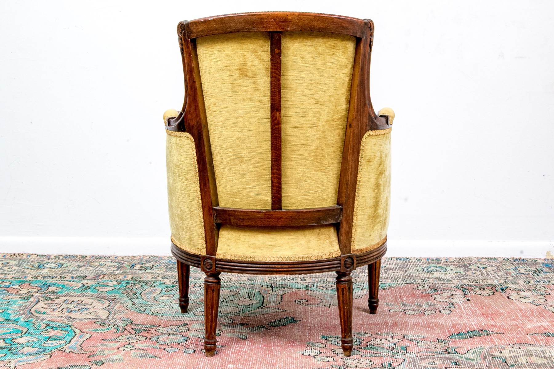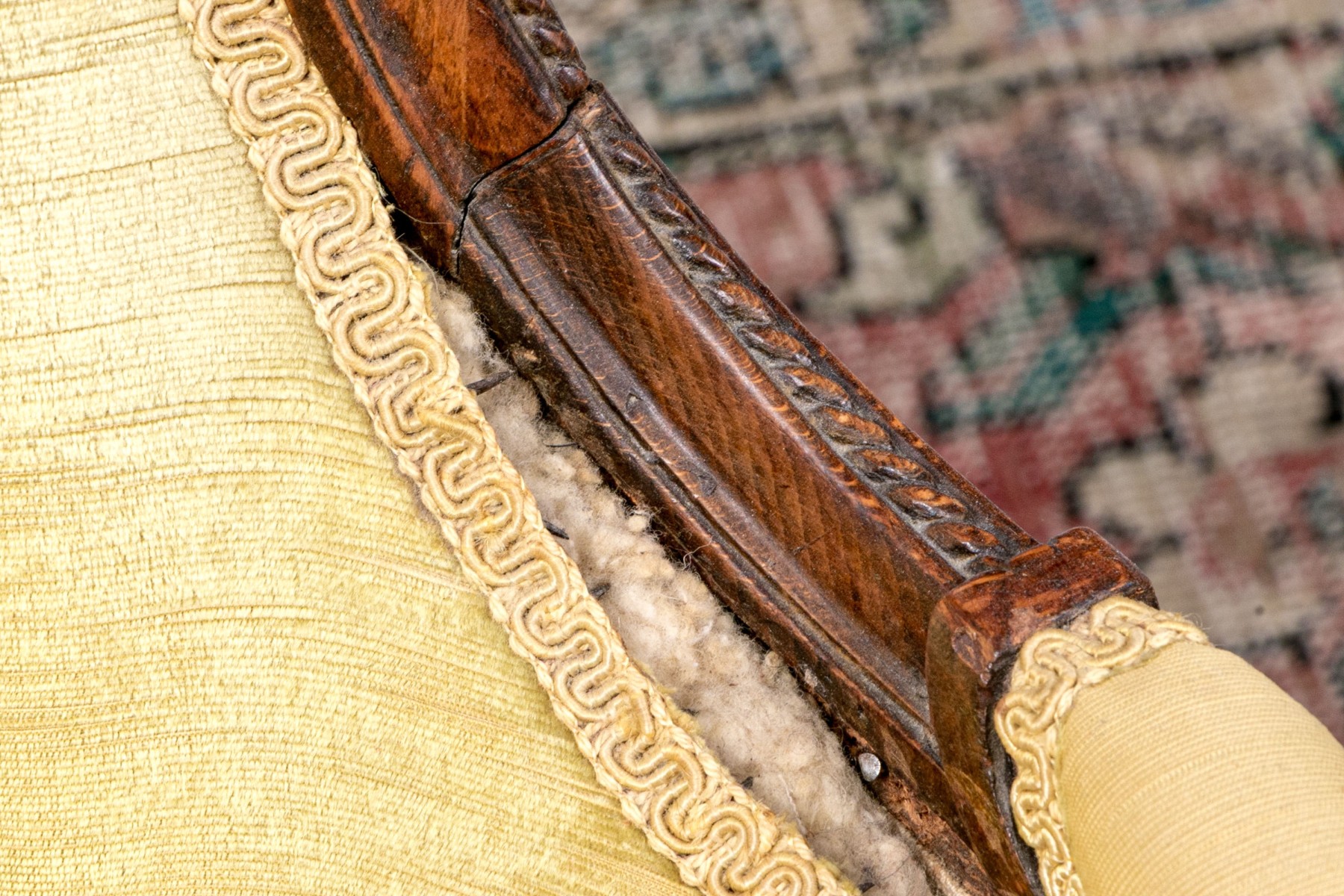 A handsome Napoleon III bergere upholstered in cheerful yellow fabric with highly decorative trims. The back is gently curved and nicely carved around the ears with foliate flourishes leading down swooping rail arms to upholstered arm pads and rolled arm fronts. Fitted with a loose seat cushion and raised over a bowfront apron atop straight, tapered and fluted legs.