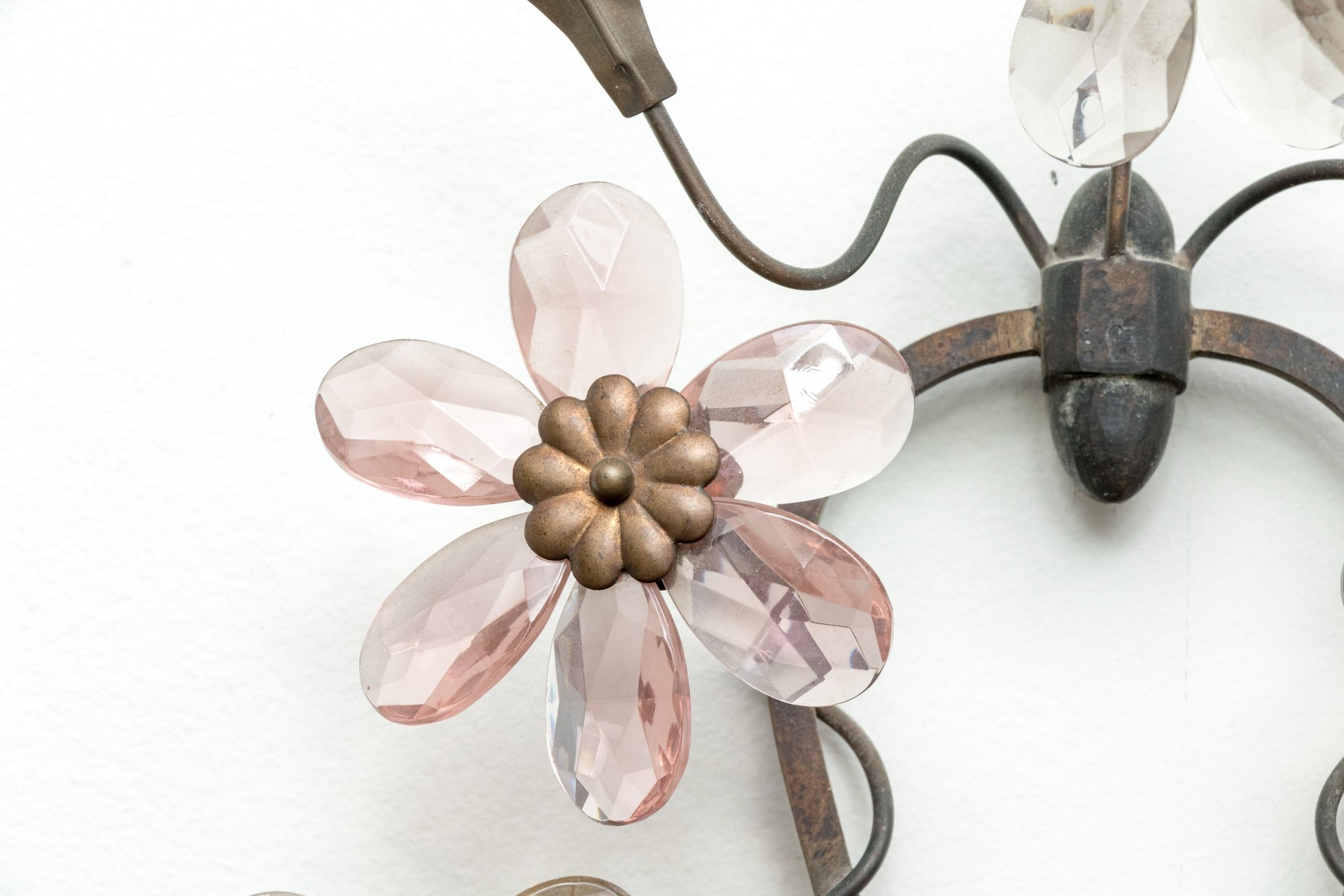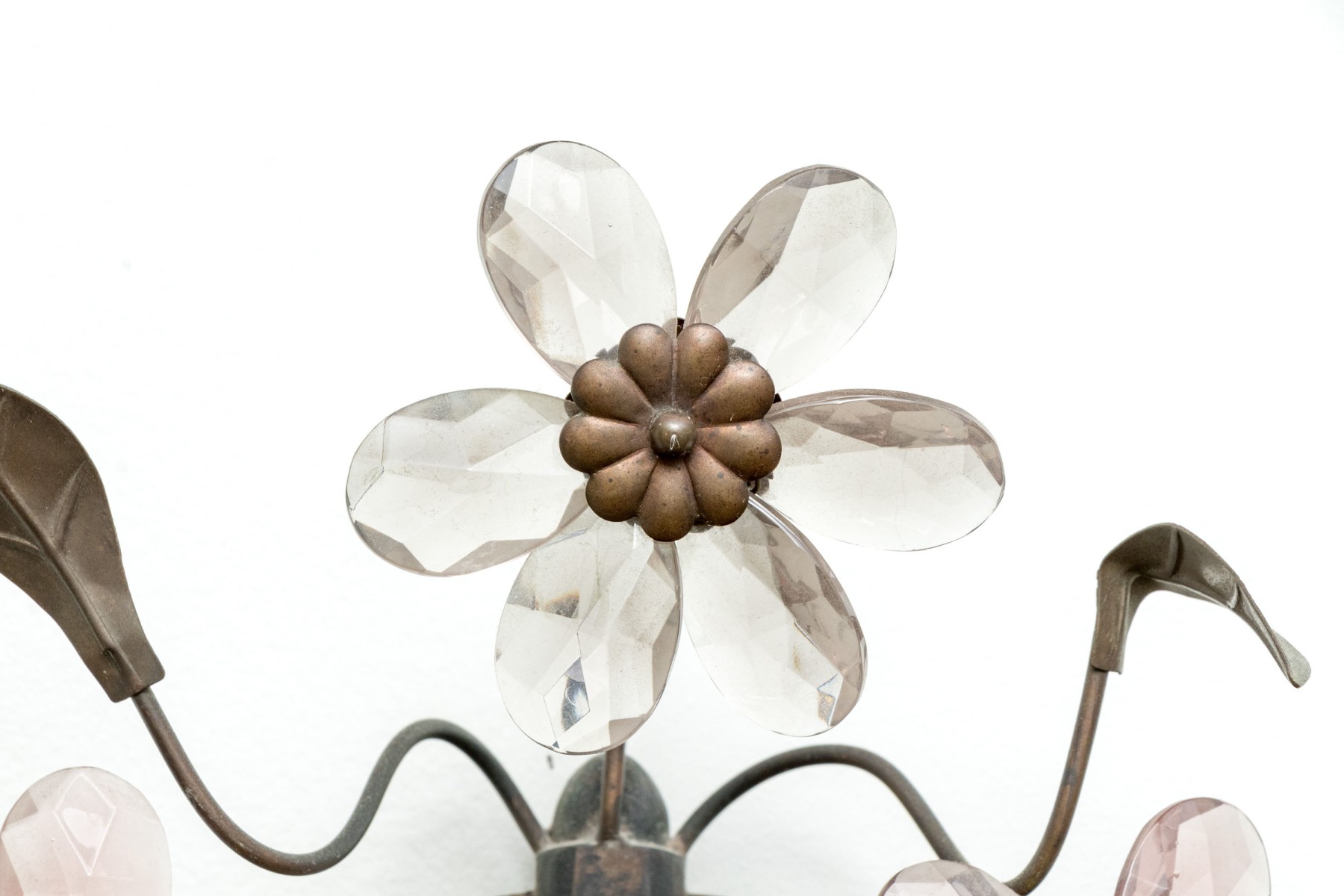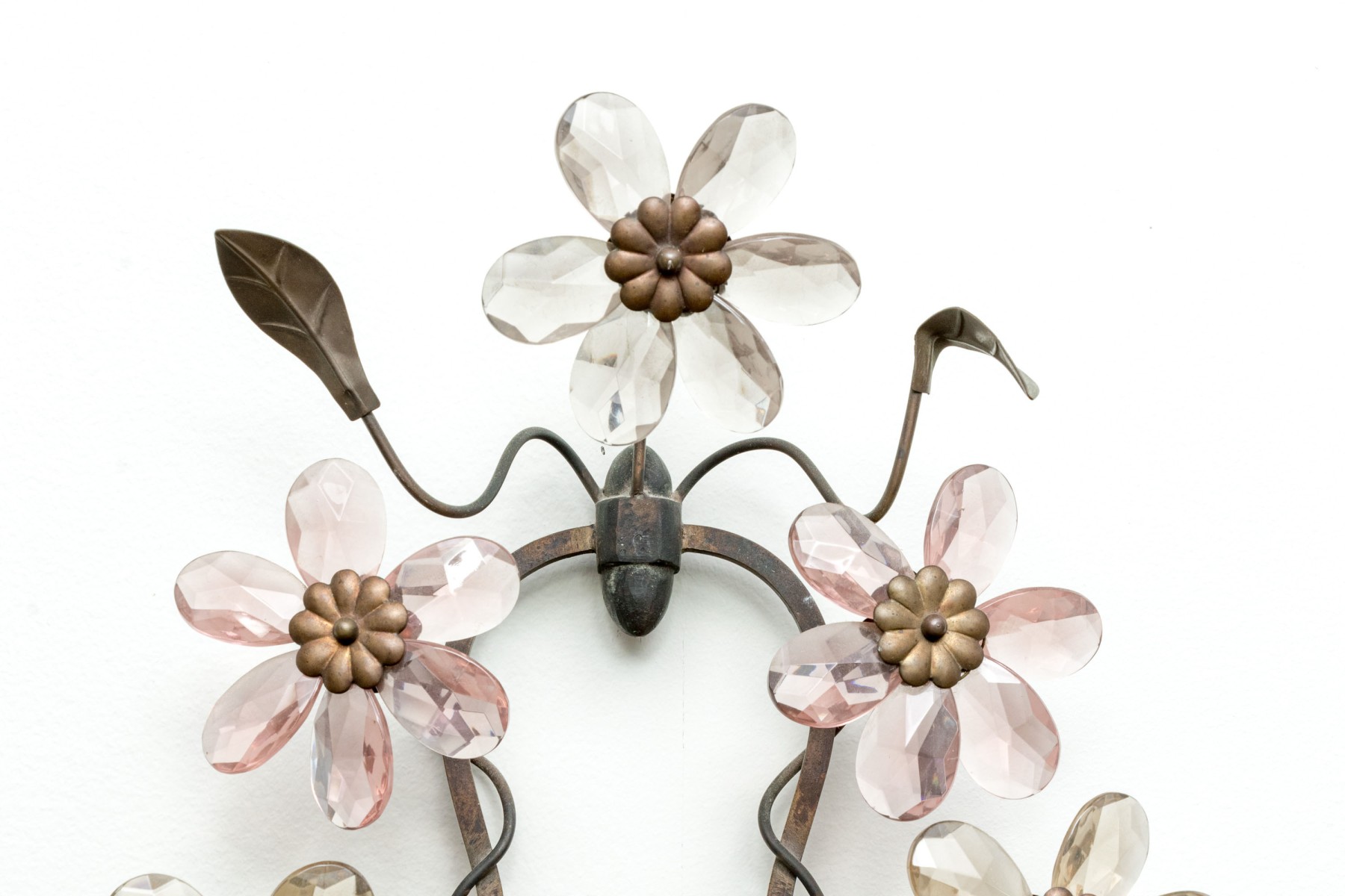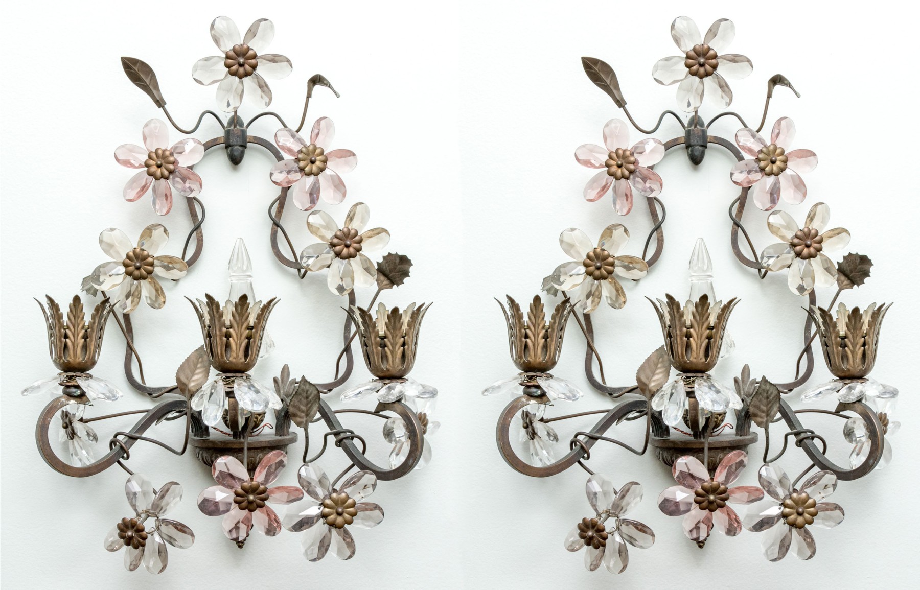 A delightful pair of Napoleon III style wall sconces showcasing elegant arches of pink and white crystal flowers over trios of tulip-form candle sconces leading to gadrooned urn-shaped finials at the bottoms.