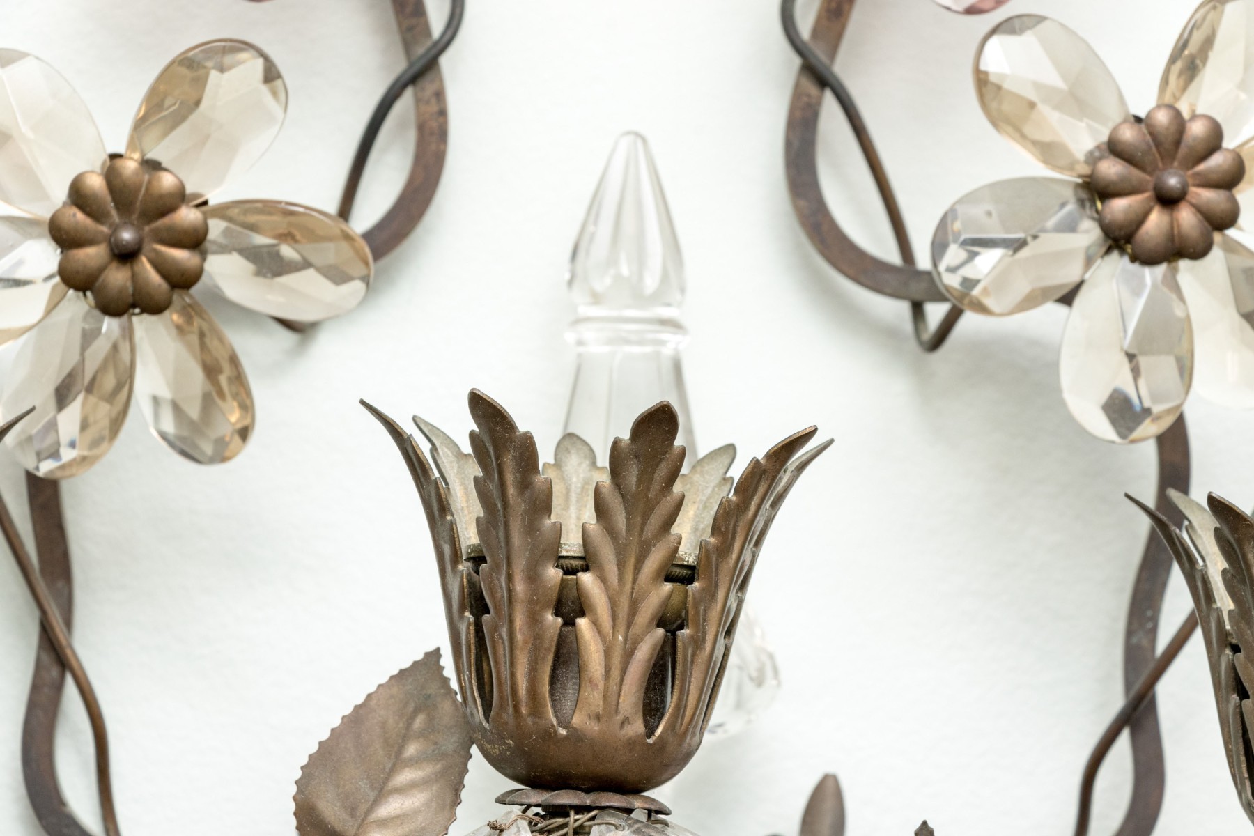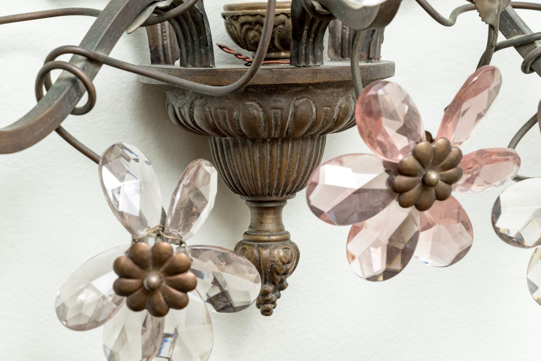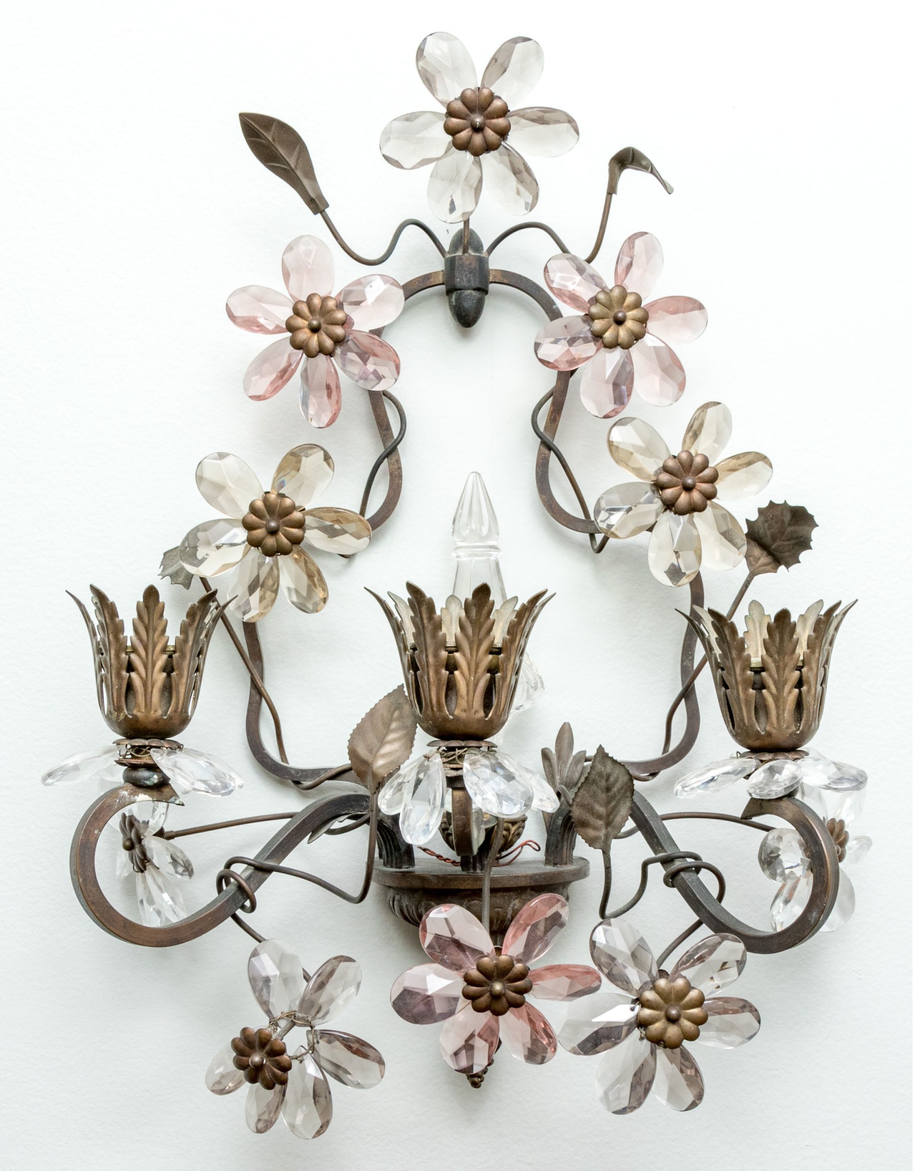 A delightful pair of Napoleon III style wall sconces showcasing elegant arches of pink and white crystal flowers over trios of tulip-form candle sconces leading to gadrooned urn-shaped finials at the bottoms.