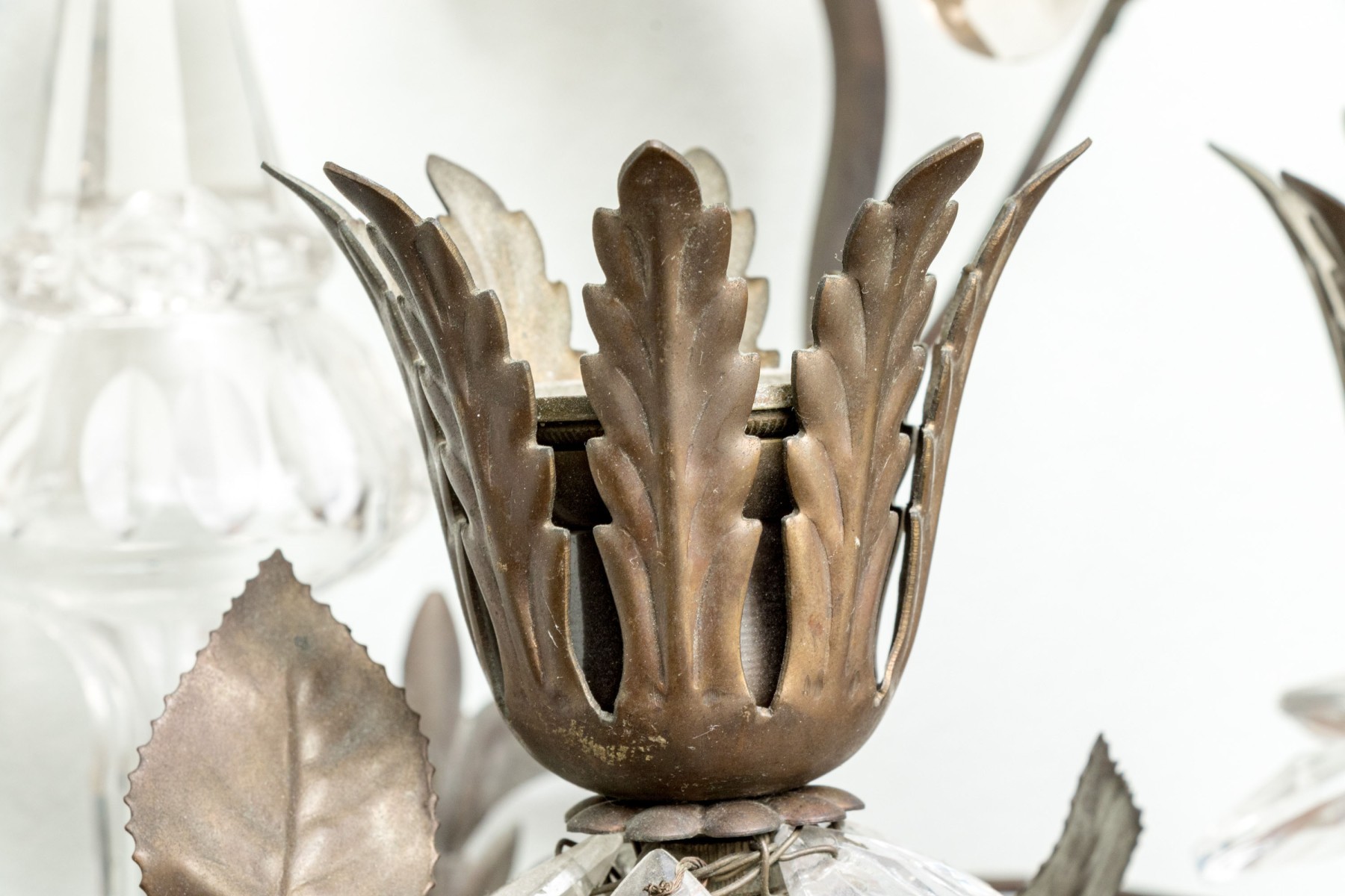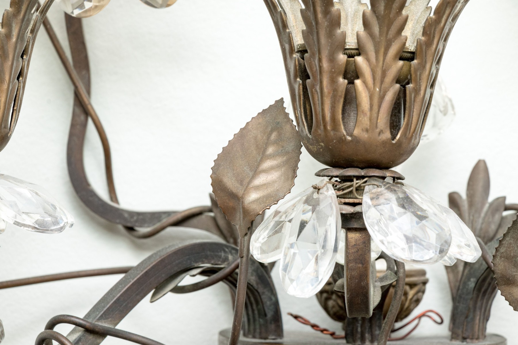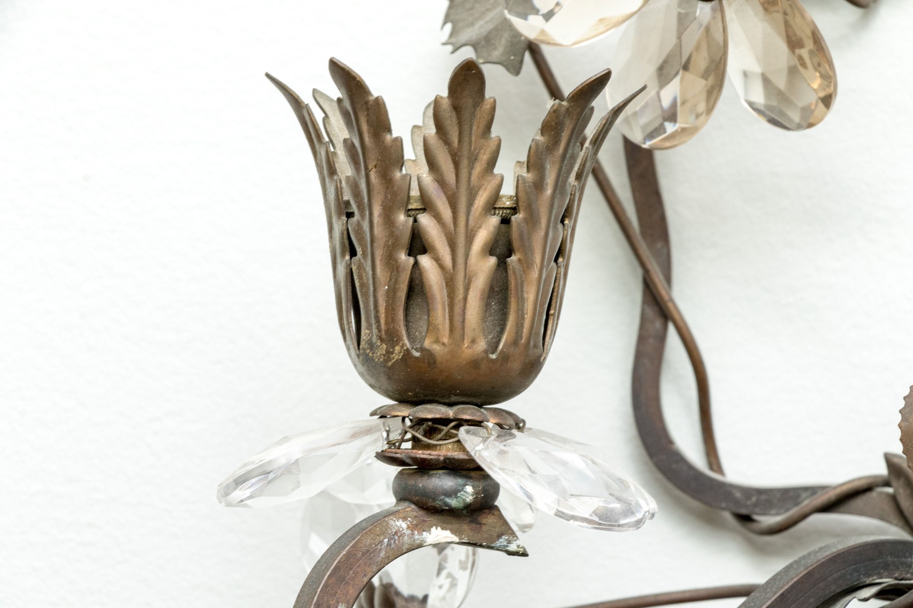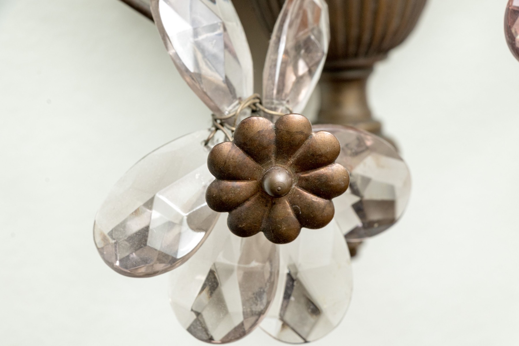 A delightful pair of Napoleon III style wall sconces showcasing elegant arches of pink and white crystal flowers over trios of tulip-form candle sconces leading to gadrooned urn-shaped finials at the bottoms.