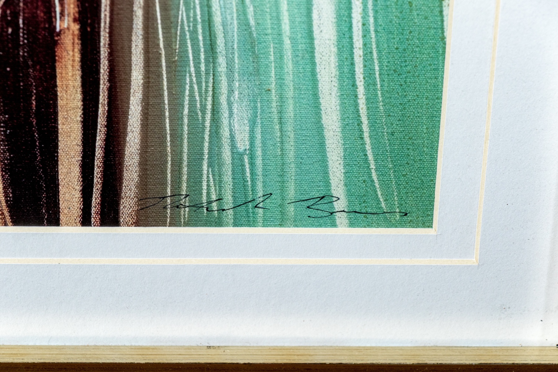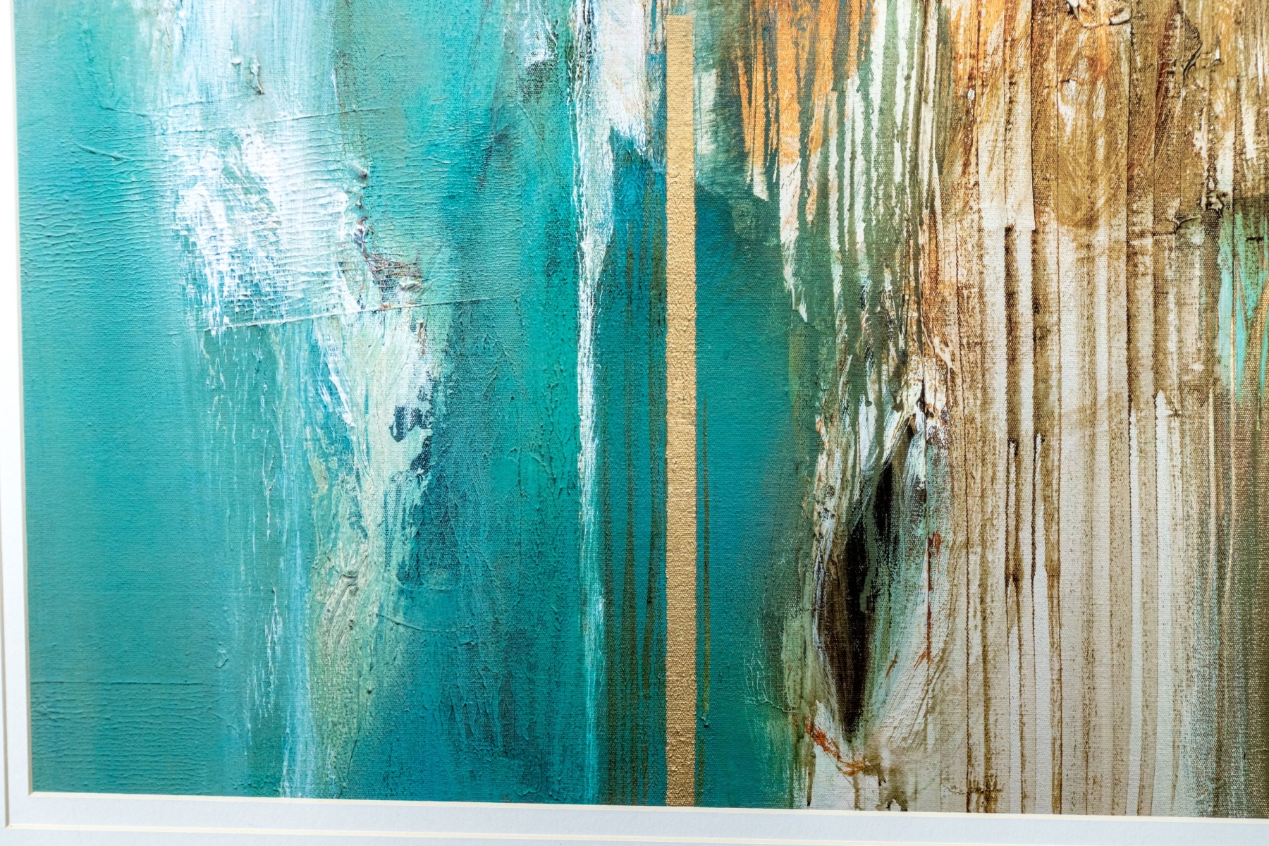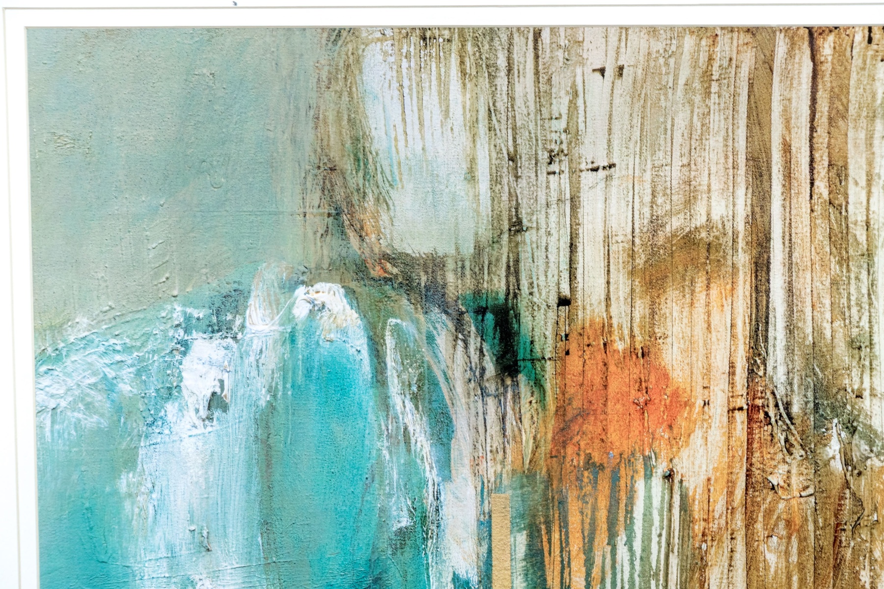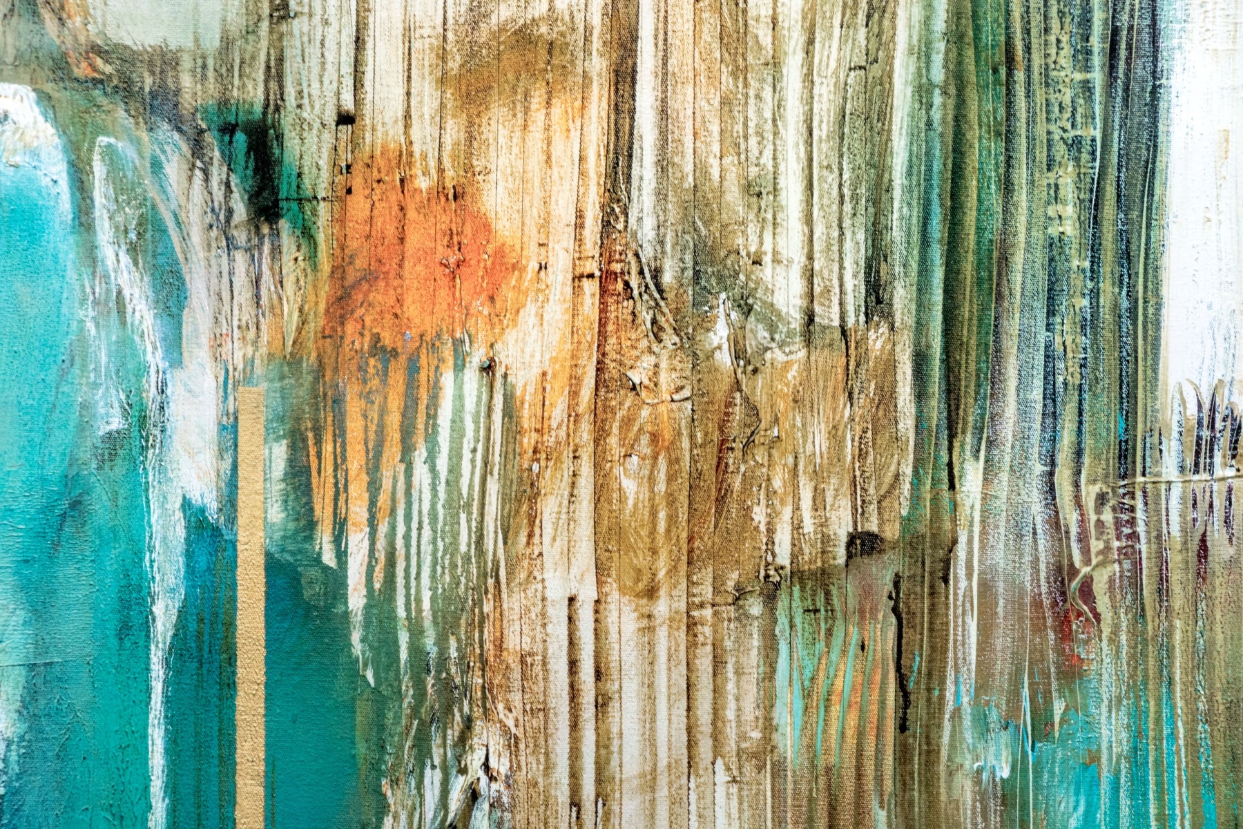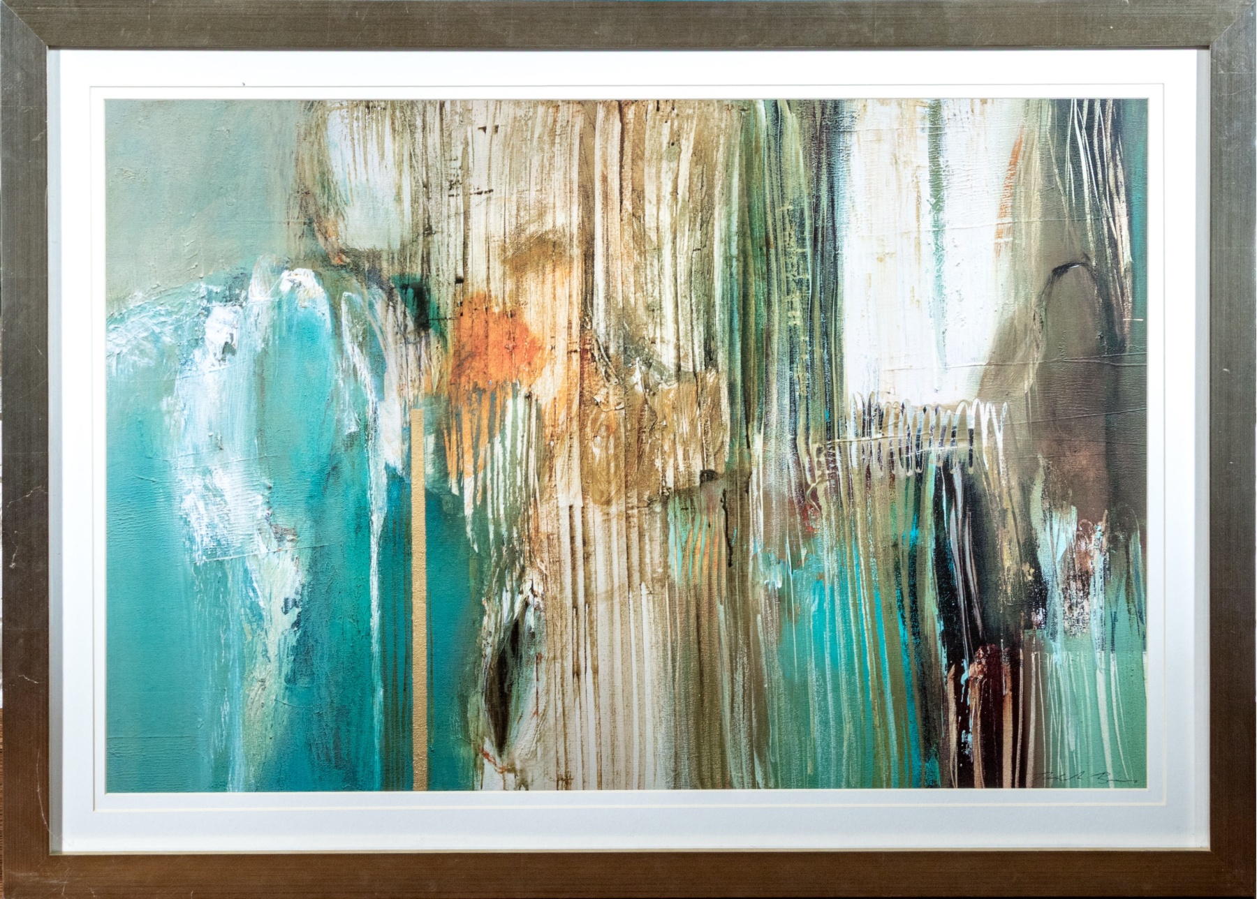 Natasha Barnes (South African, b. 1969) "Peppermint Grove" print depicting an abstract composition with vibrant pops of turquoise blue, orange, and brown streaking along vertical drips, drags, and gestural swipes to create an eye-catching sense of rhythm and texture. Plate signature lower right.