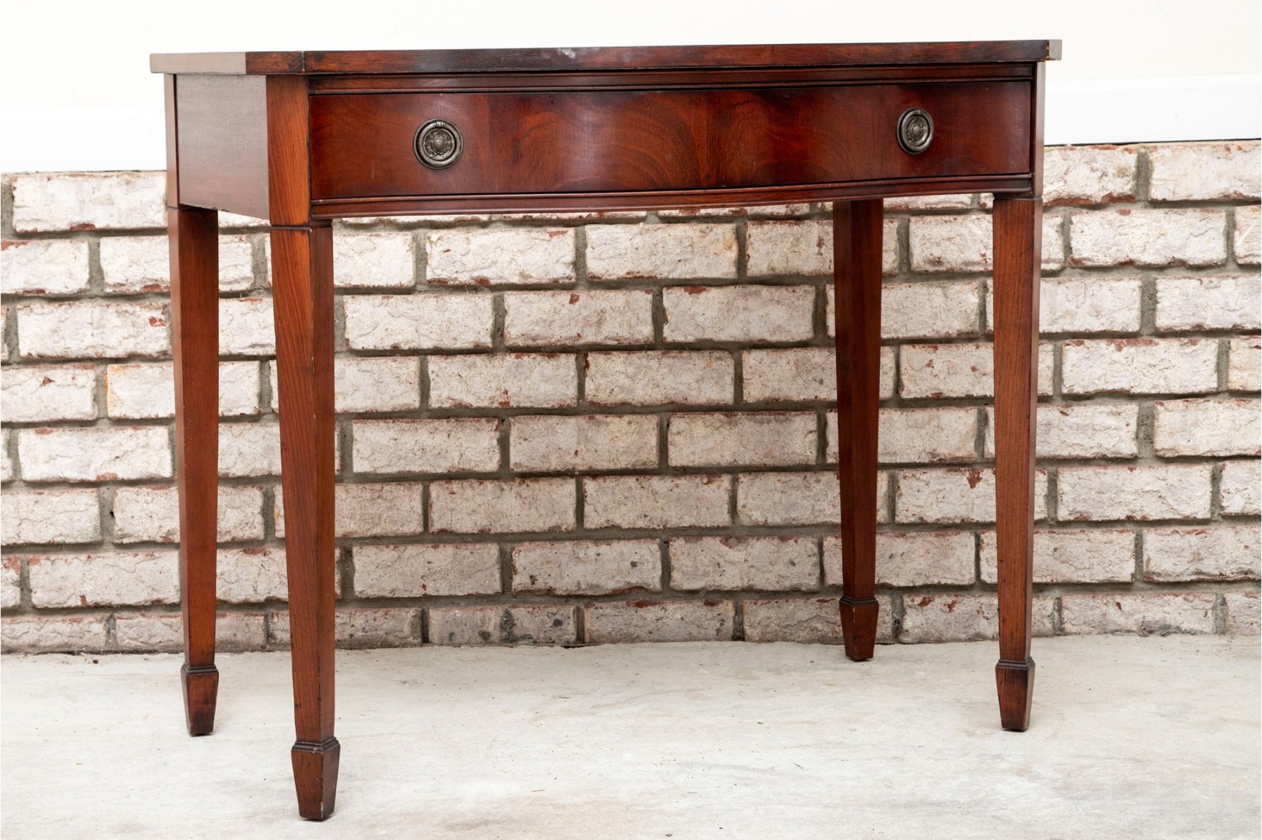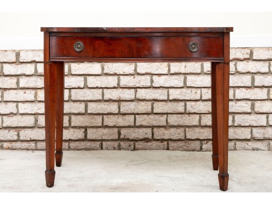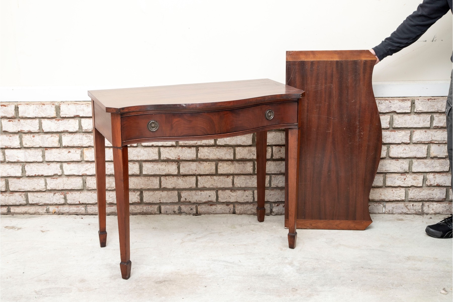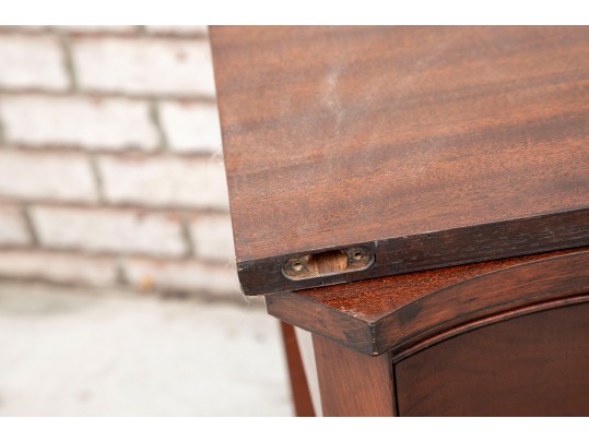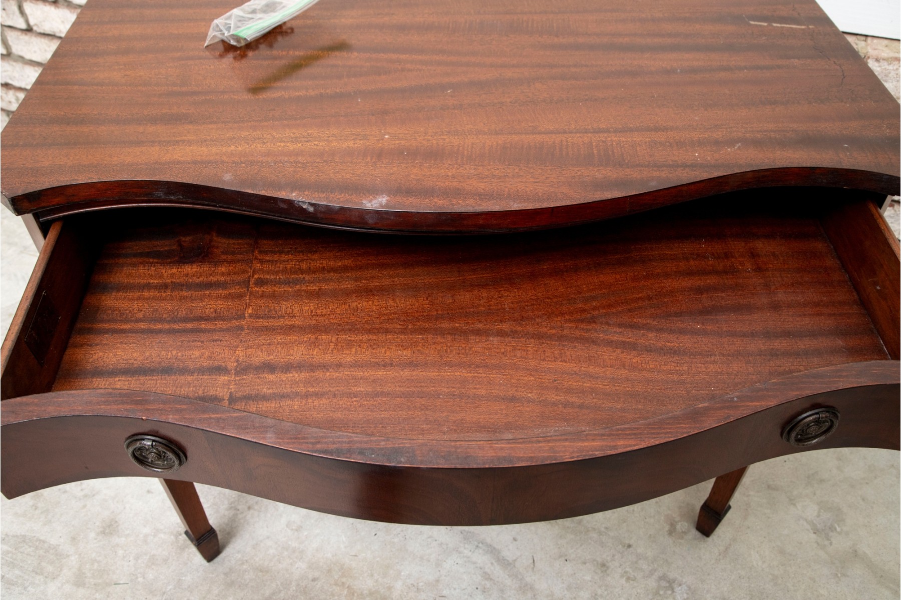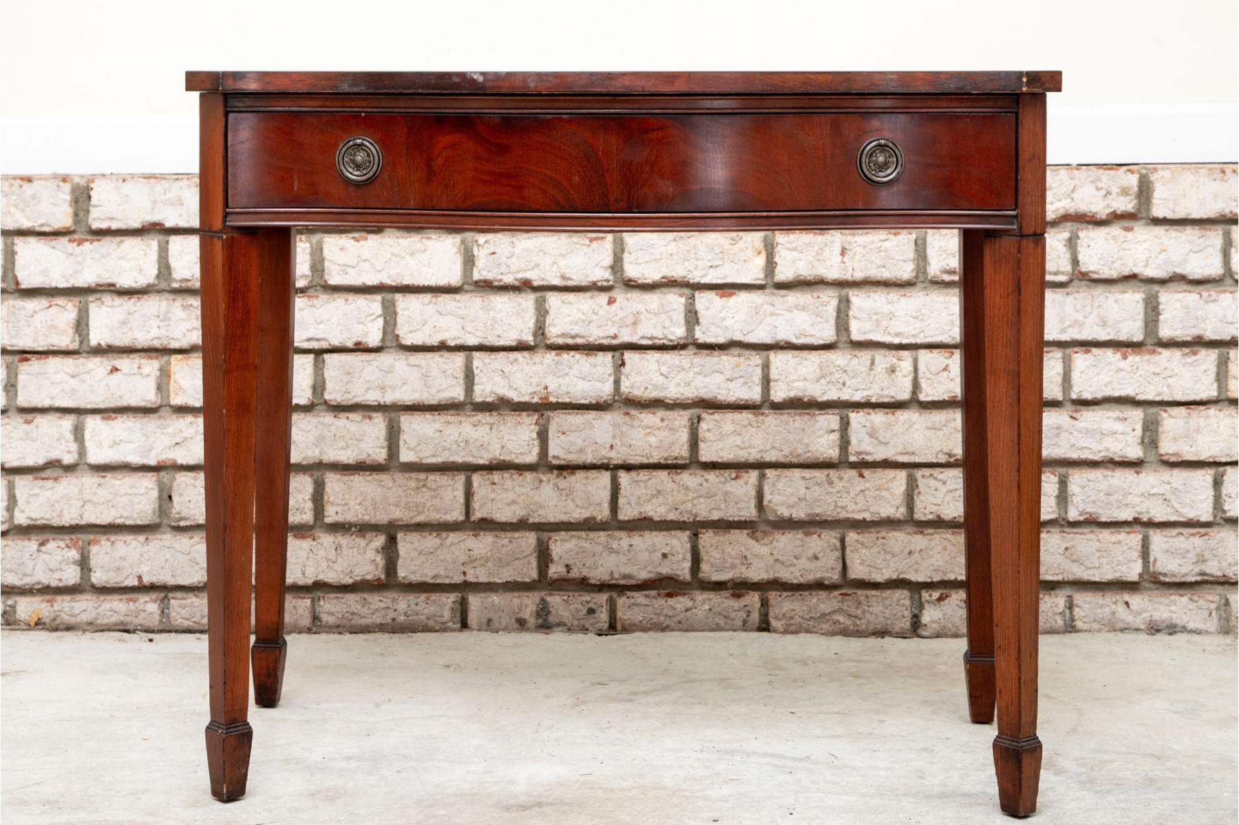 An antique Sheraton inspired flip-top mahogany game table with single drawer and serpentine front, produced by Union Nation Fine Furniture.