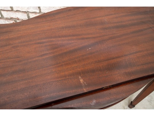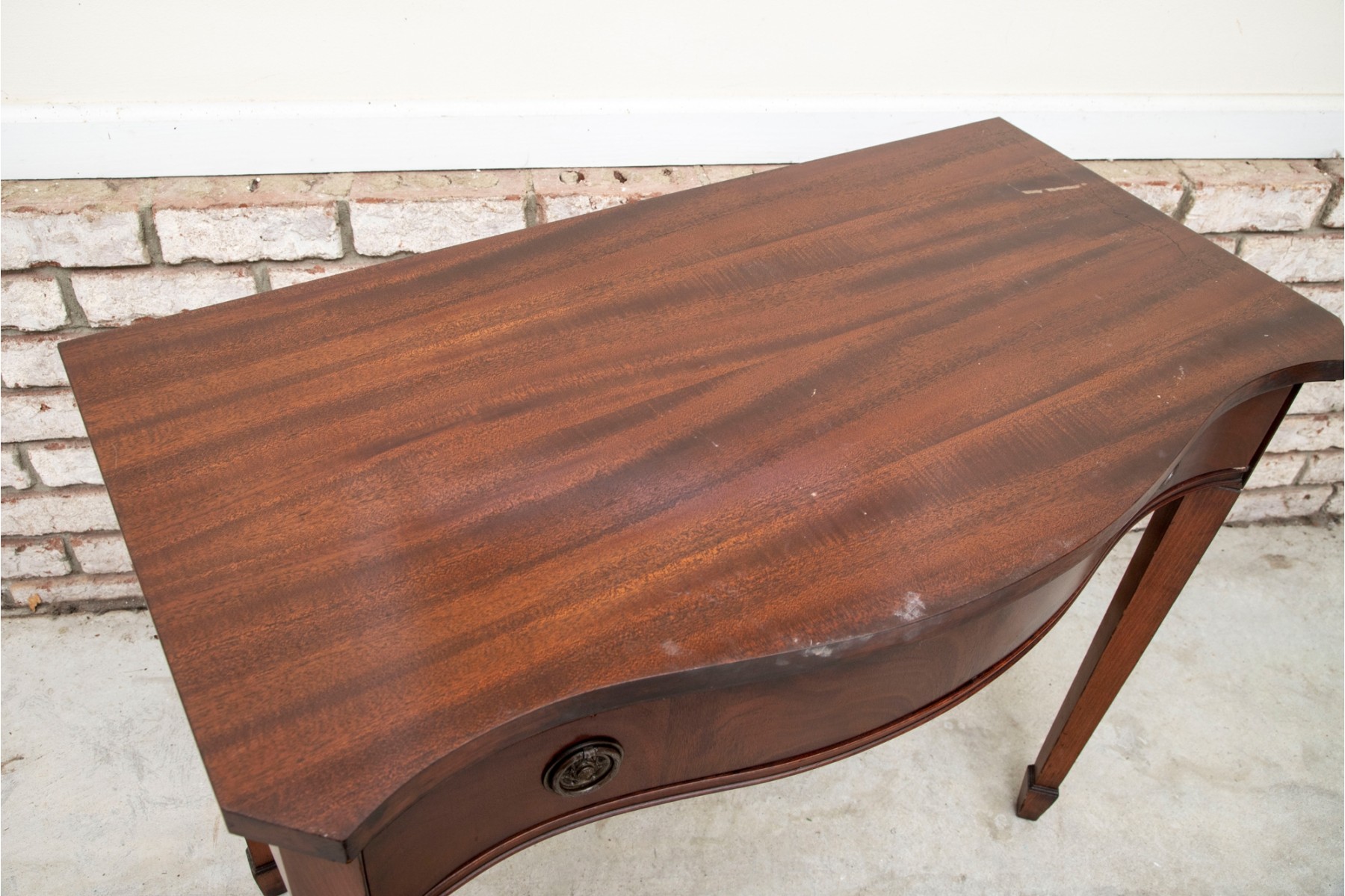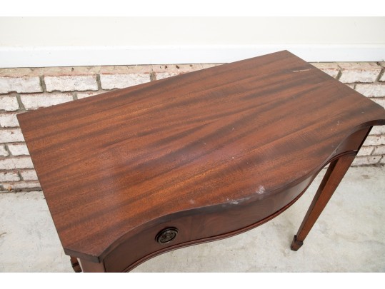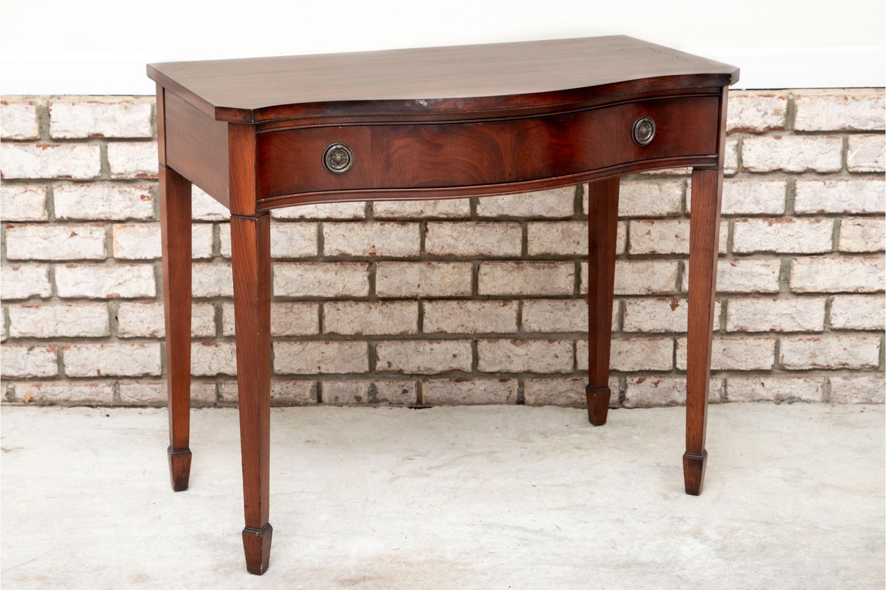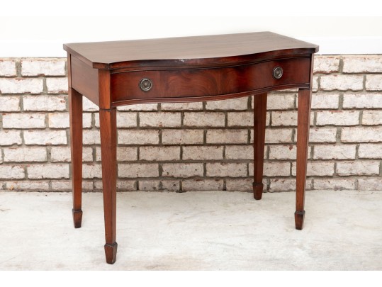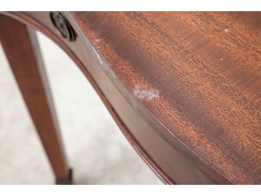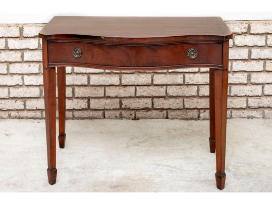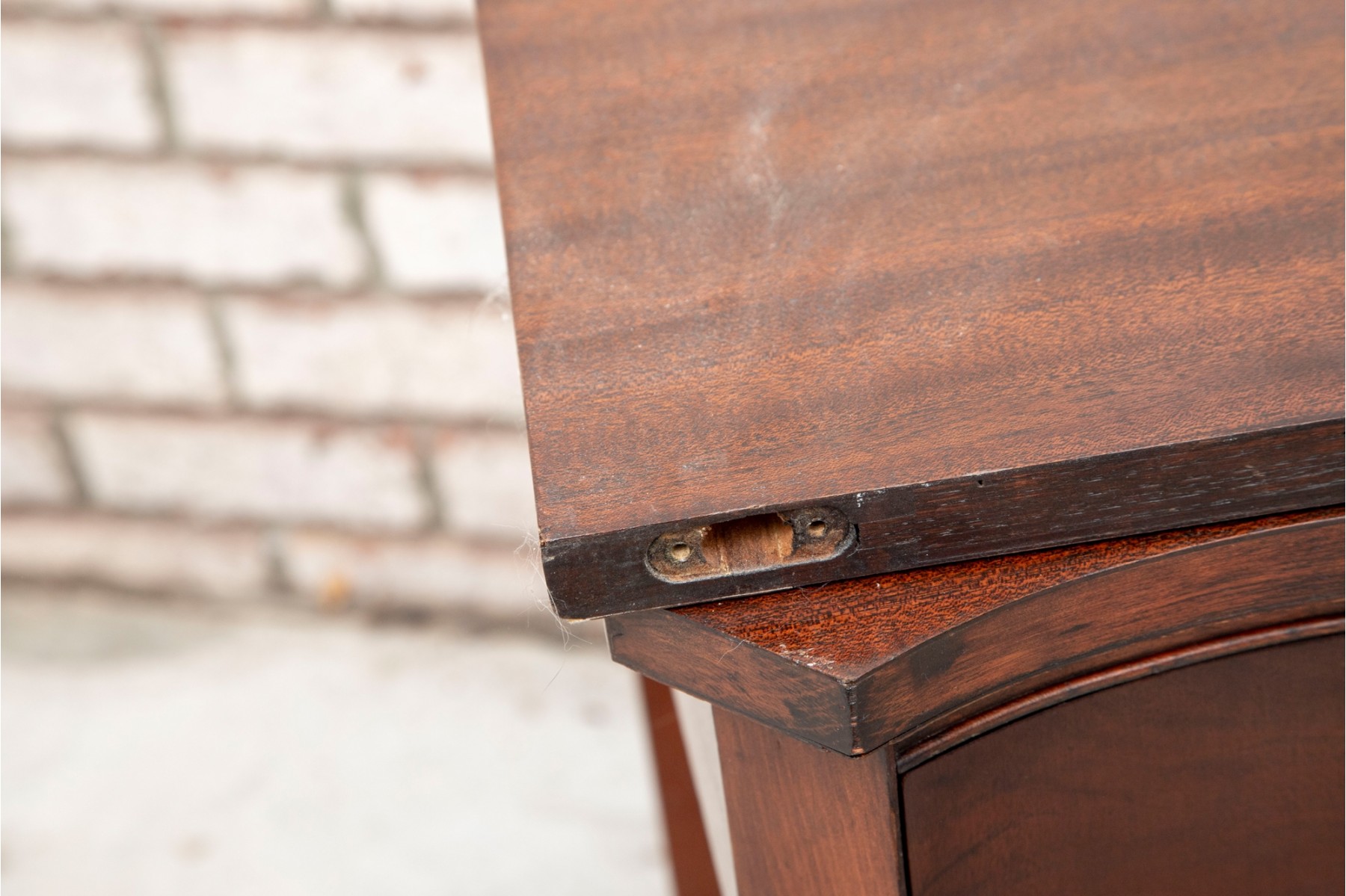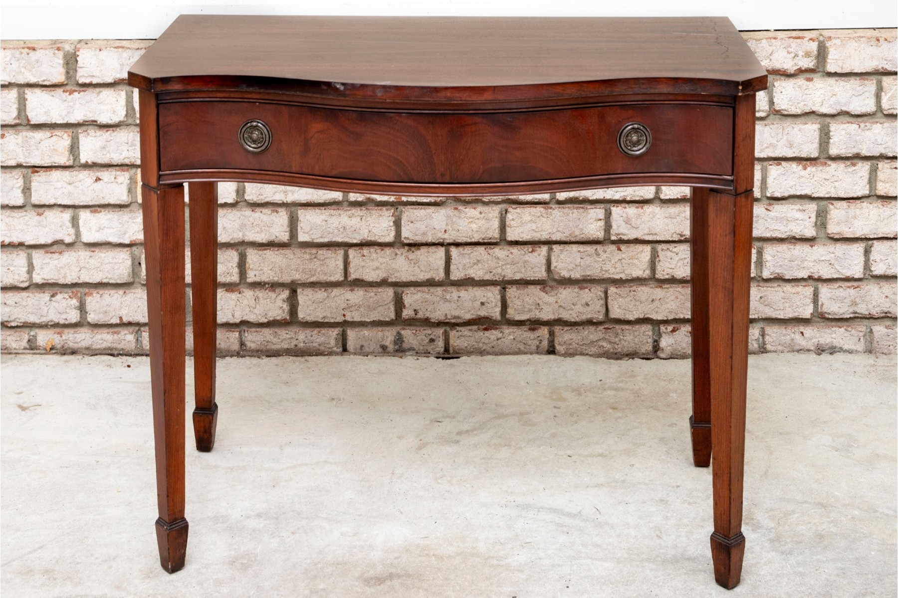 An antique Sheraton inspired flip-top mahogany game table with single drawer and serpentine front, produced by Union Nation Fine Furniture.