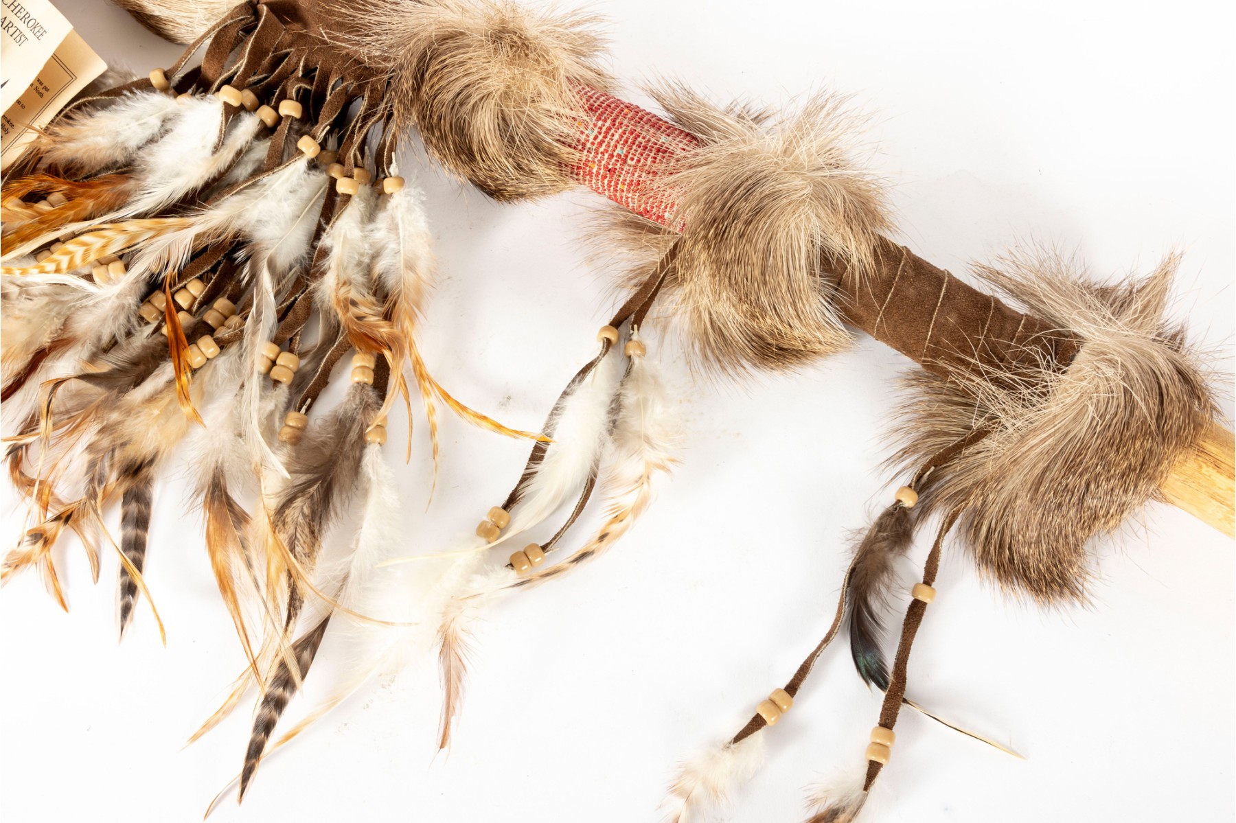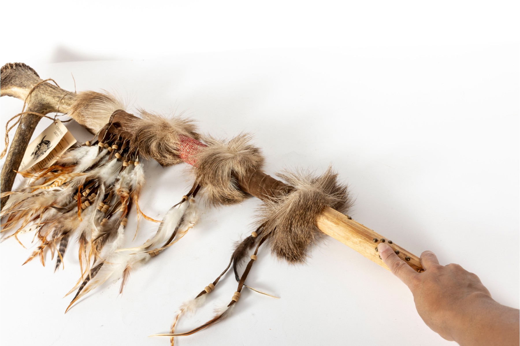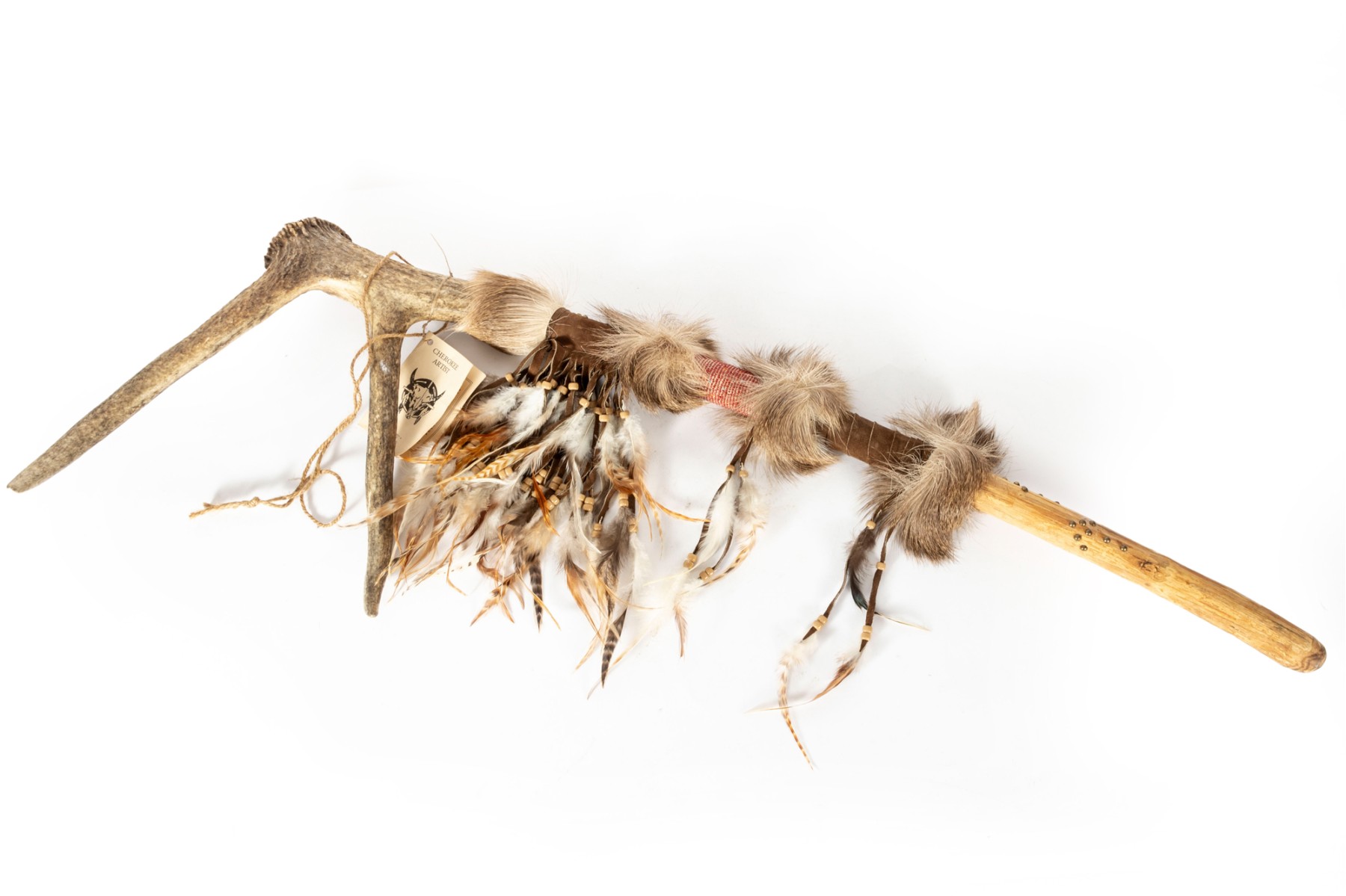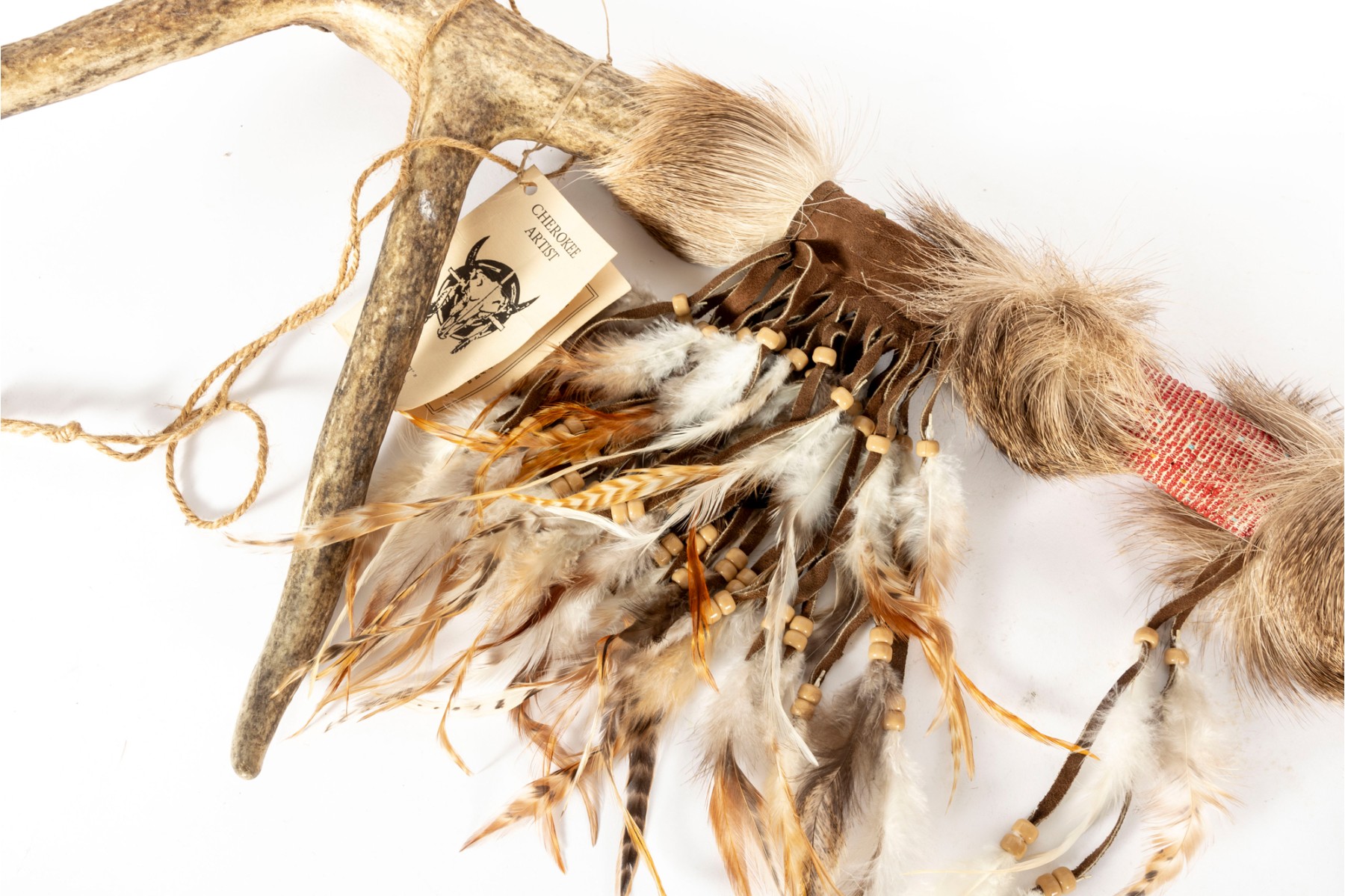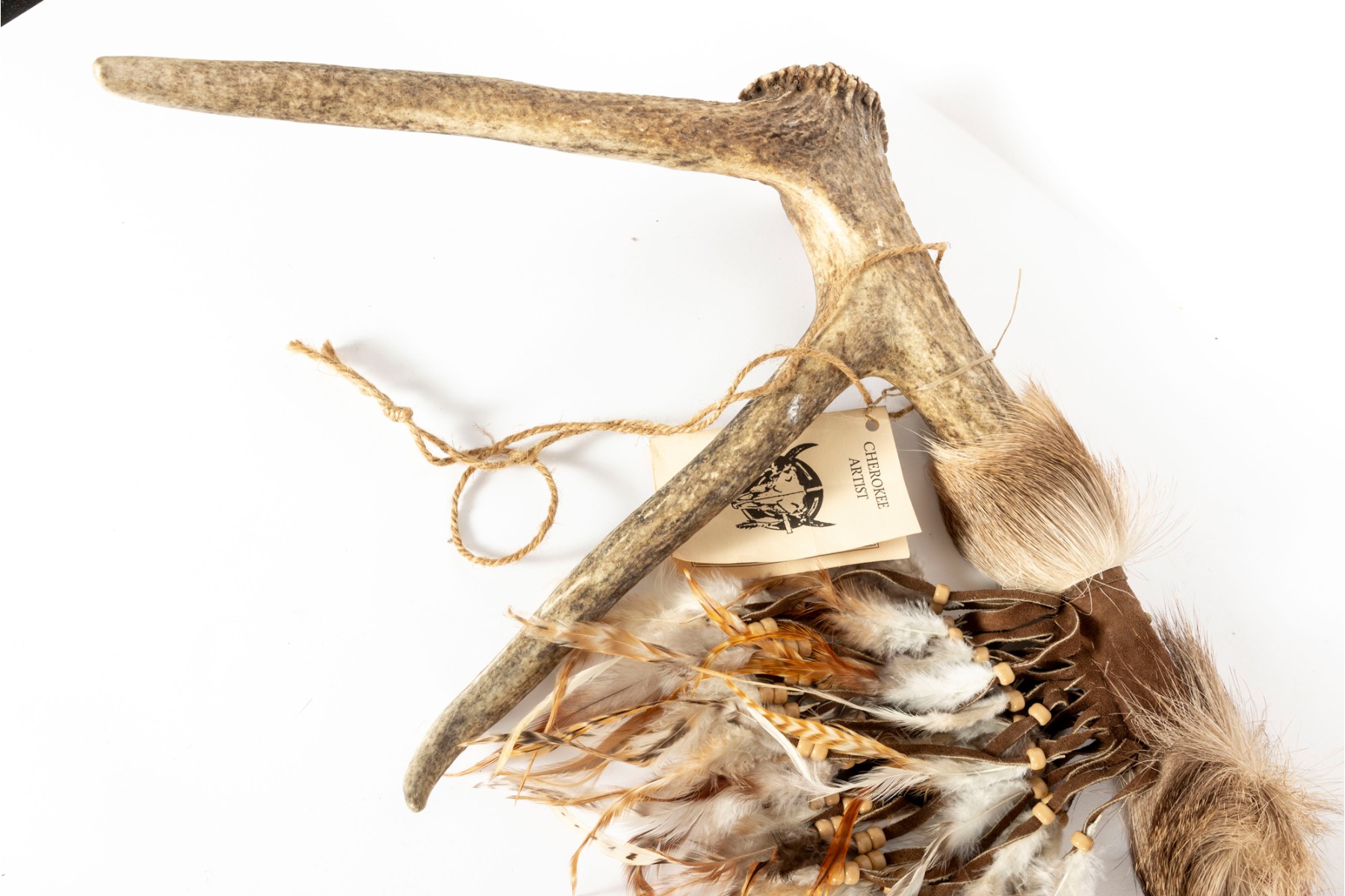 A 38" Elk antler peace pipe designed by Cherokee artist "AS GA STI" (Littleman). The pipe is additionally composed of feathers, glass crow beads, leather, deer fur and decorative brass studs.