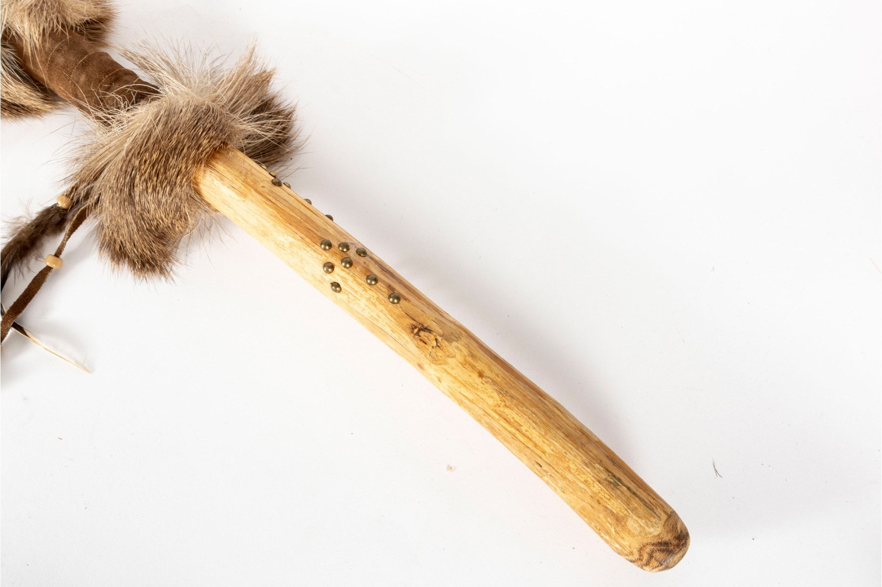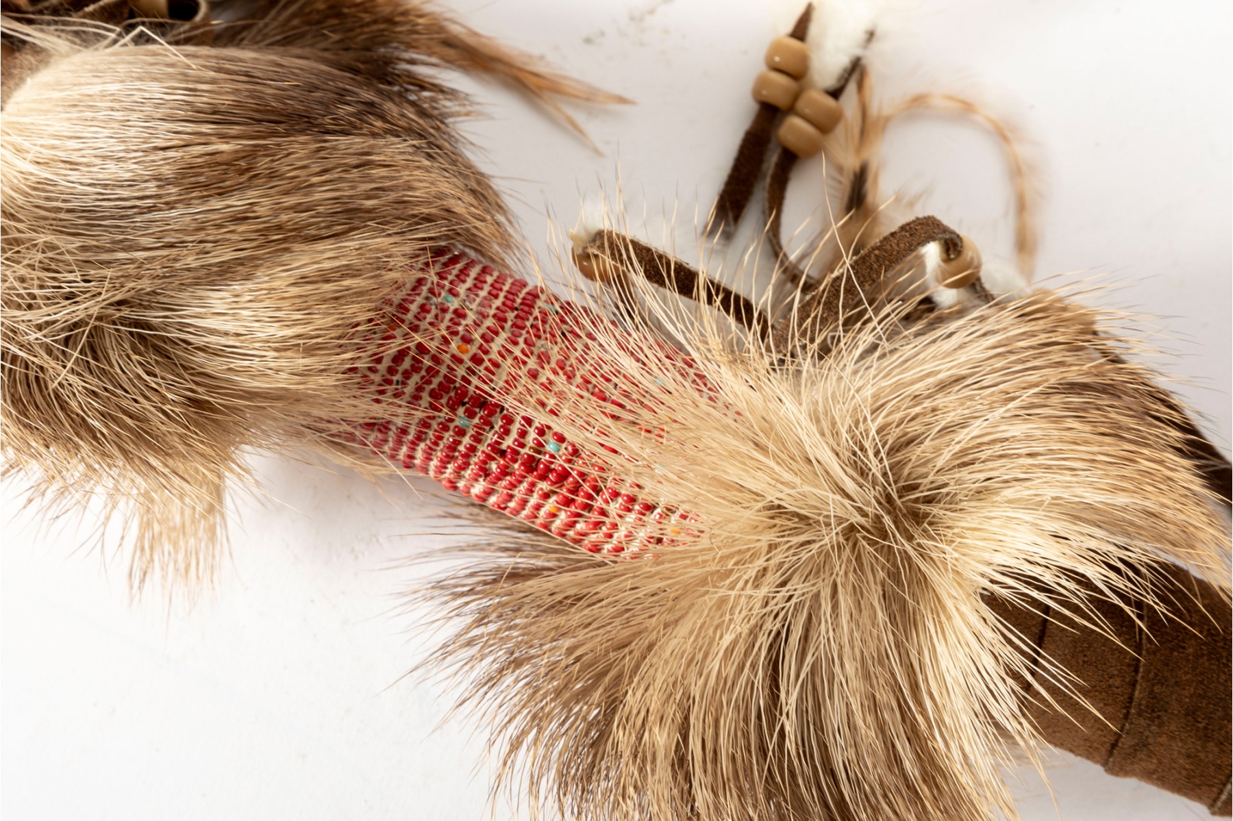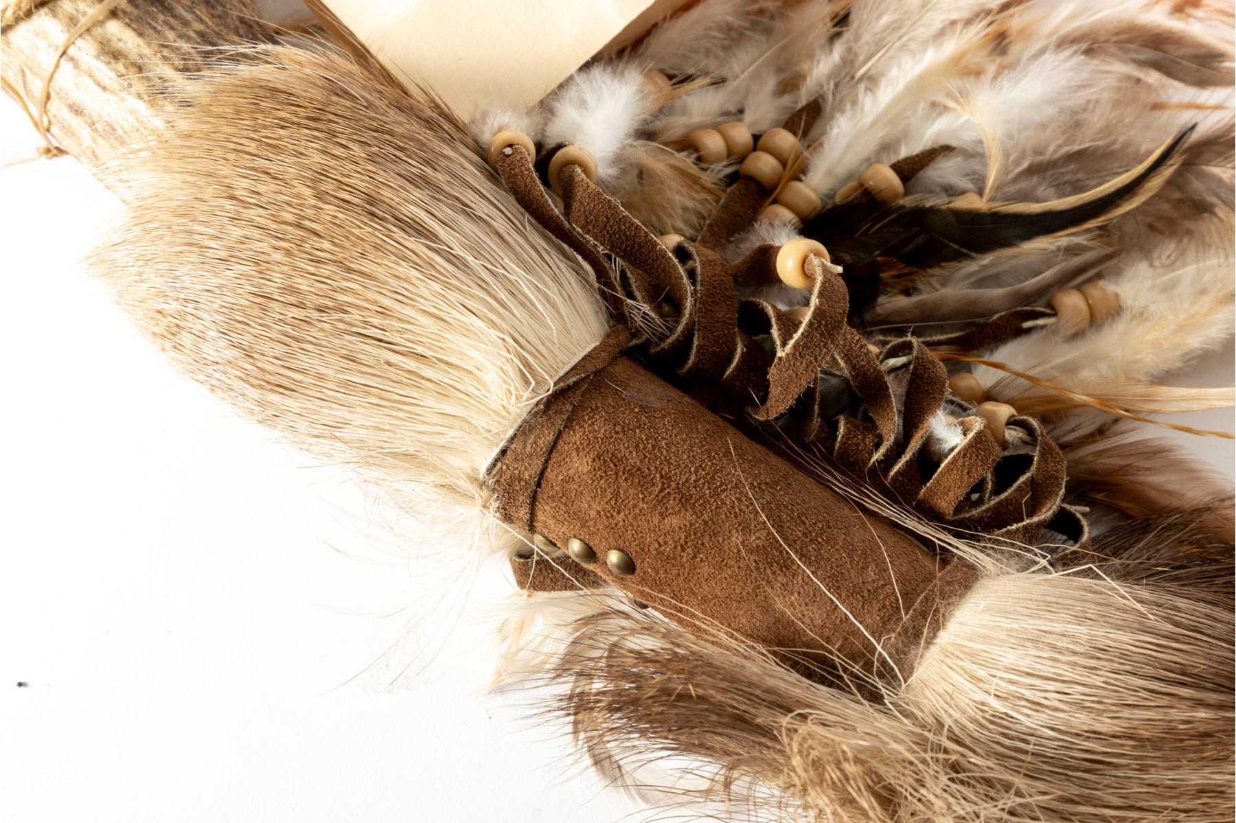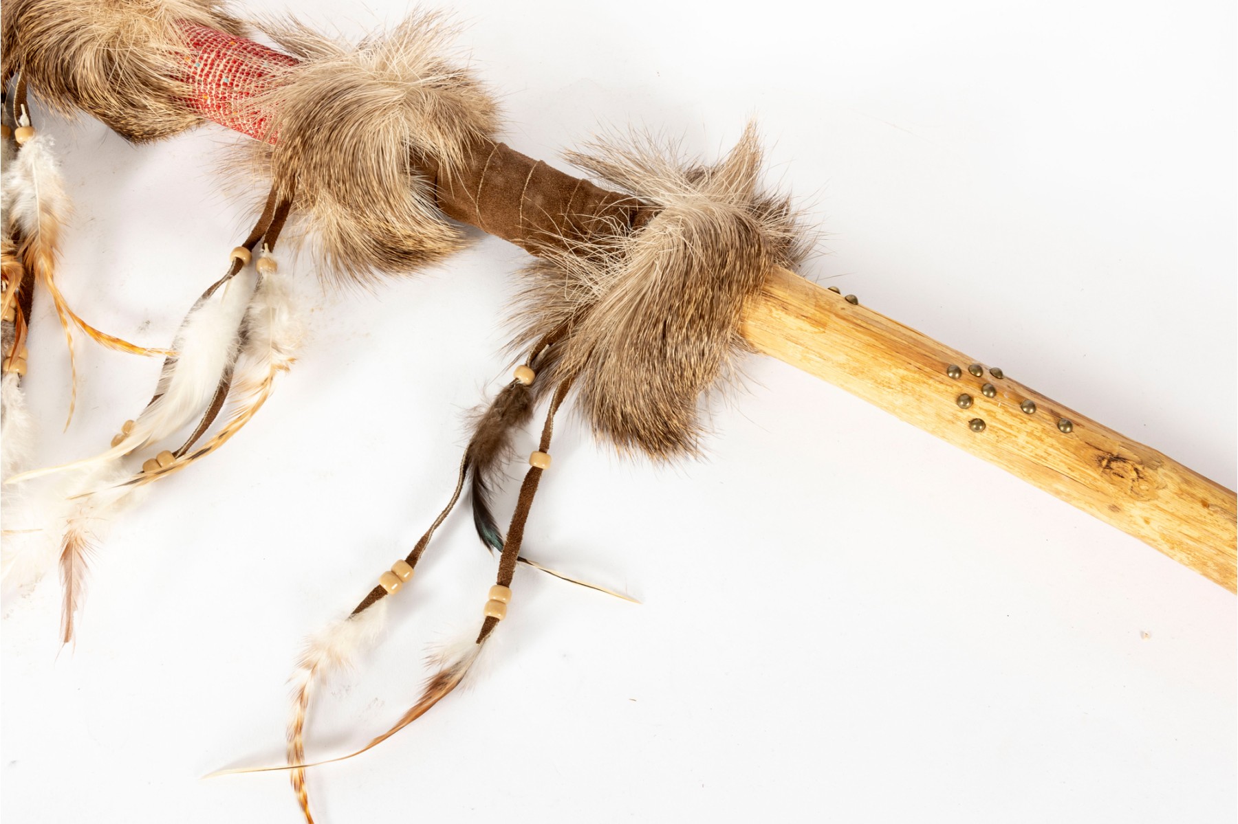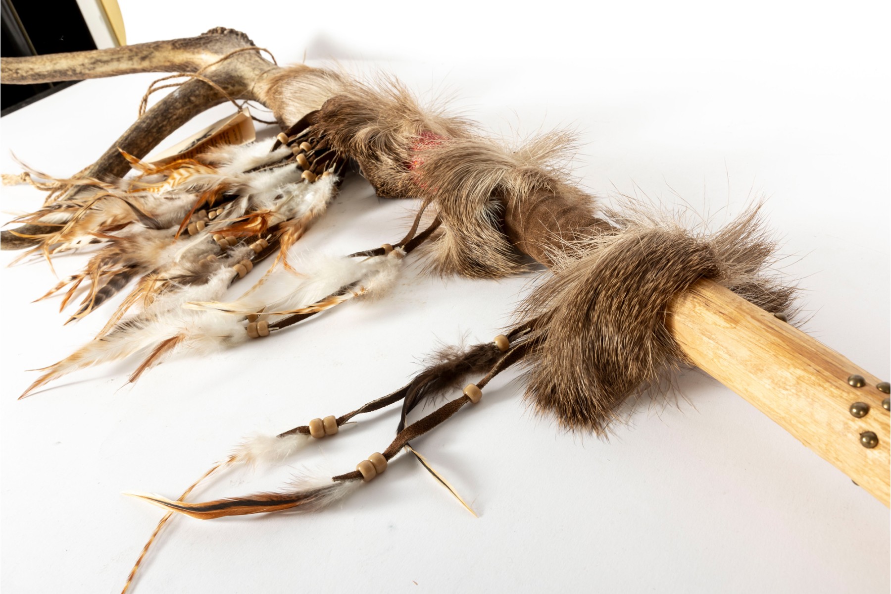 A 38" Elk antler peace pipe designed by Cherokee artist "AS GA STI" (Littleman). The pipe is additionally composed of feathers, glass crow beads, leather, deer fur and decorative brass studs.