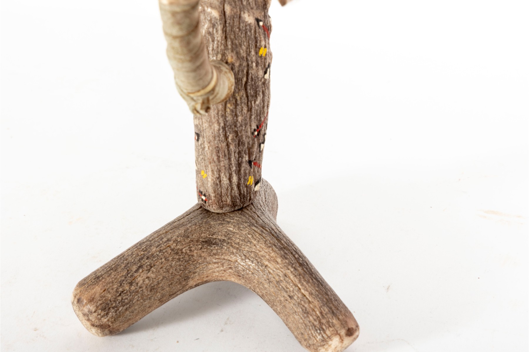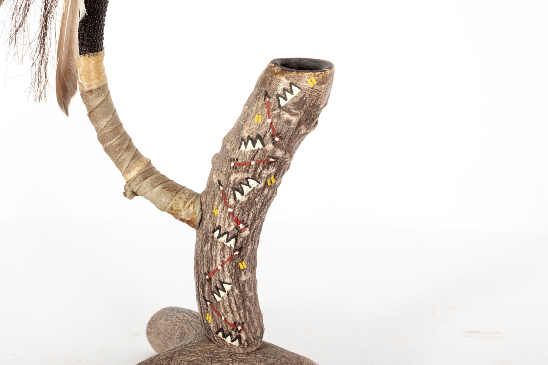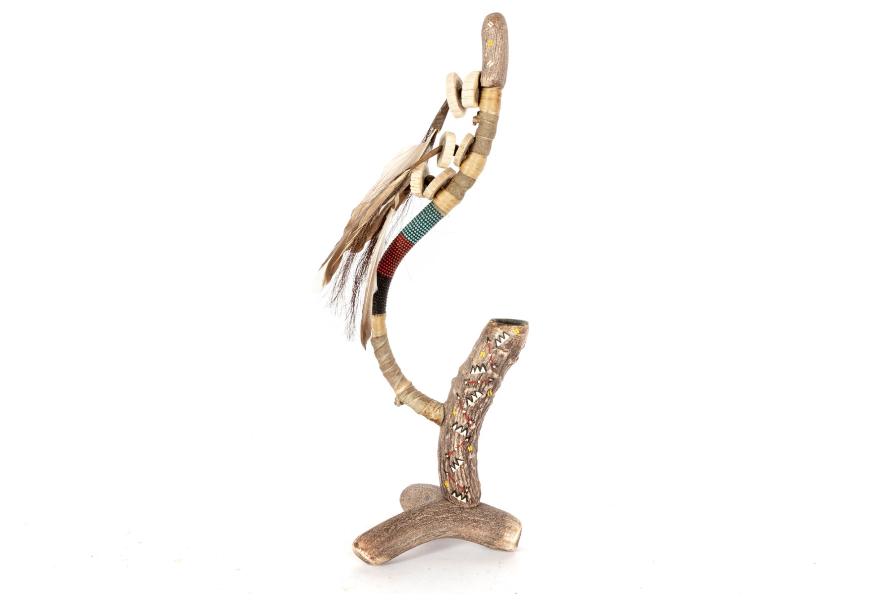 An authentic Native American peace smoking pipe for religious or ceremonial purposes, crafted from deer antlers, hide wrapped wood handles and fur.