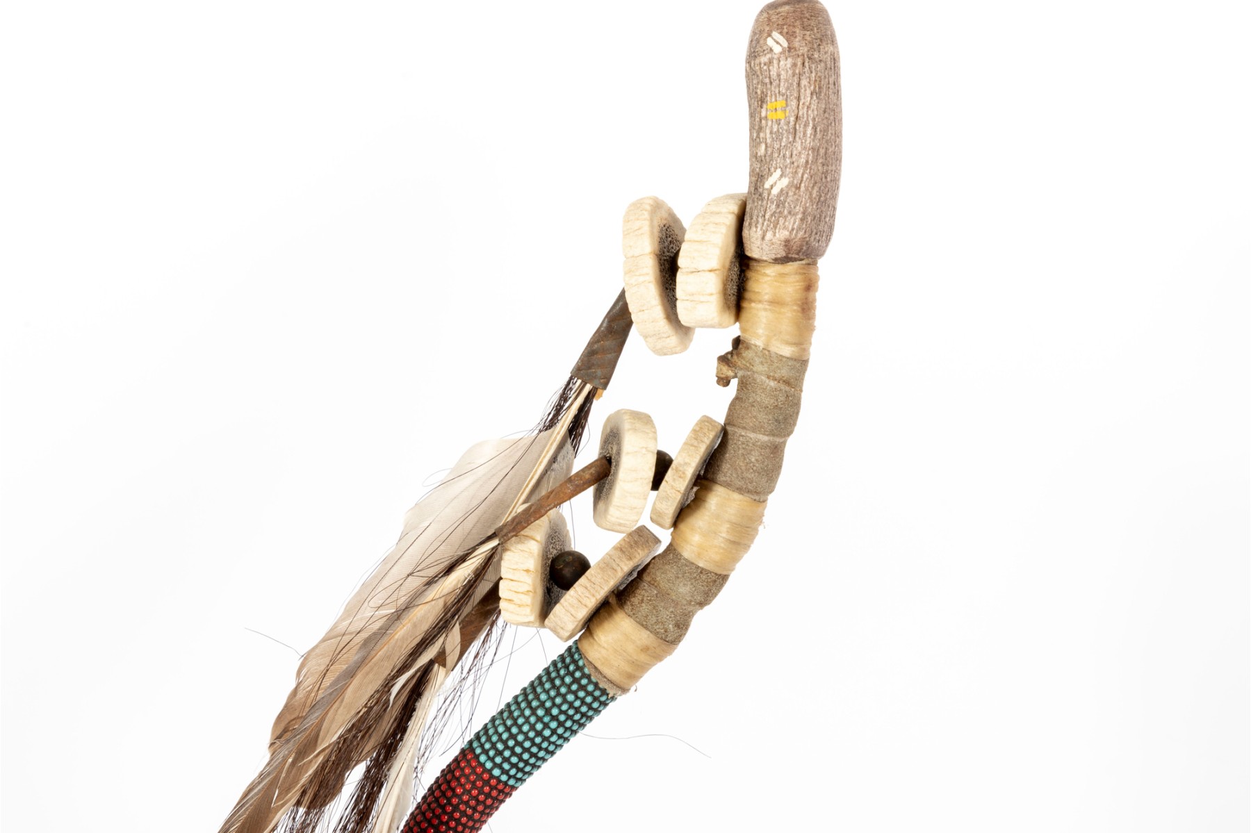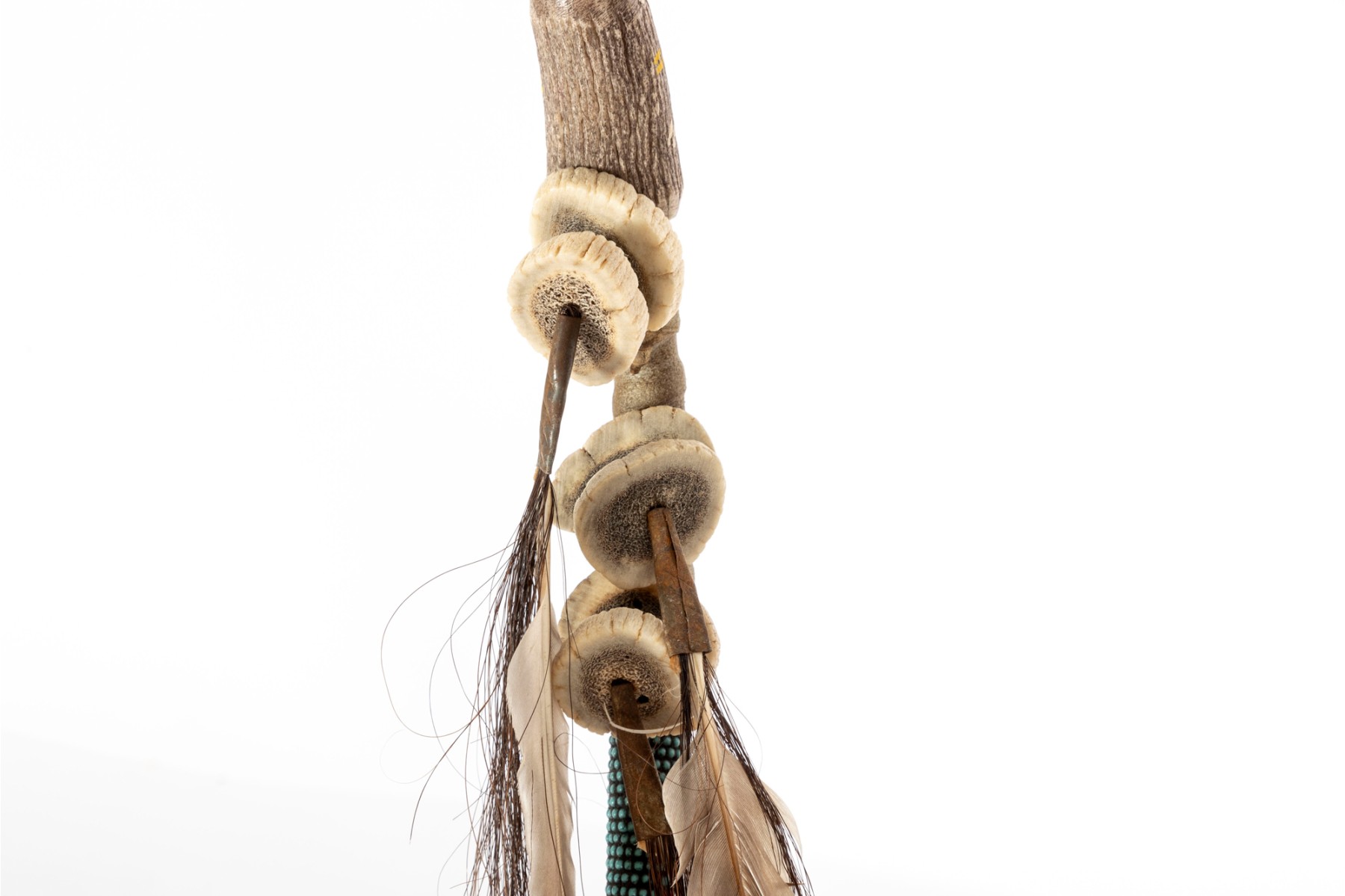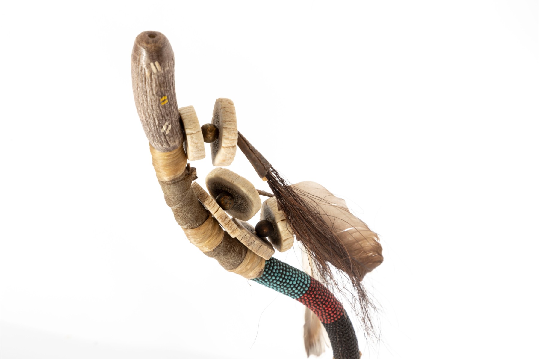 An authentic Native American peace smoking pipe for religious or ceremonial purposes, crafted from deer antlers, hide wrapped wood handles and fur.