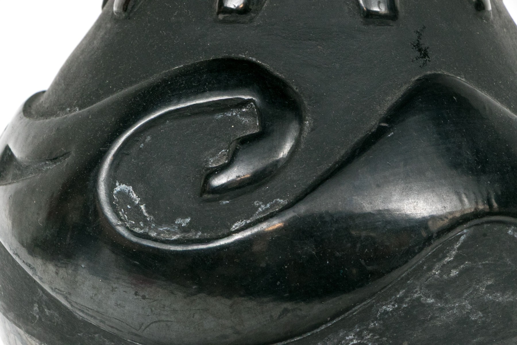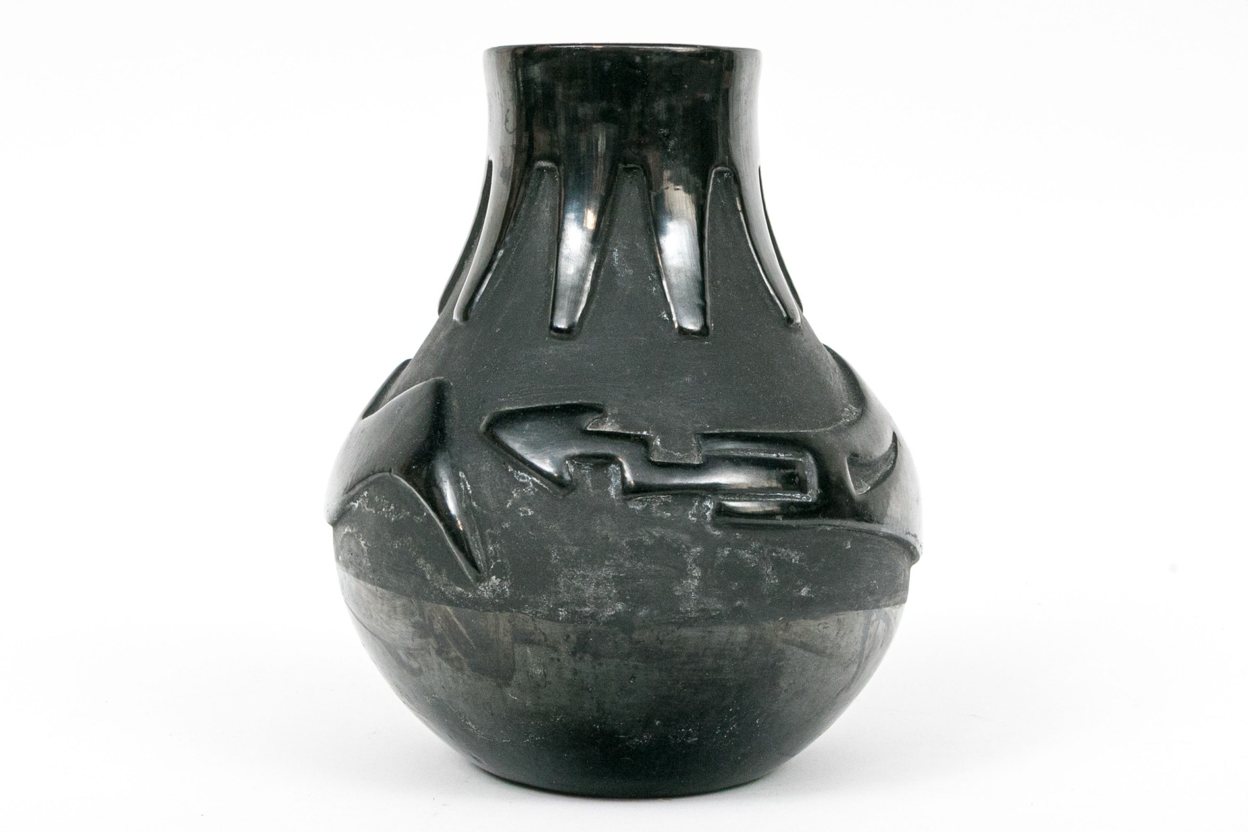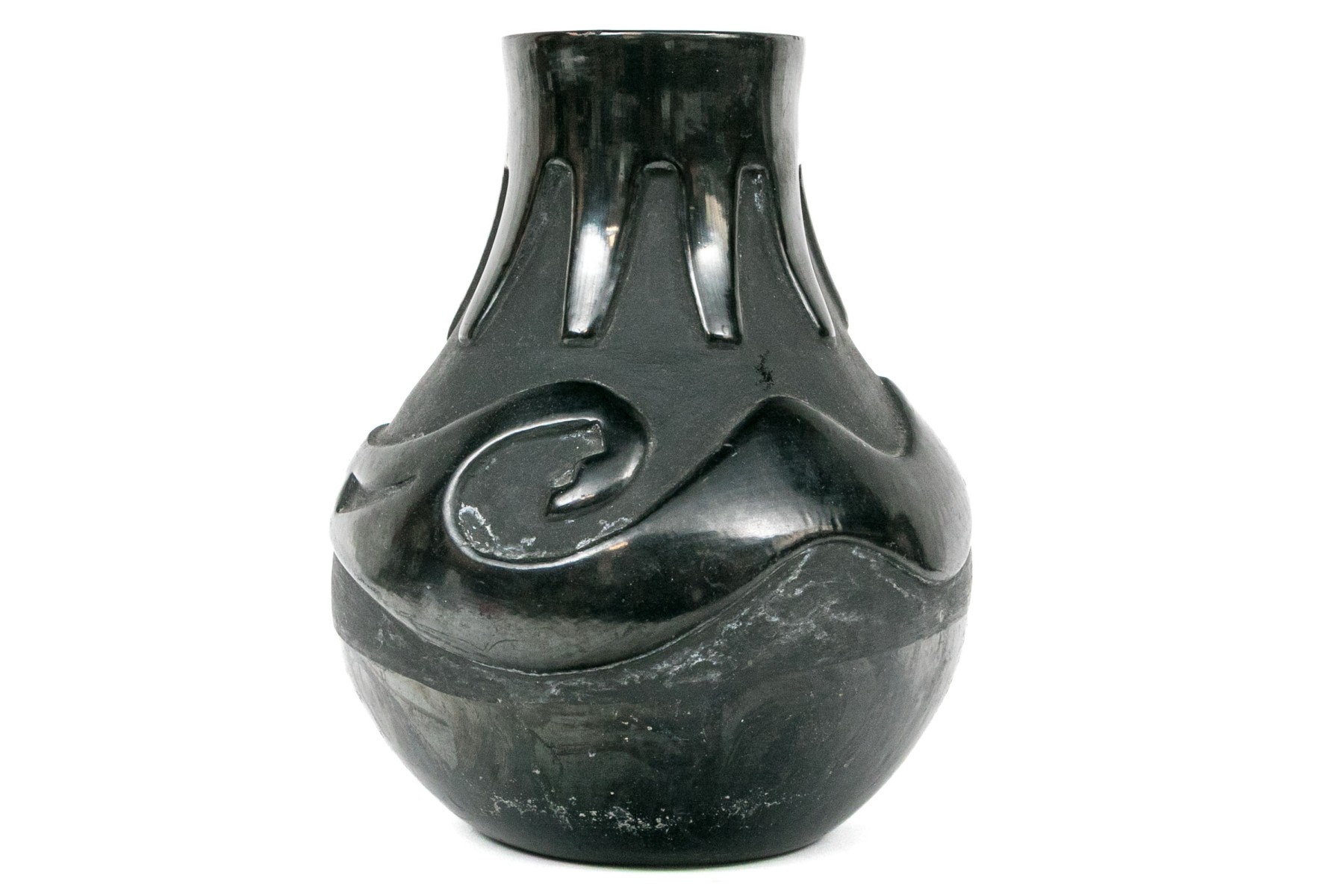 A fine Native American blackware jar with a signature on the the base, perhaps by the noted potter Maria Martinez. A tall necked globular jar in matte and shiny black with a shiny stylized serpent curling around the body, The neck with long shiny bands.