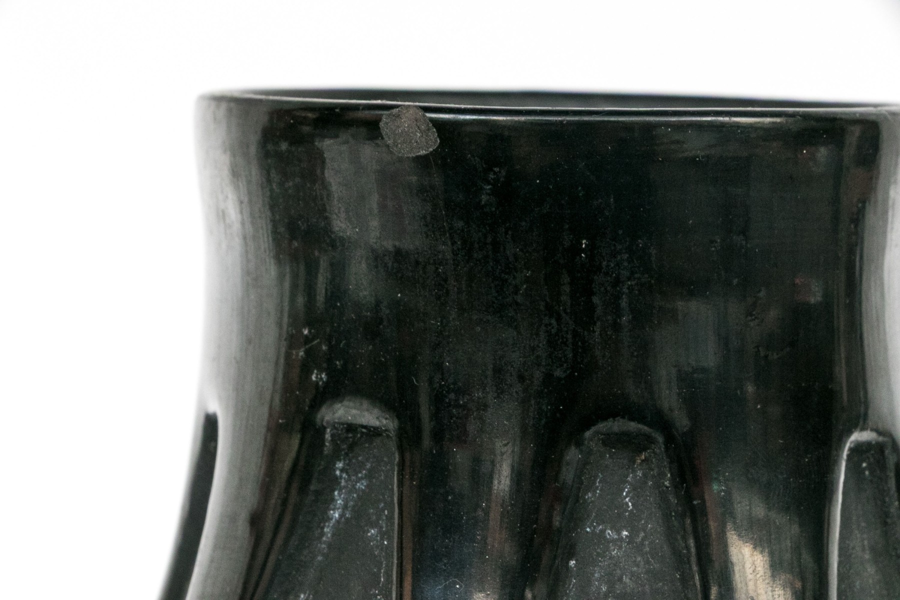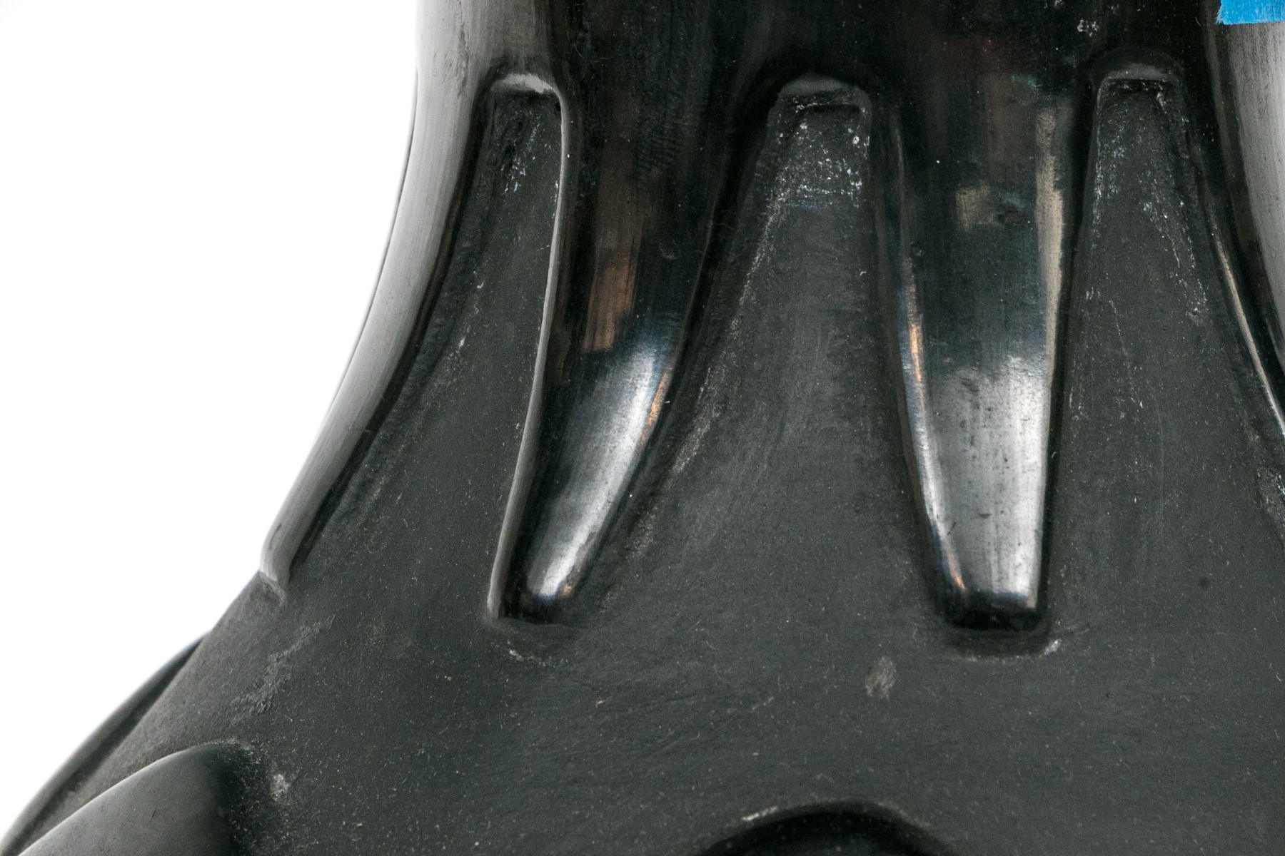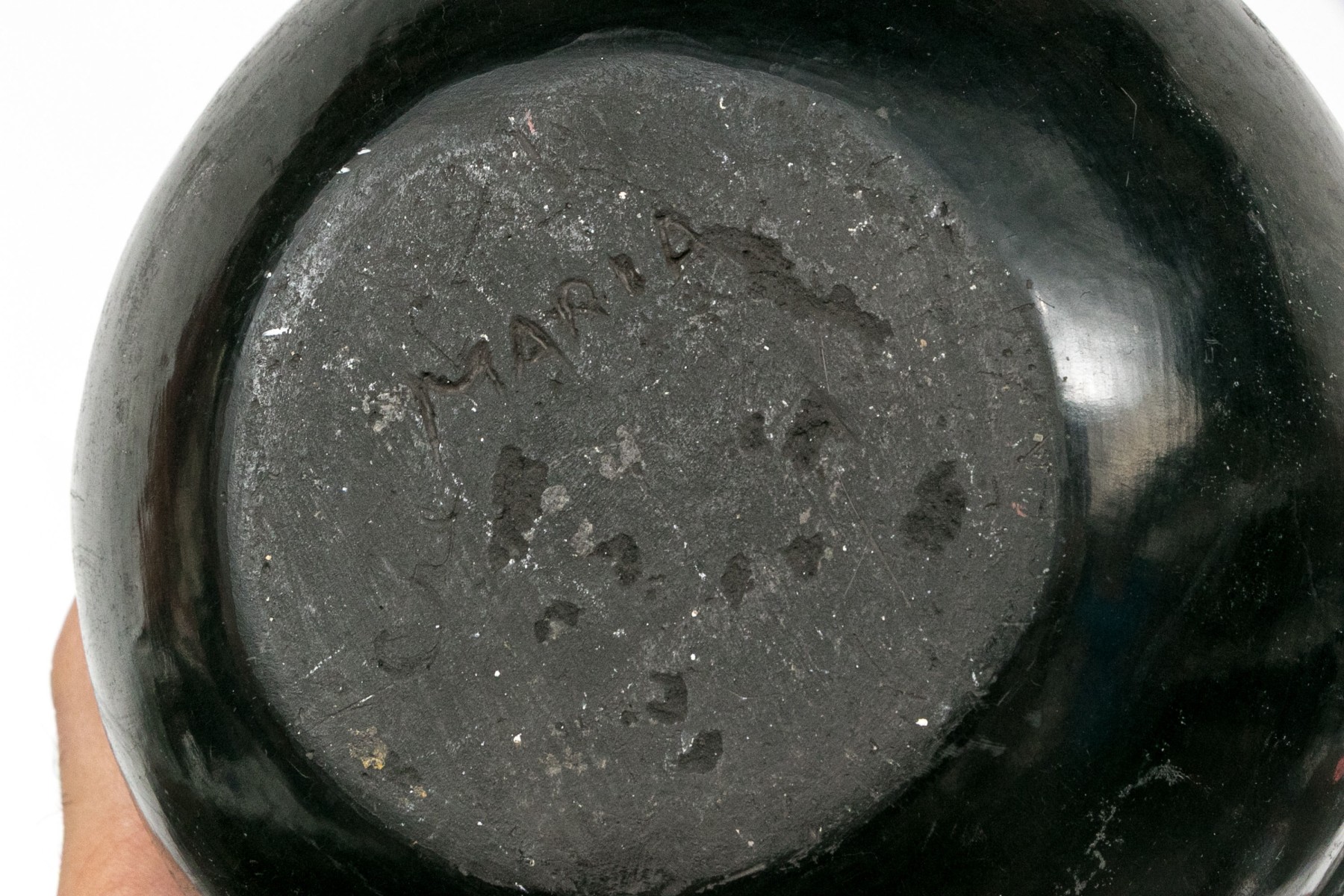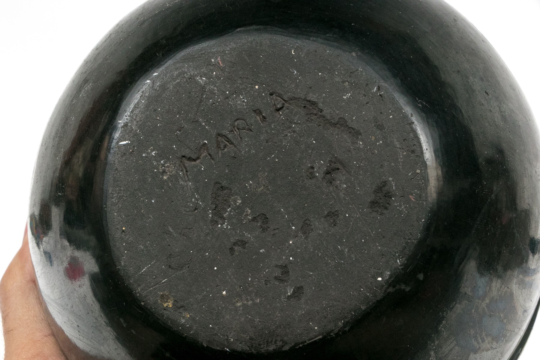 A fine Native American blackware jar with a signature on the the base, perhaps by the noted potter Maria Martinez. A tall necked globular jar in matte and shiny black with a shiny stylized serpent curling around the body, The neck with long shiny bands.