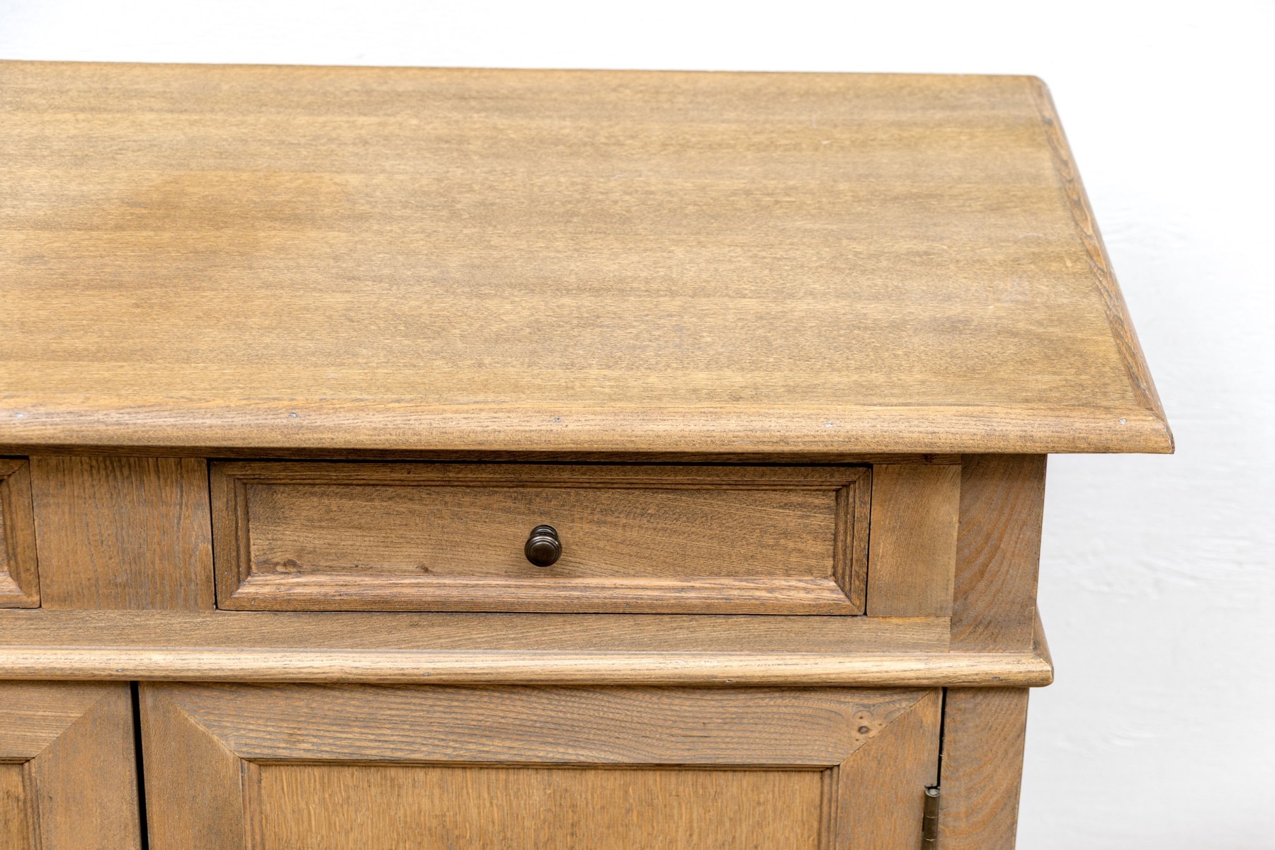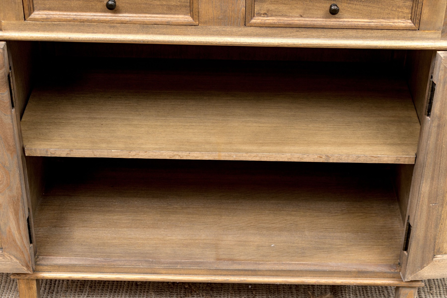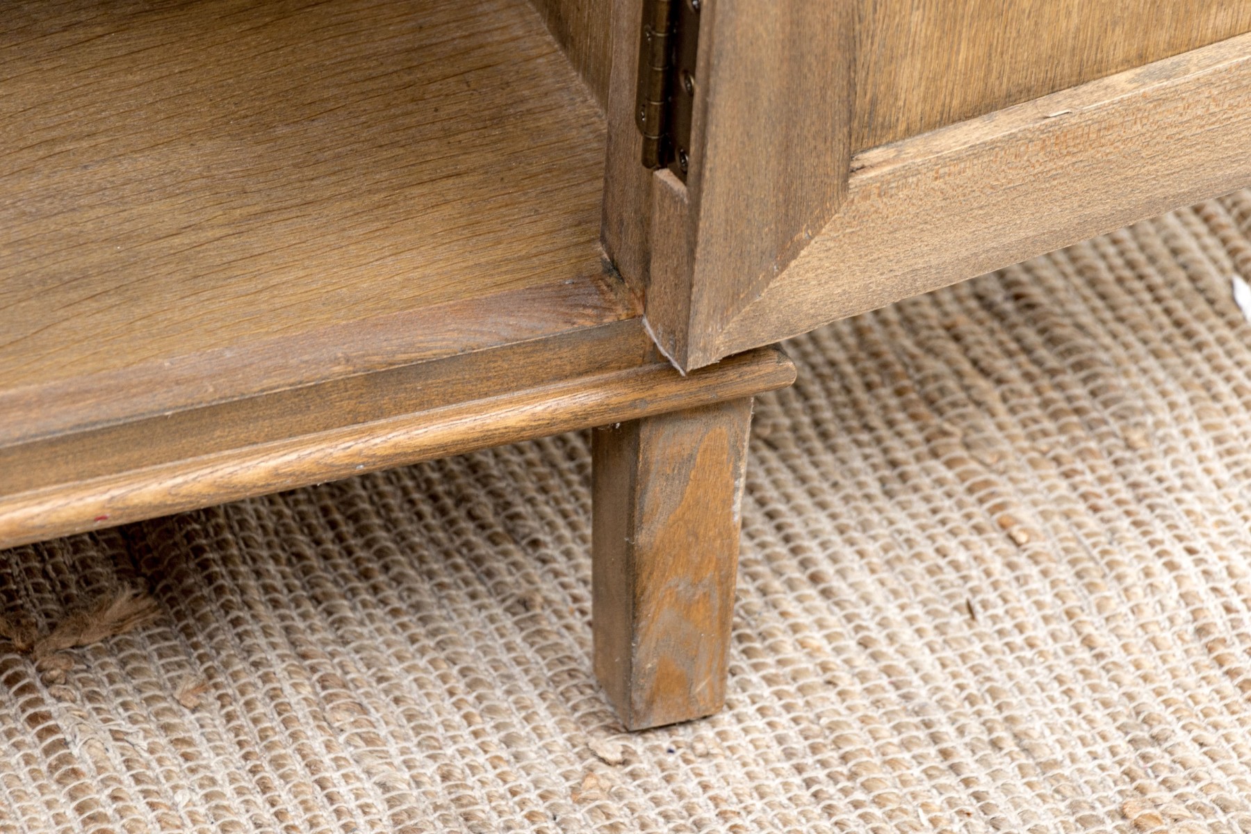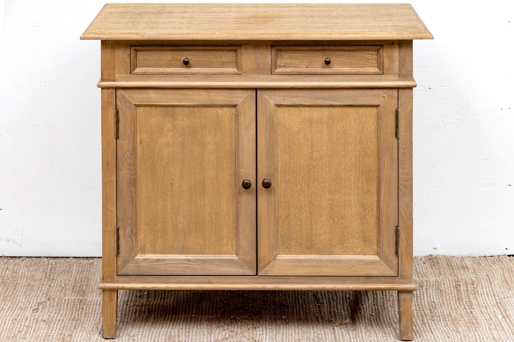 On four legs, with two cabinet doors with brass pulls opening to a shelved interior with two drawers above with brass pulls.