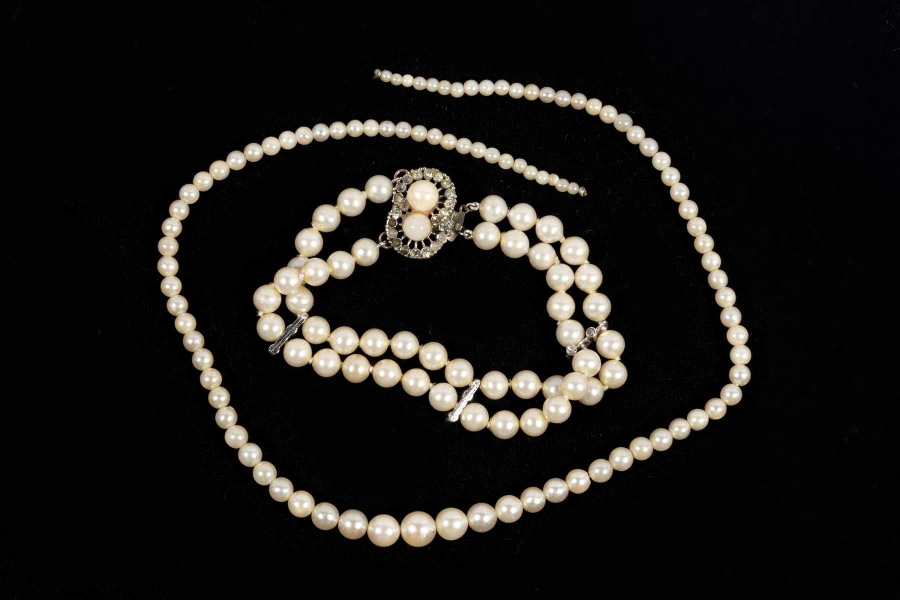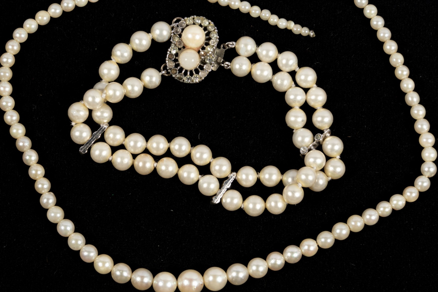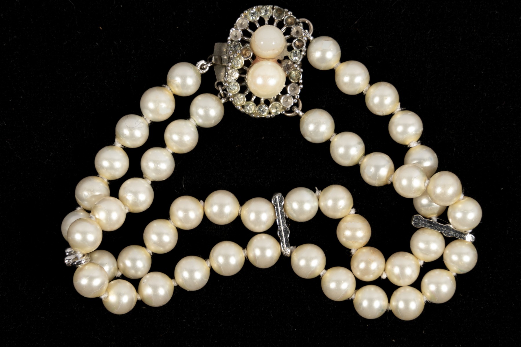 Graduated pearl beaded necklace and double strand bracelet with glass imitation diamonds set around.