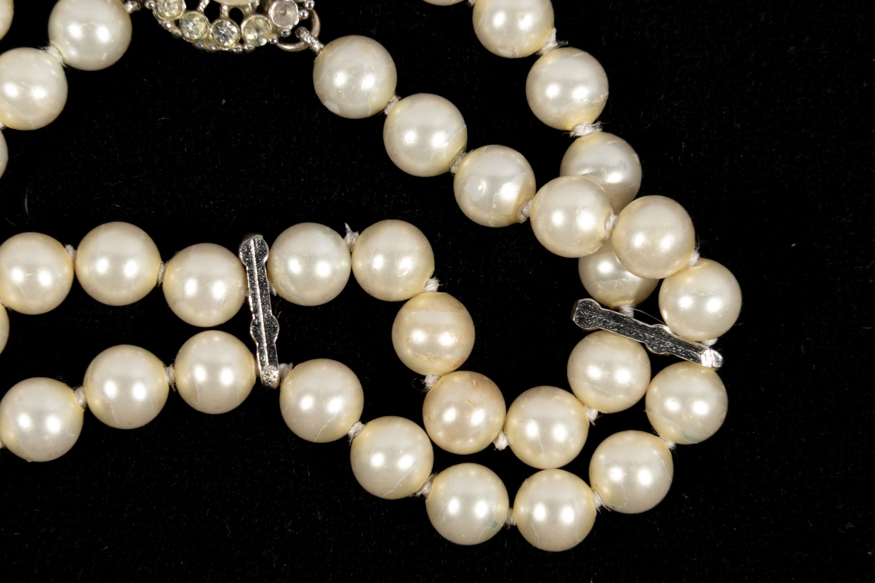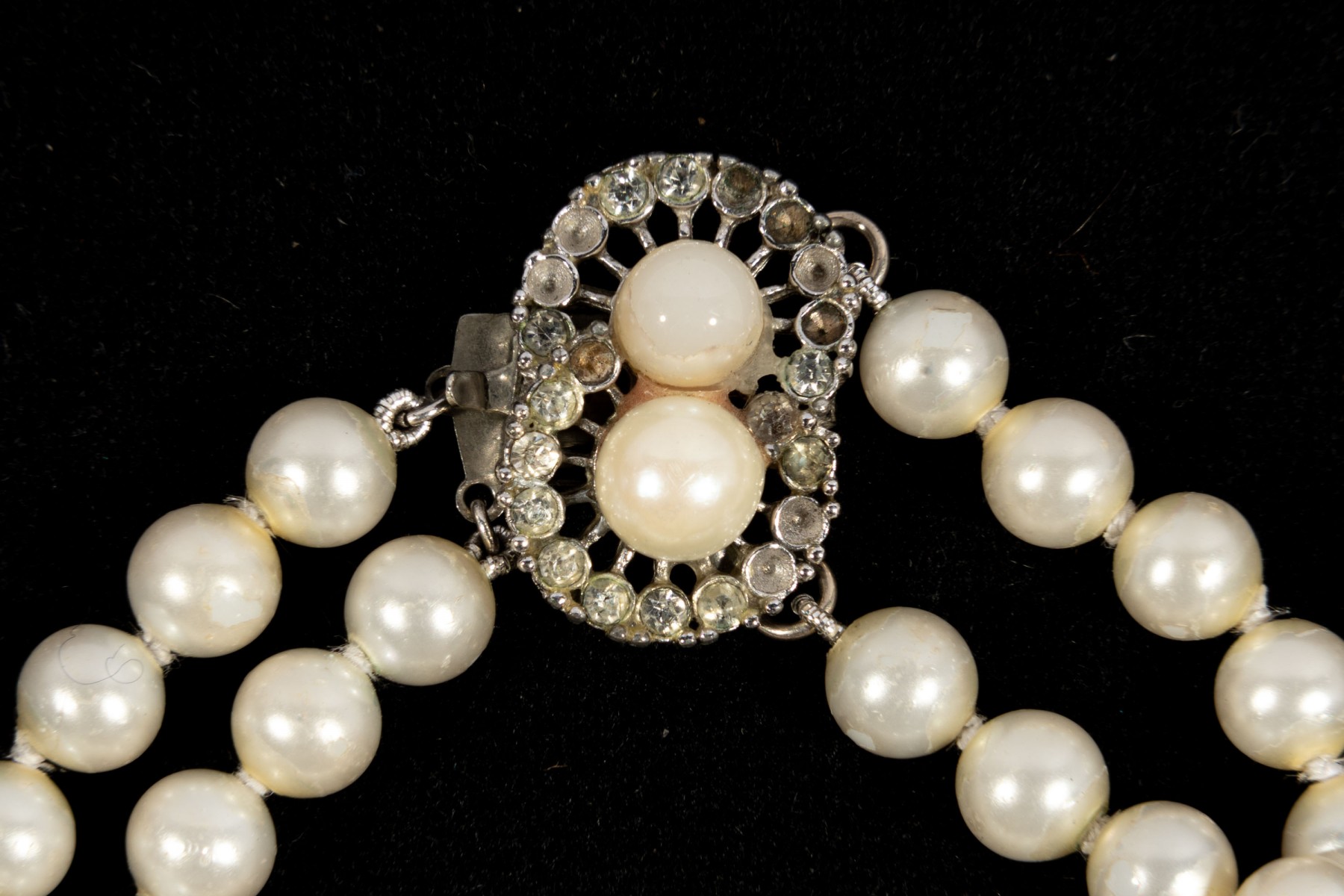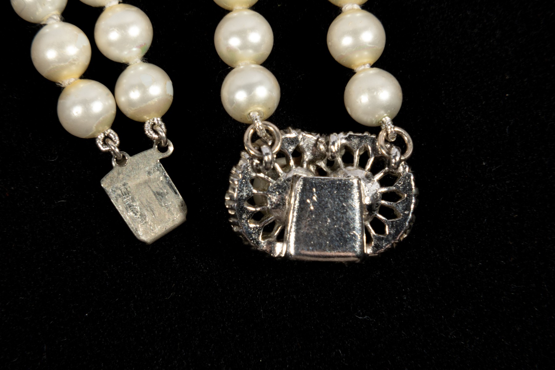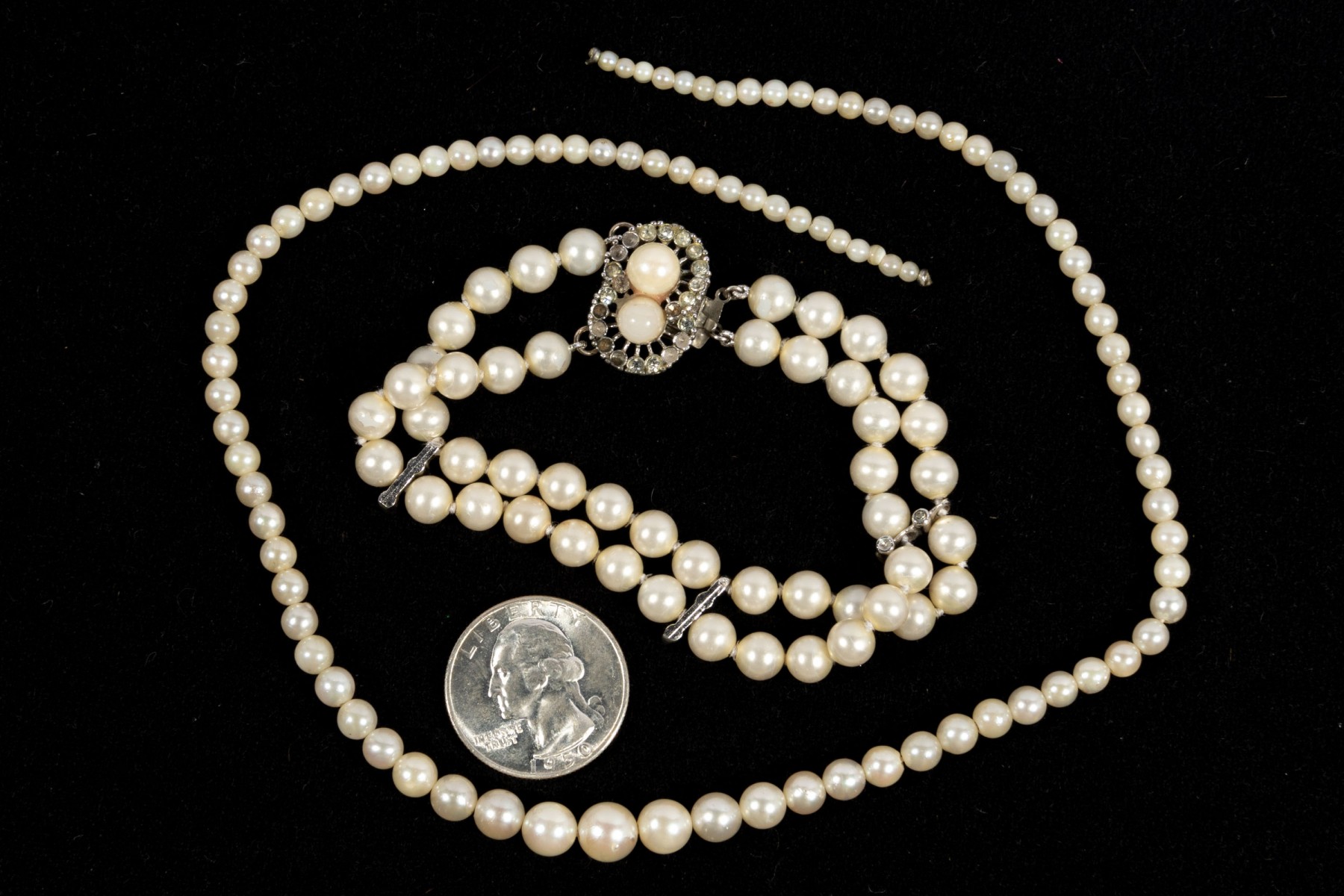 Graduated pearl beaded necklace and double strand bracelet with glass imitation diamonds set around.