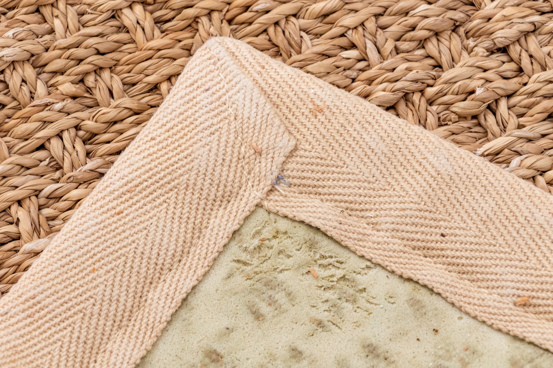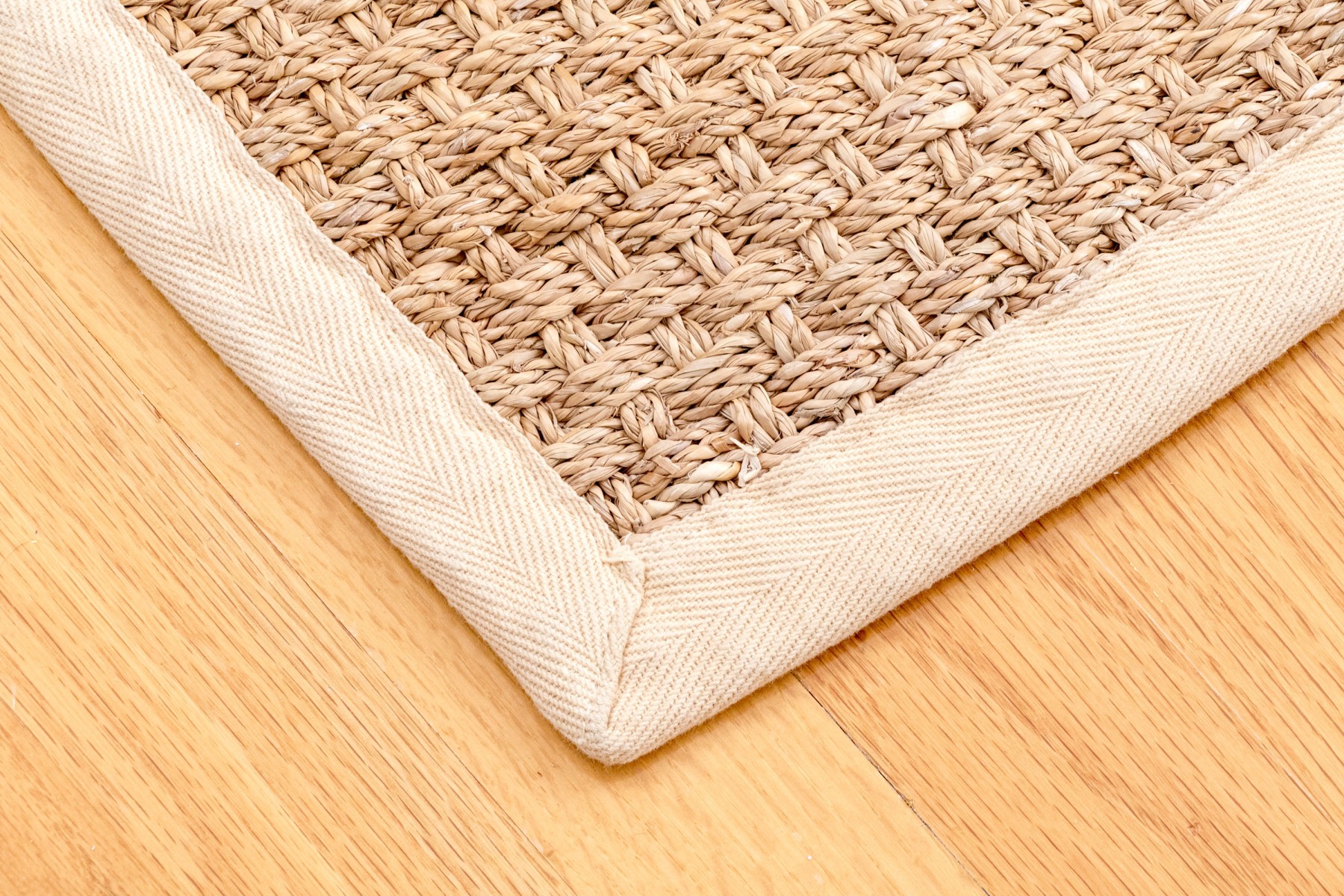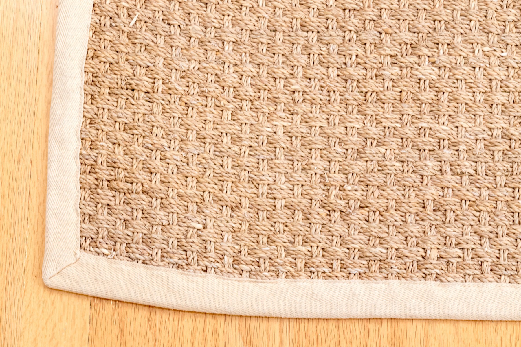 Woven pattern, natural seagrass bound in cream twill border, with latex backing.
