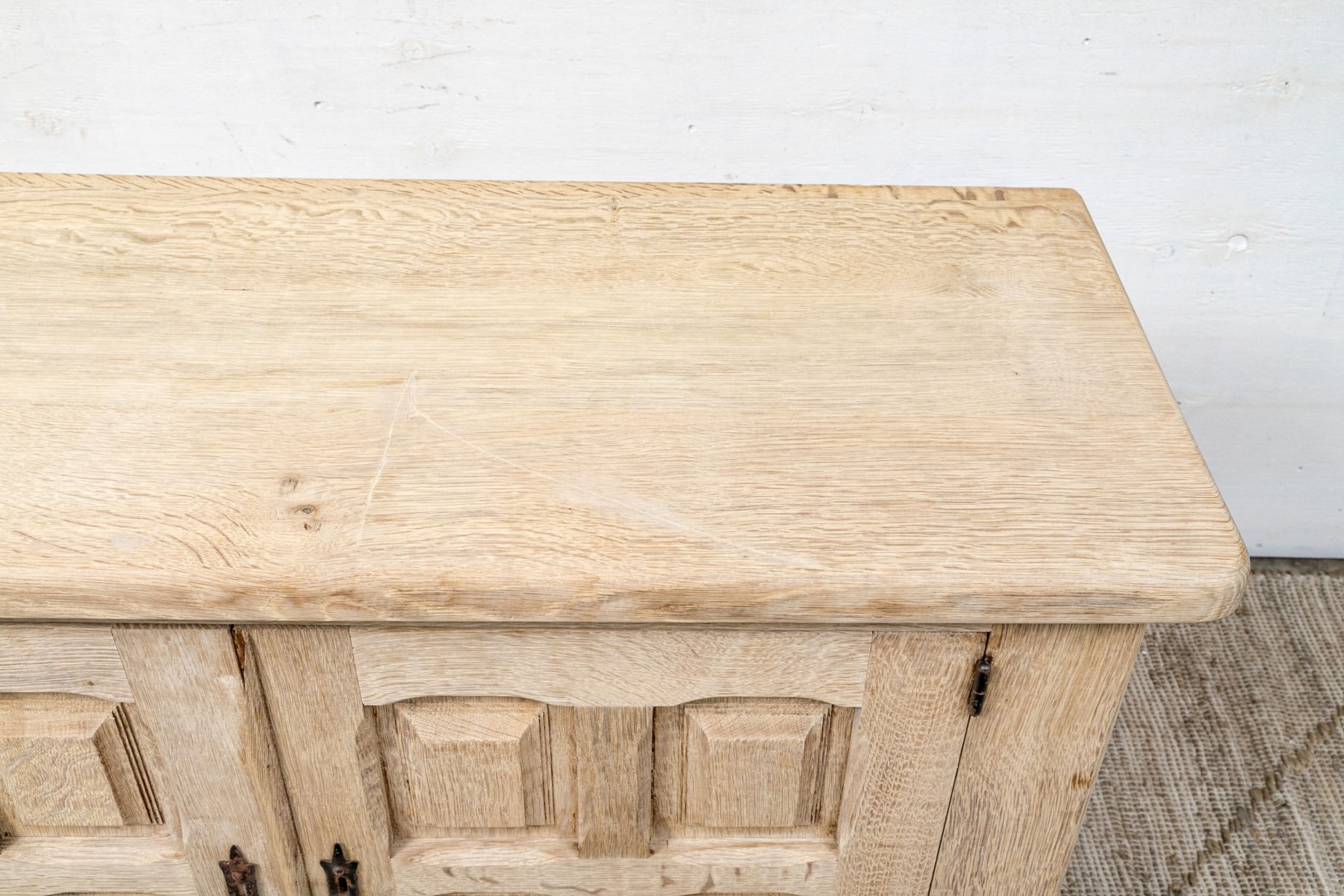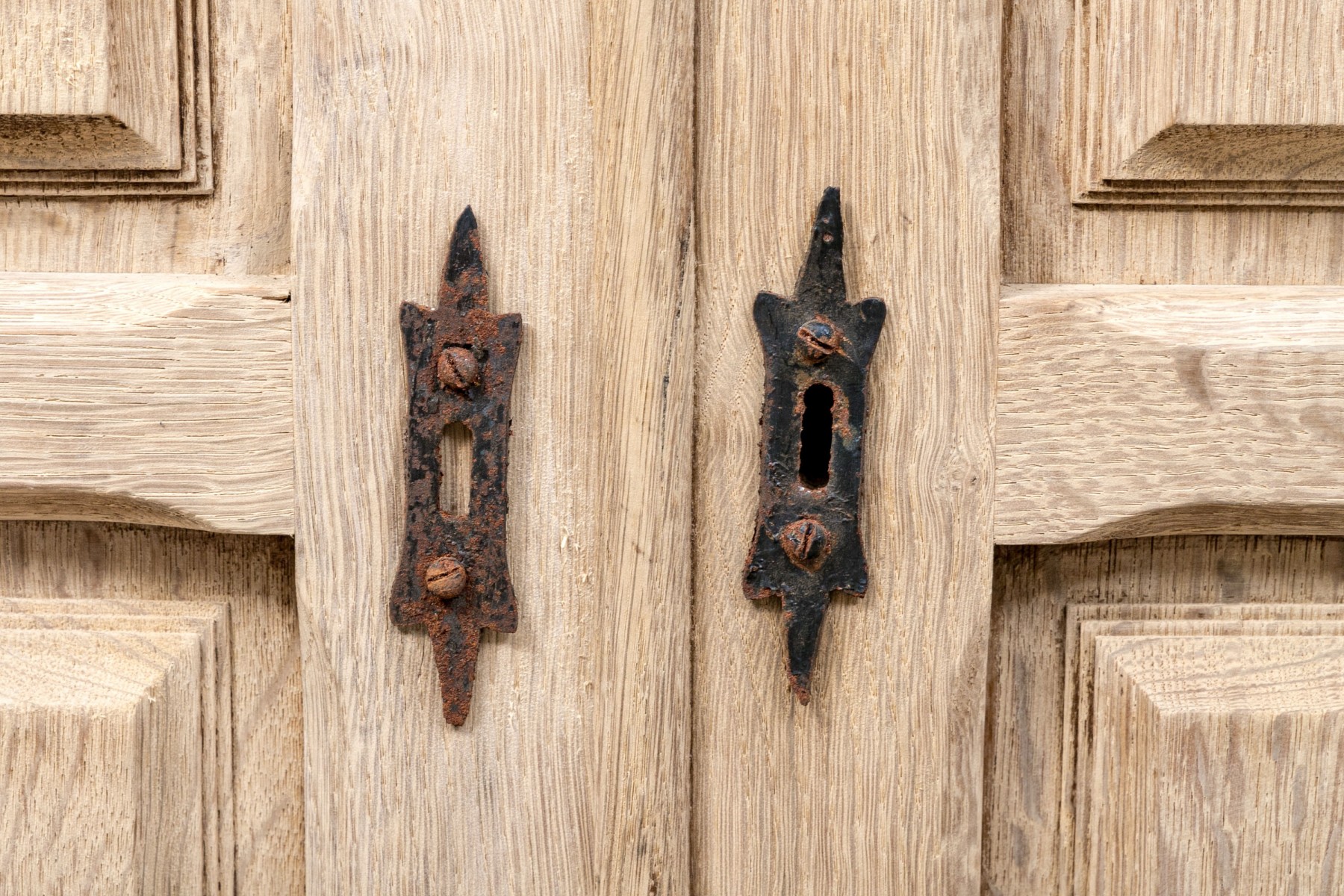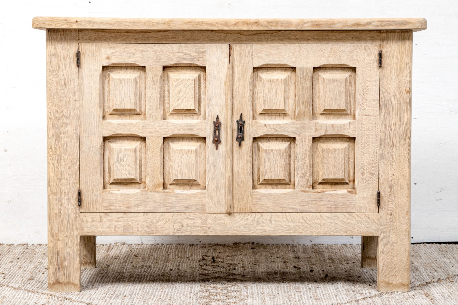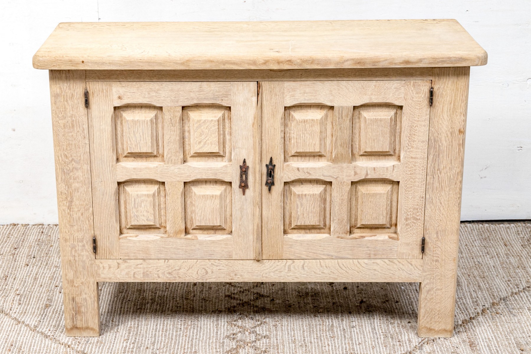 A cabinet with two doors constructed with carved recessed panels and metal mounts, opening to a shelf. Raised on square legs.