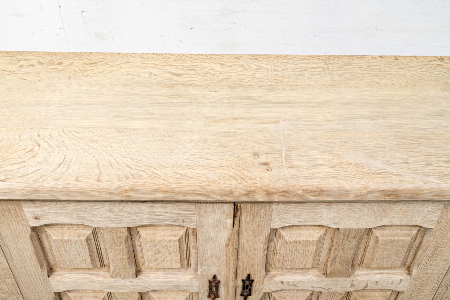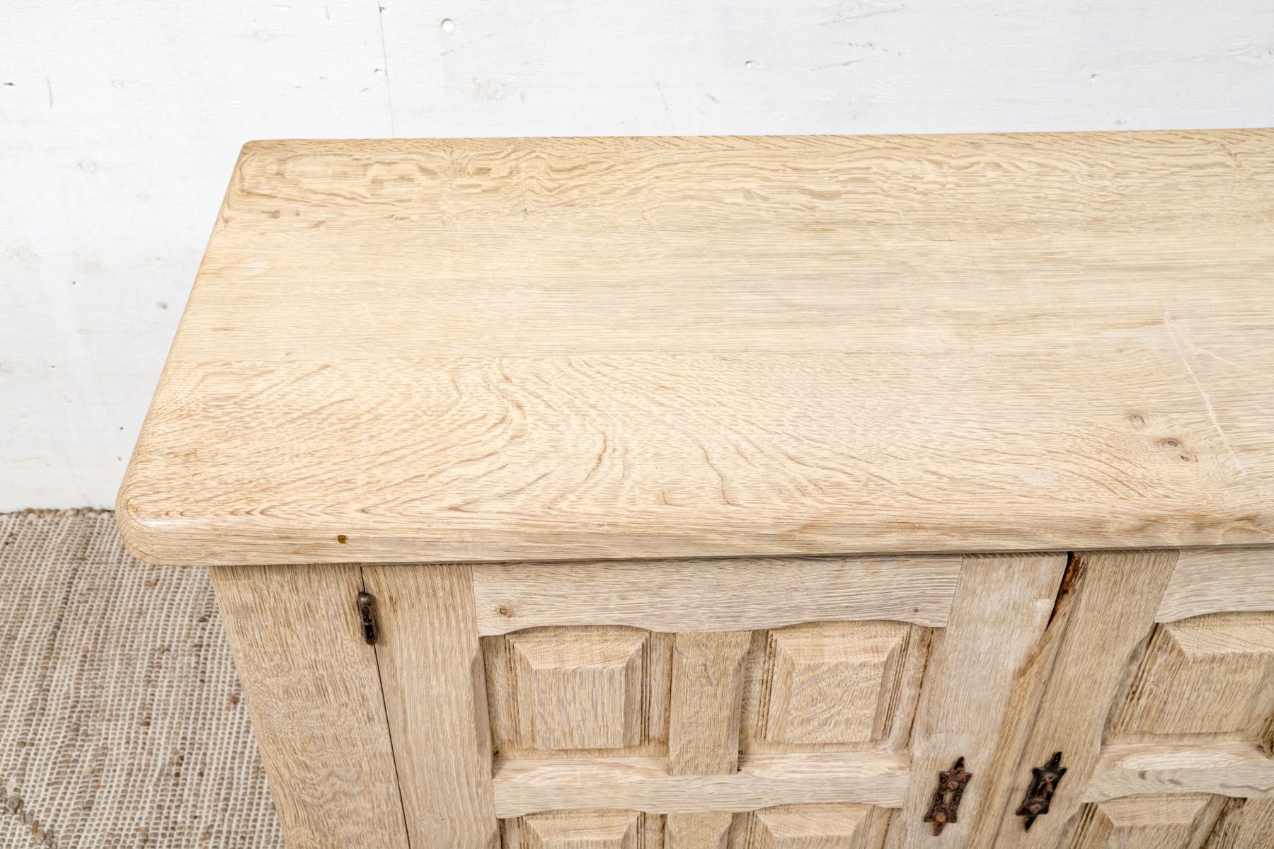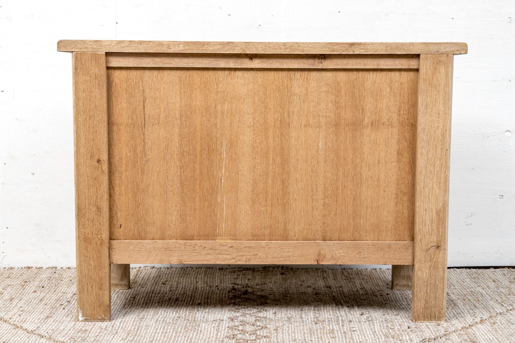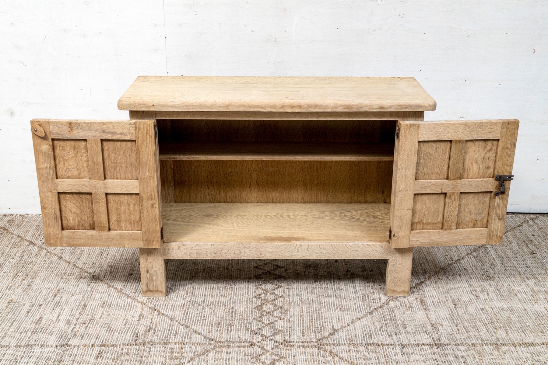 A cabinet with two doors constructed with carved recessed panels and metal mounts, opening to a shelf. Raised on square legs.