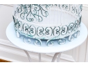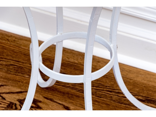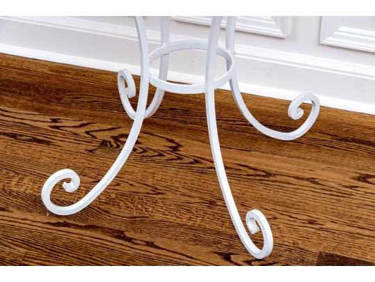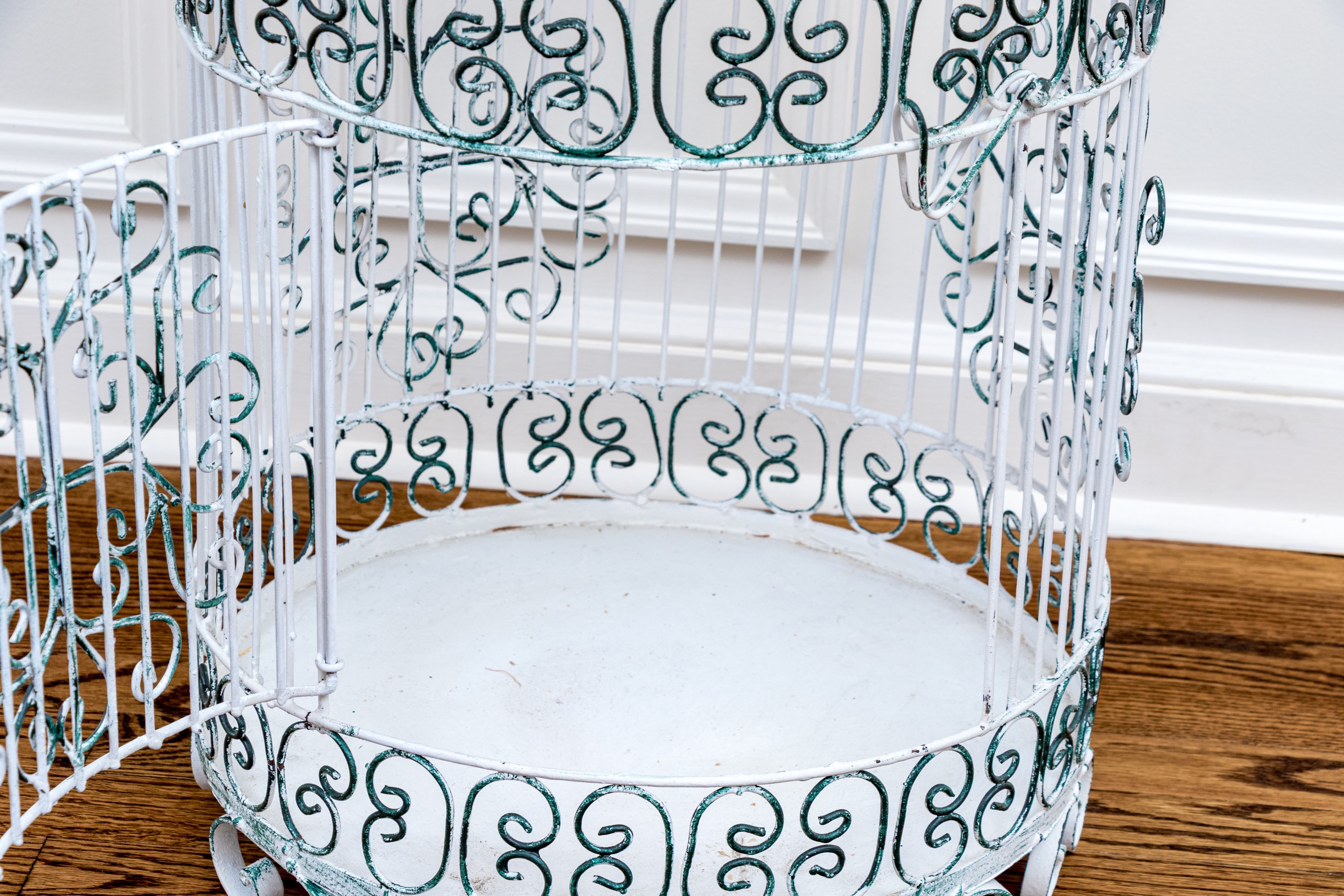 The cylindrical iron birdcage with a dome top and scrolled or Chinoiserie style lingzhi form feet. The bars are painted white over green and the scrolled bands, panel and door wire work are in black. A rod is at the top with a loop for hanging. Along with a white painted iron stand with outswept scrolled legs and milk glass circular top.