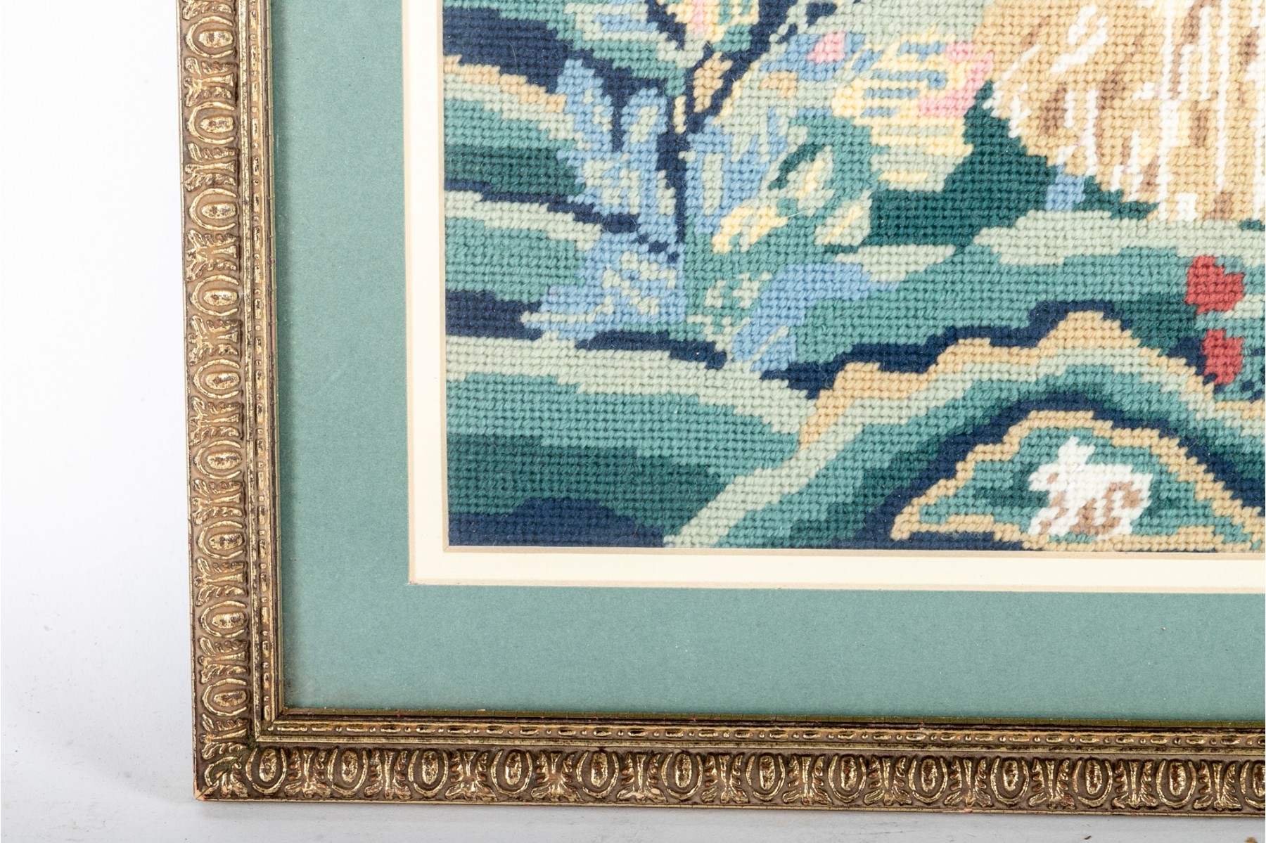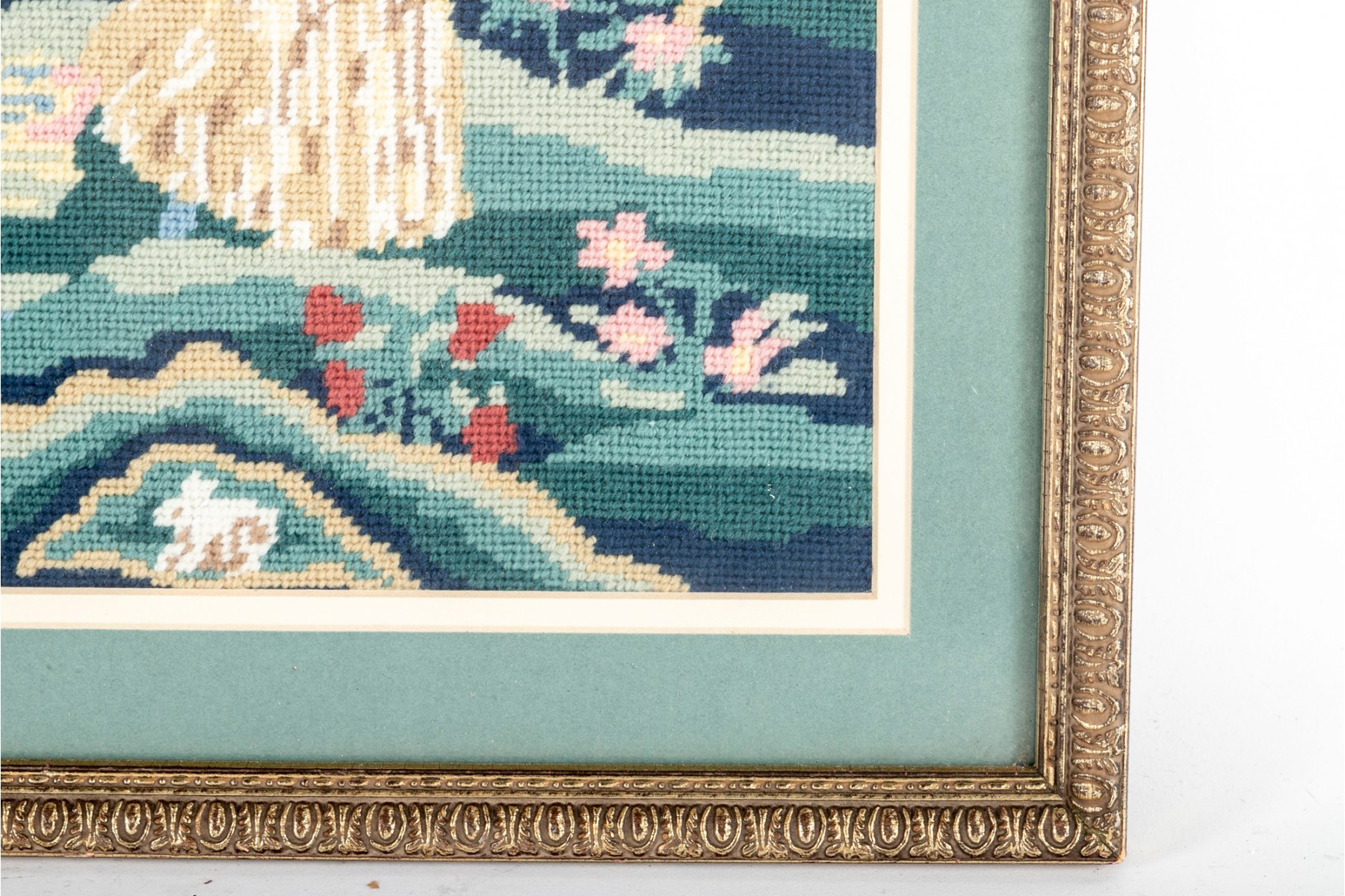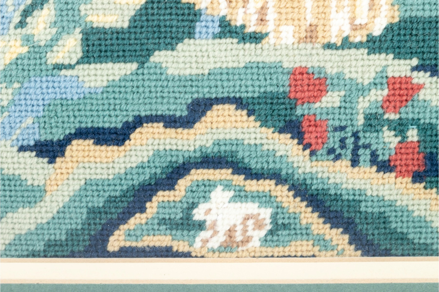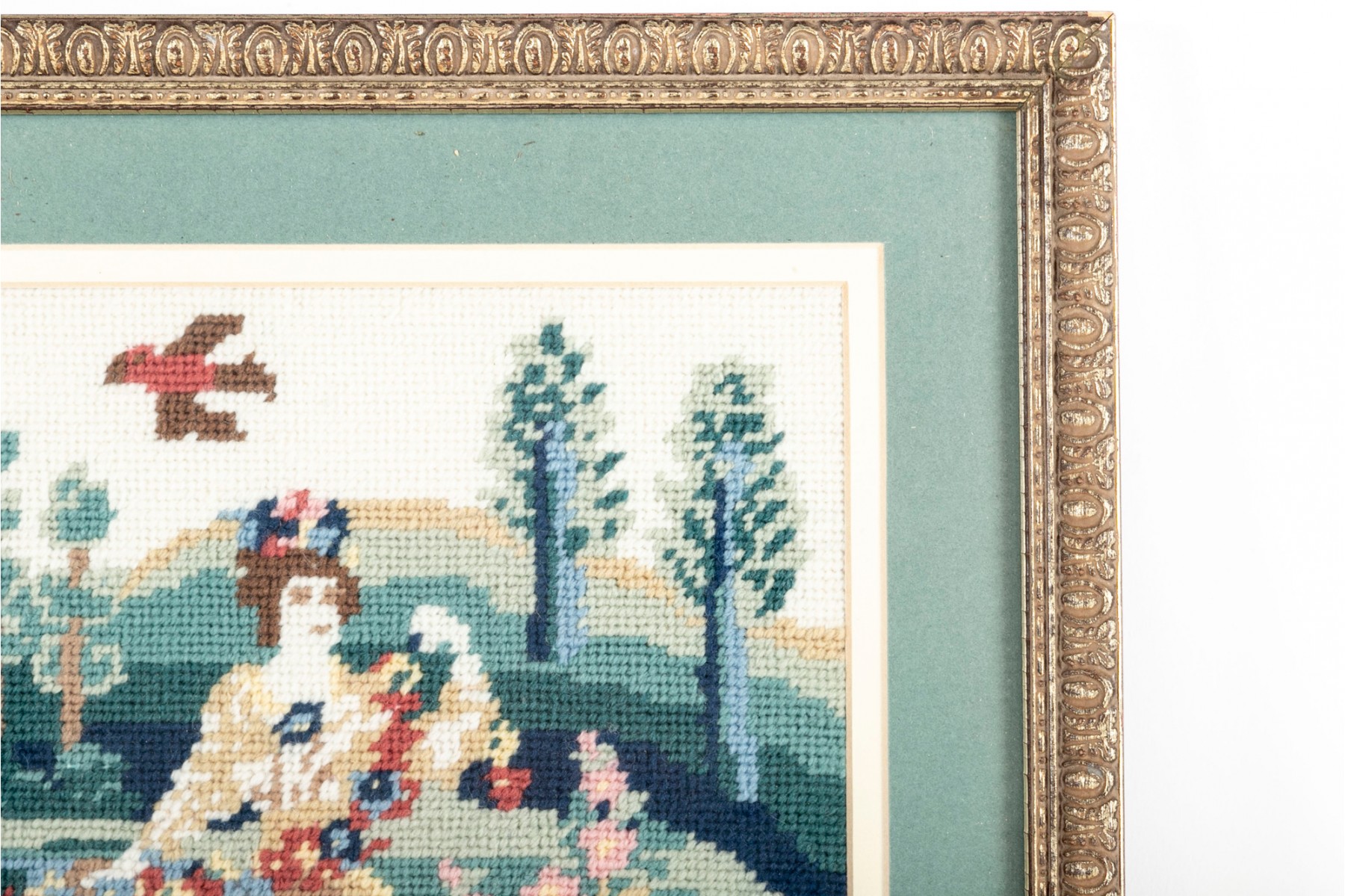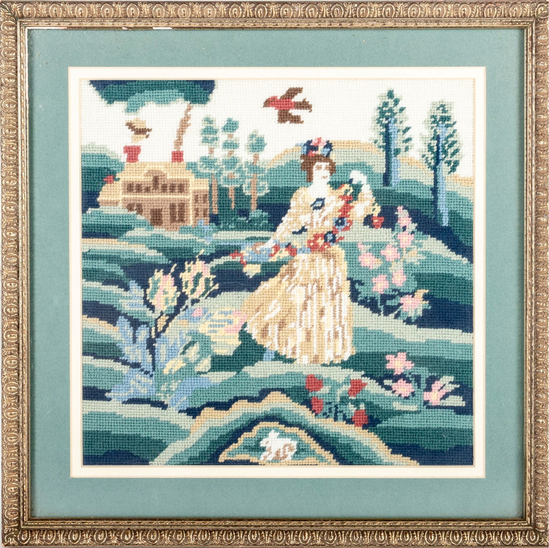 A wonderful needlepoint embroidery depicting a woman in a long yellow dress enjoying nature, wearing a crown of flowers while carrying a floral garland. She walks along a lush yard of flowers, with striated hues of teal, blue, and yellow leading to a brown house on the horizon. Displayed behind glass with tiered teal and white mats in a gray-gilt frame with fine foliate relief.