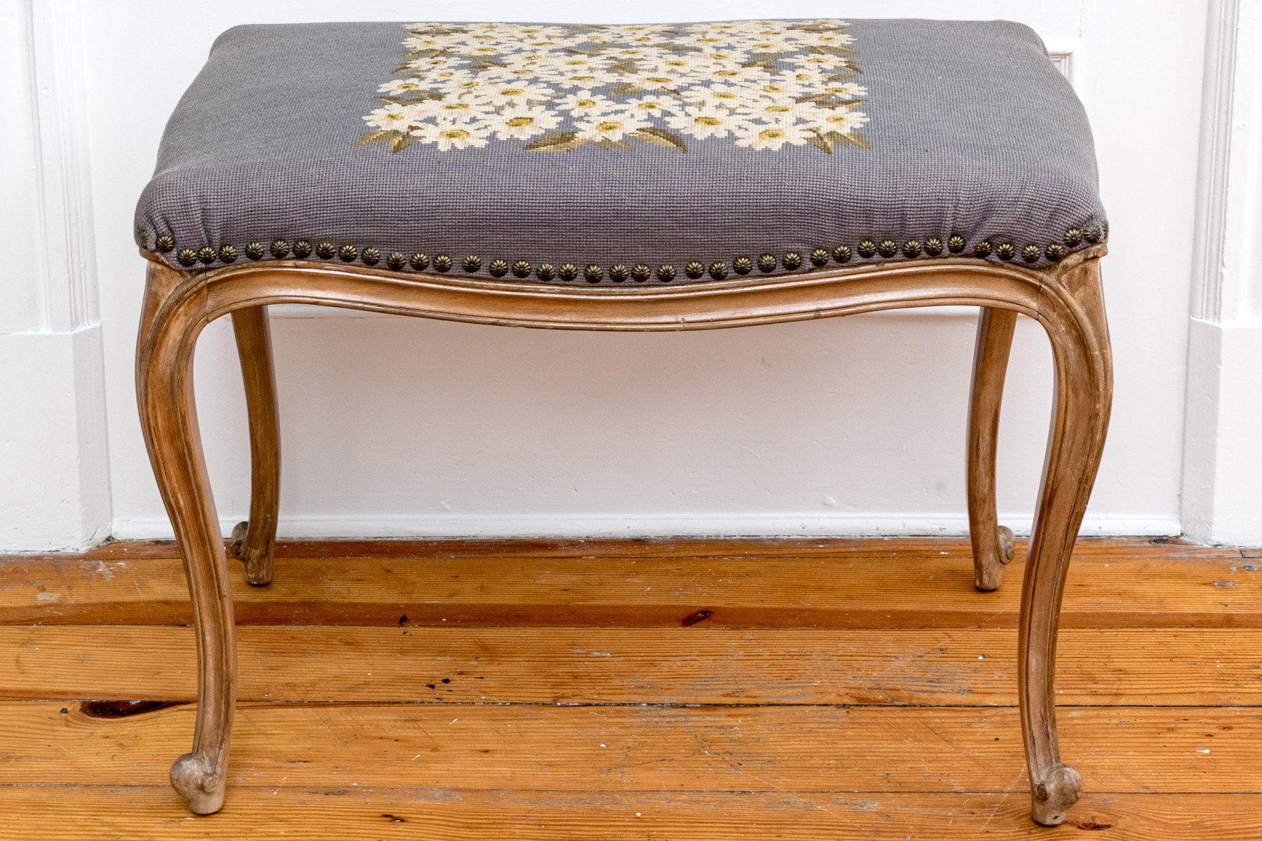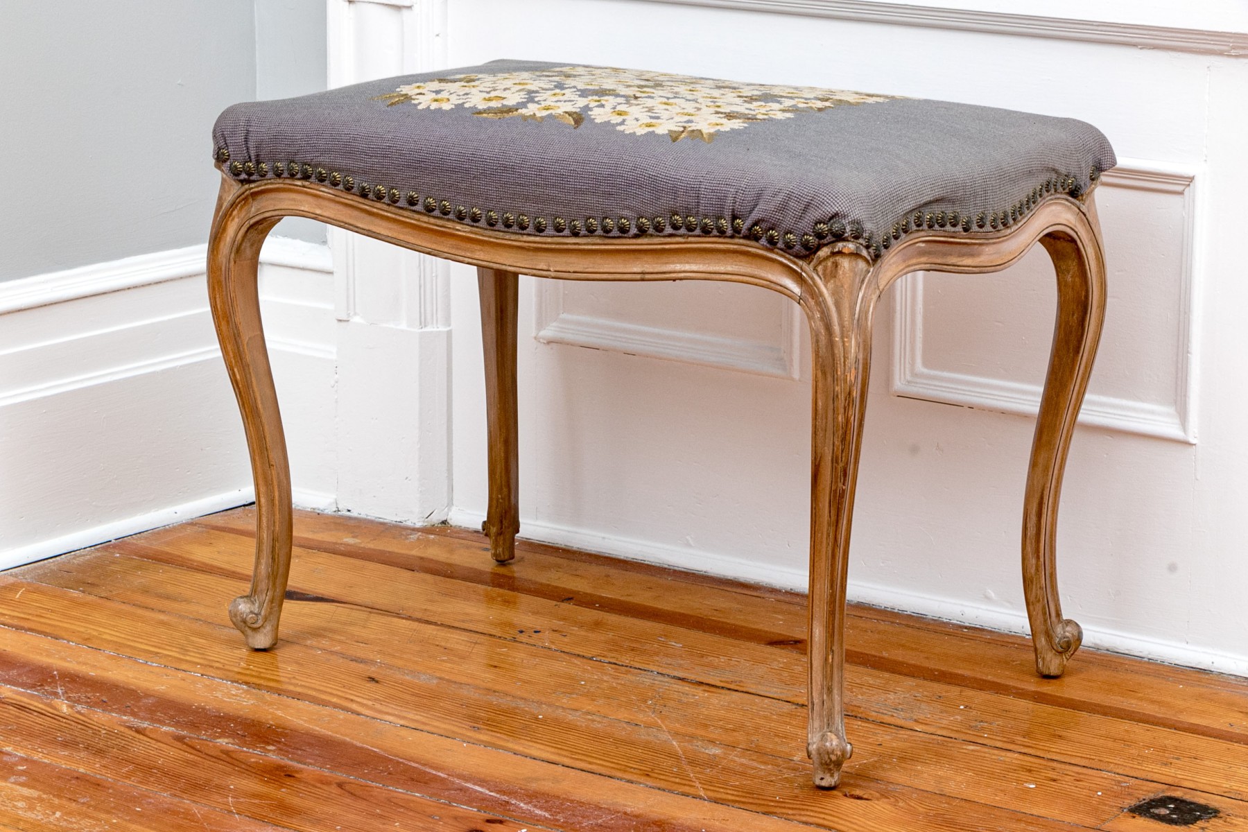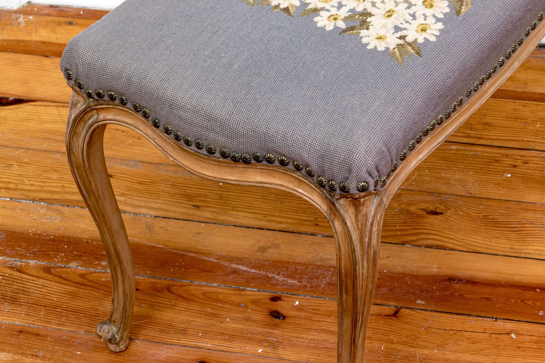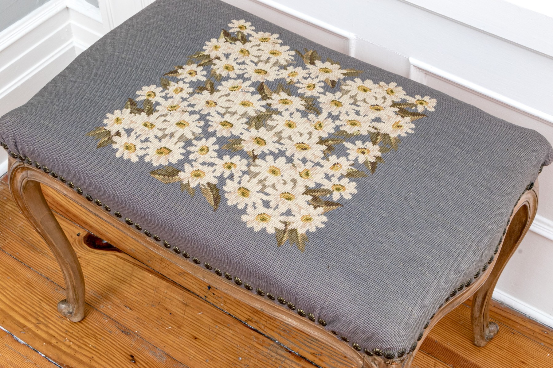 A delightful Louis XV style stool upholstered in lavender hued fabric with a decorative floral nailhead trim complimenting white and yellow needlepoint flowers at the seat center. Raised on a honeyed brown frame with cabriole legs over scrolled feet.