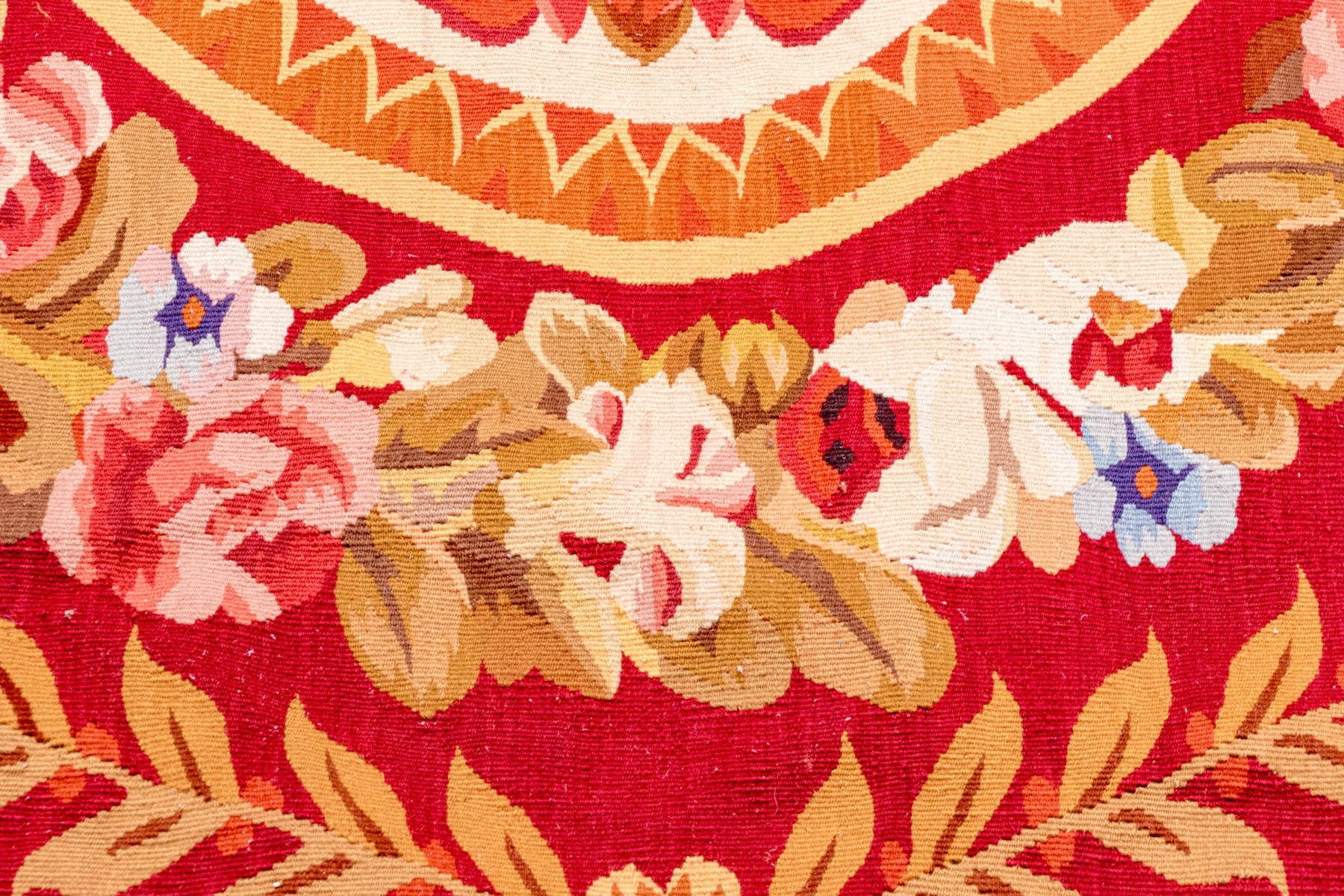 Red ground central field with foliate center reserve surrounded by floral circular motif with leafy branch surround and two shell ends. Floral band around the exterior of the red ground central field surrounded by yellow ground field with chrysanthemum heds on dark ground squares.