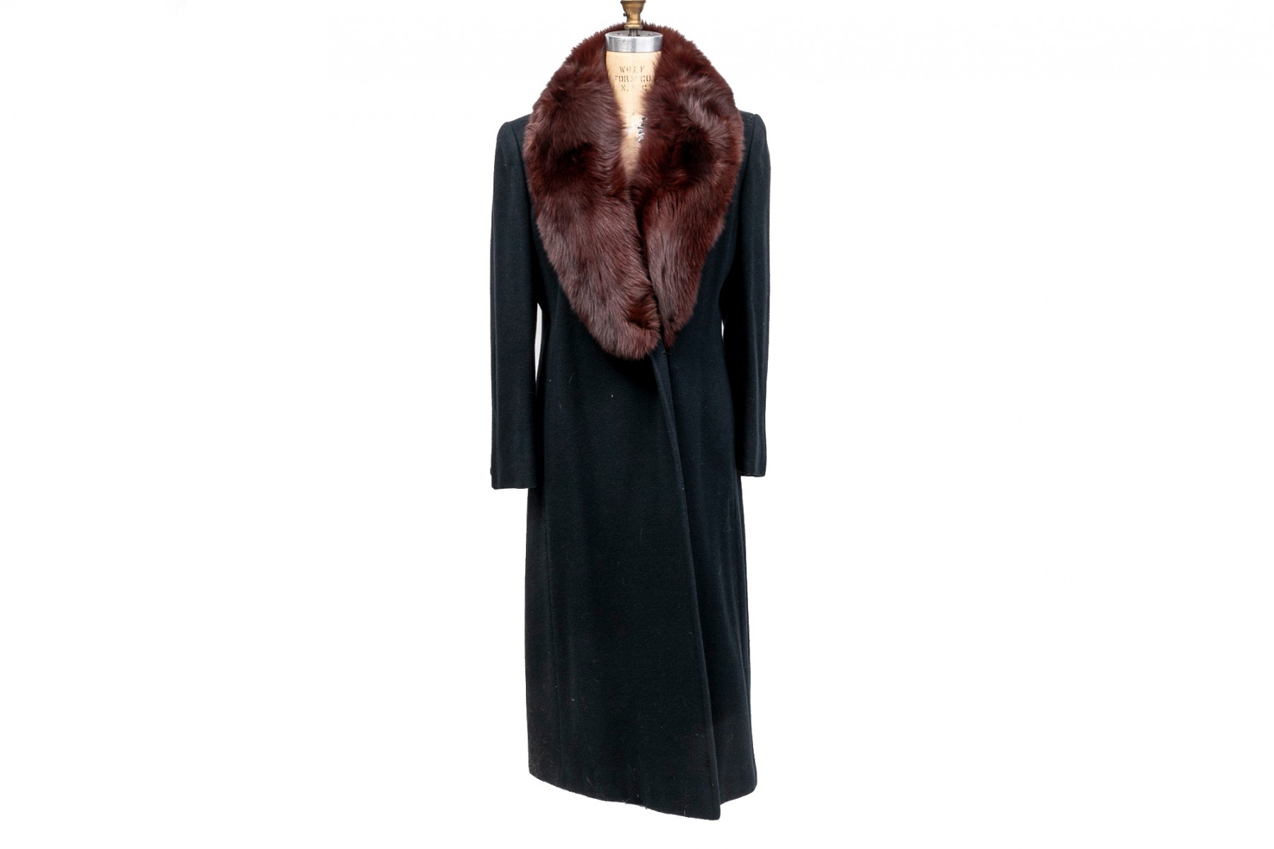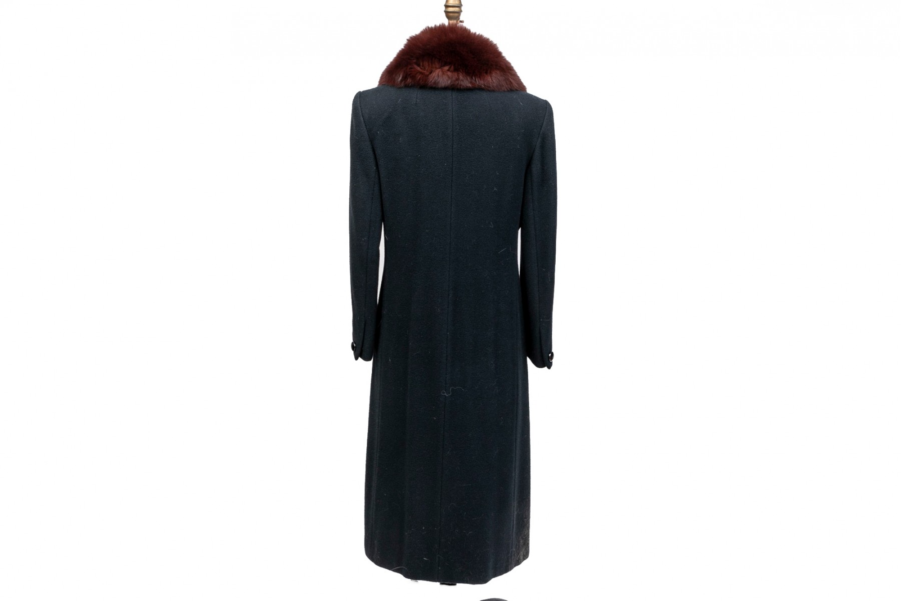 Neiman Marcus dark blue trench style cashmere coat. Red-Brown colored fur collar