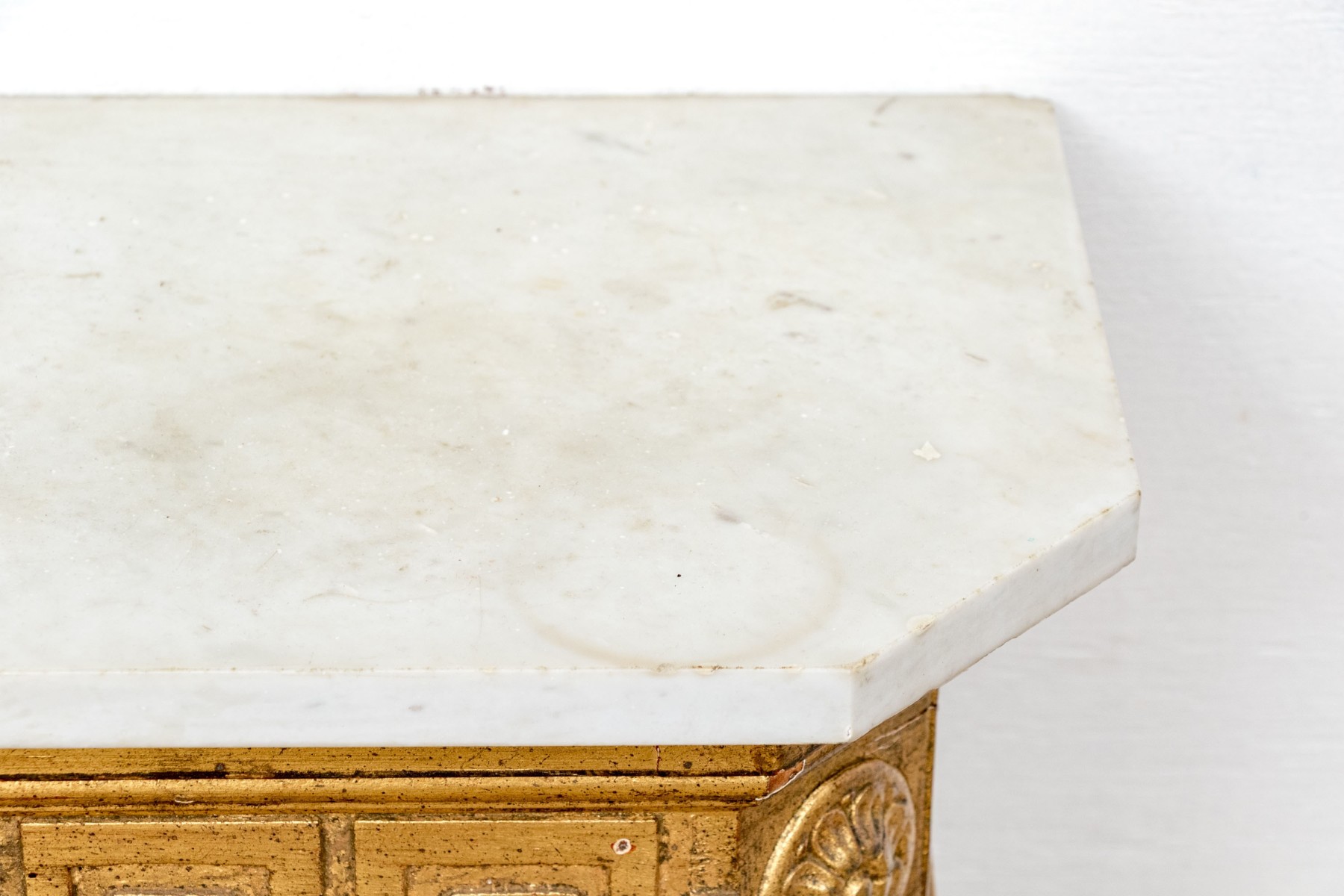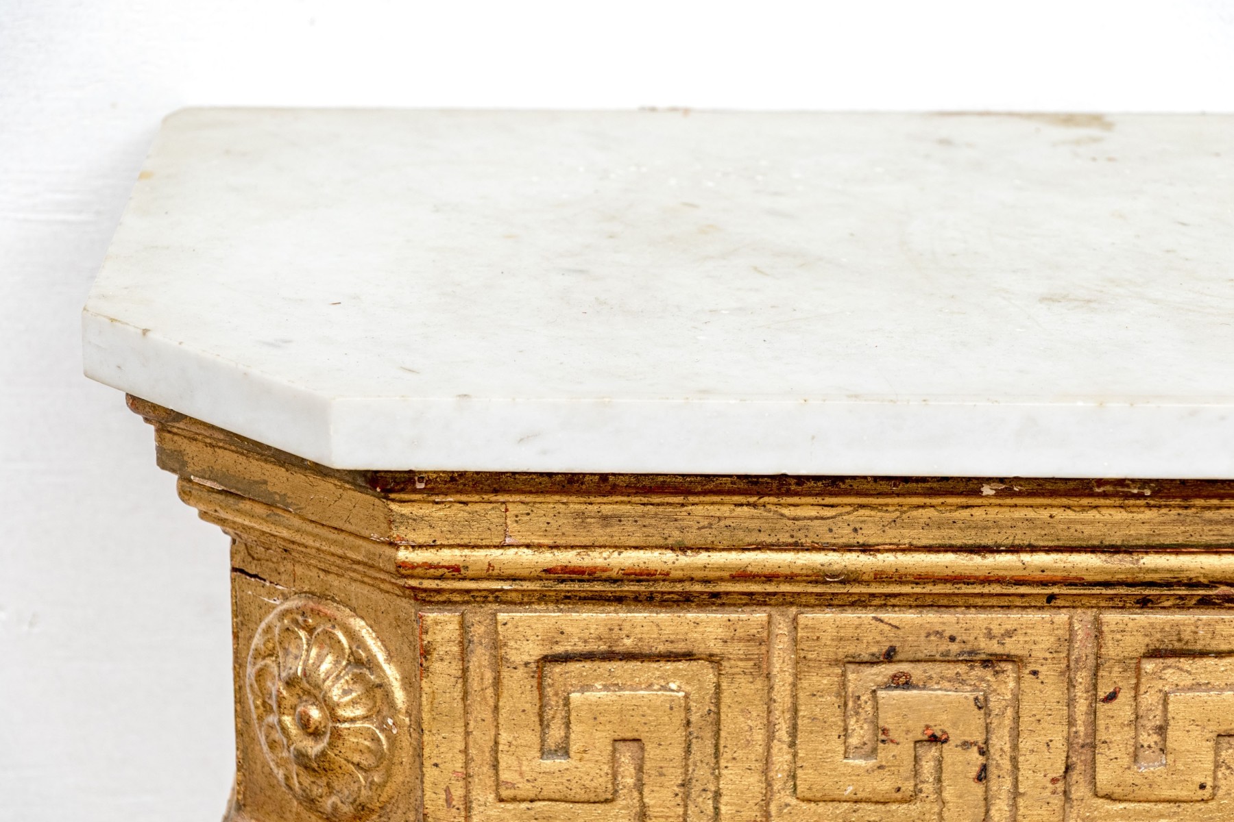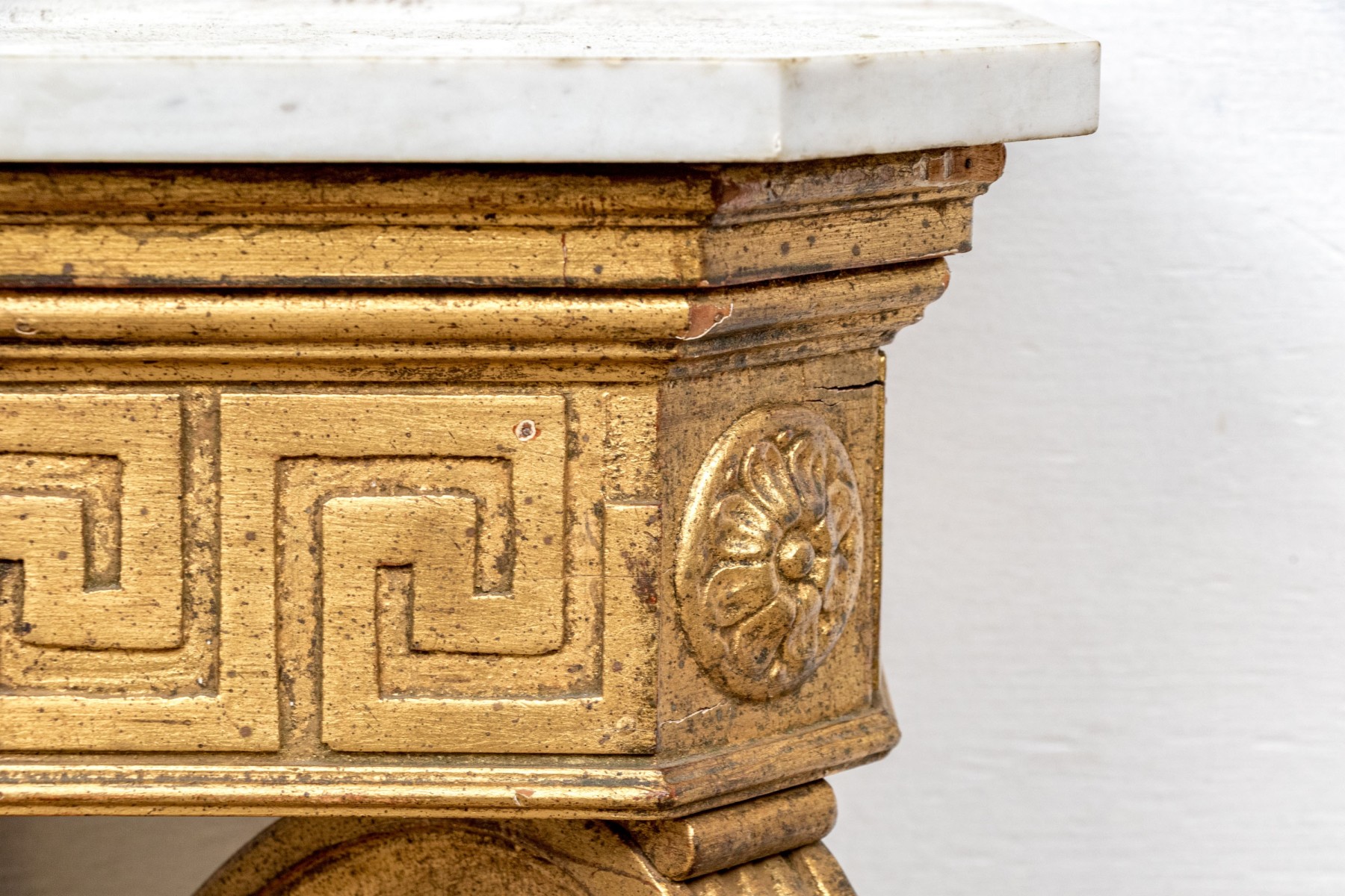 The rectangular top with canted corners in front. Below the molding is a wide frieze decorated with a Greek key motif with rosettes at the corners. Raised on a center faceted support and tall reeded scrolled legs, mounted on an incurved triangular base. With a white marble overhanging top.