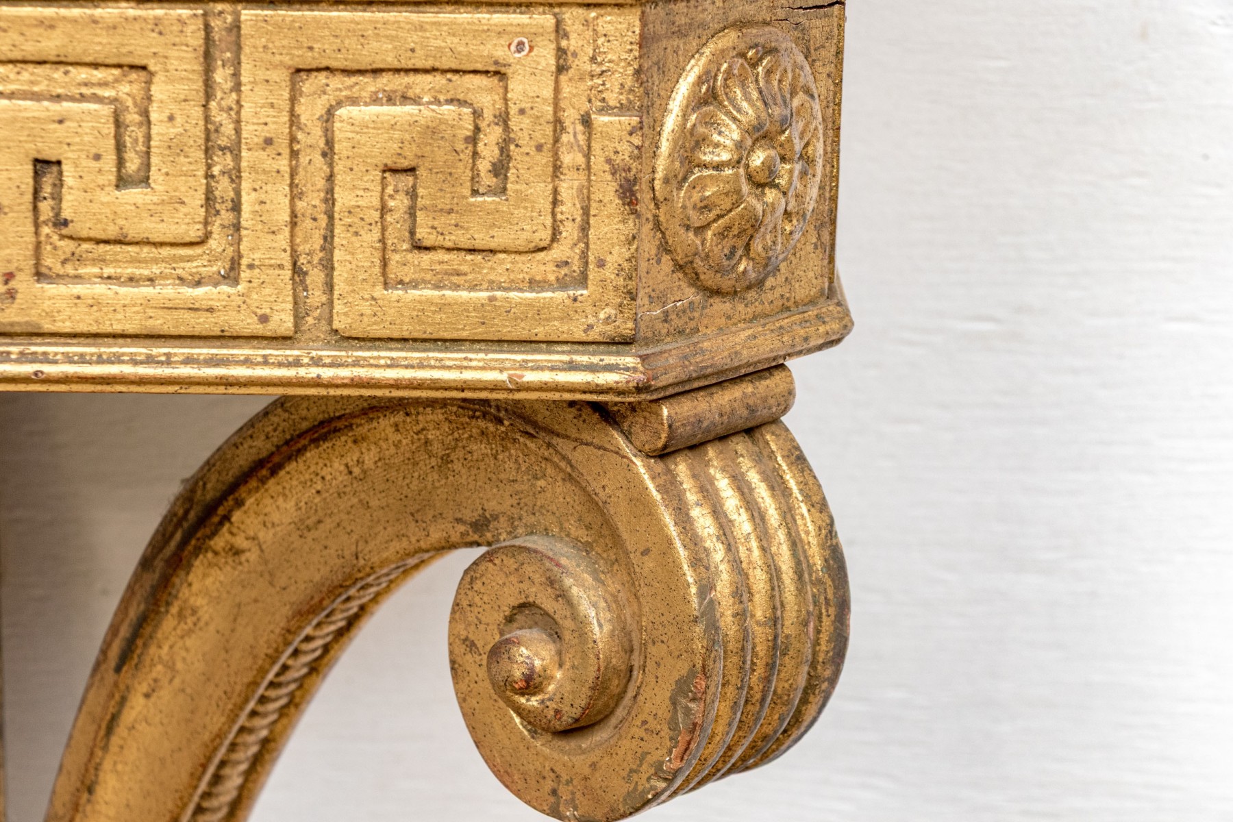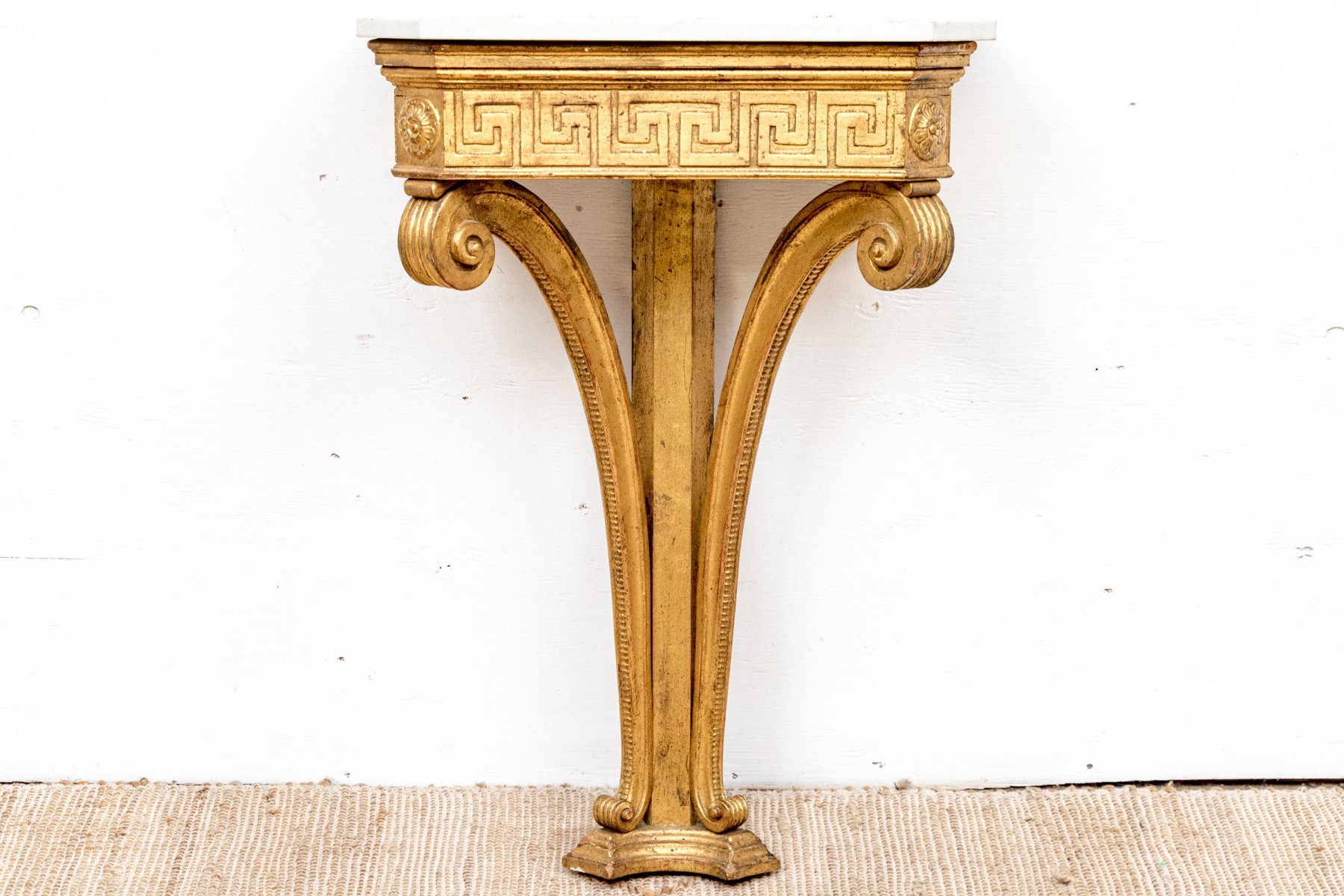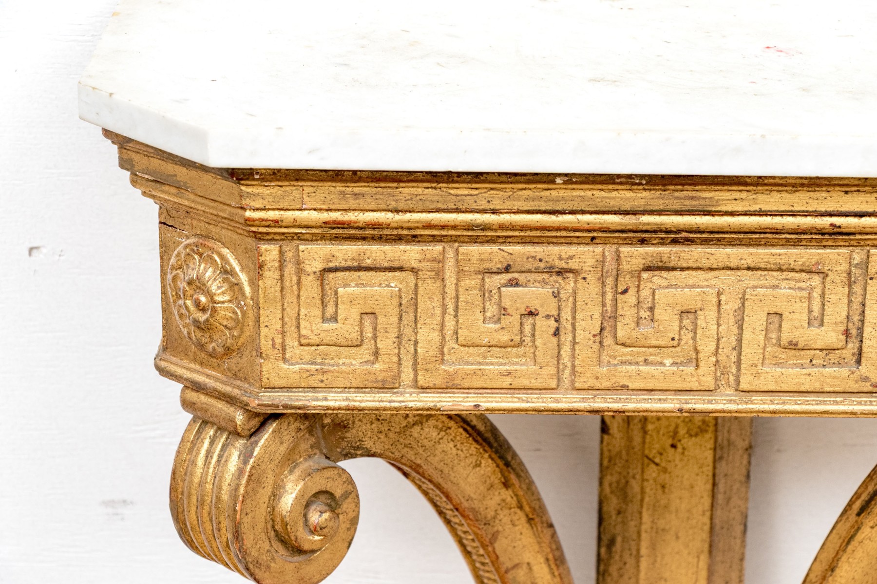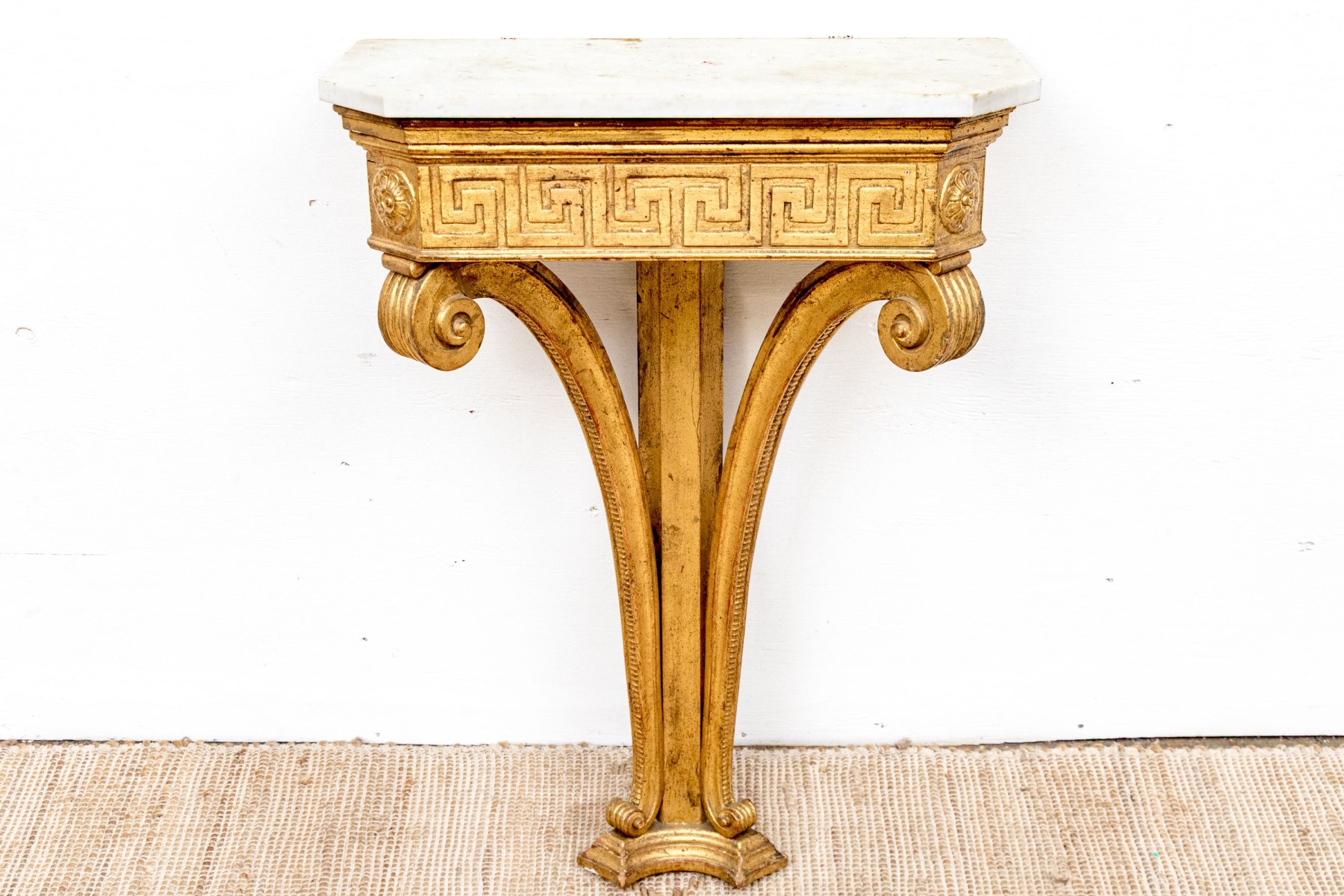 The rectangular top with canted corners in front. Below the molding is a wide frieze decorated with a Greek key motif with rosettes at the corners. Raised on a center faceted support and tall reeded scrolled legs, mounted on an incurved triangular base. With a white marble overhanging top.