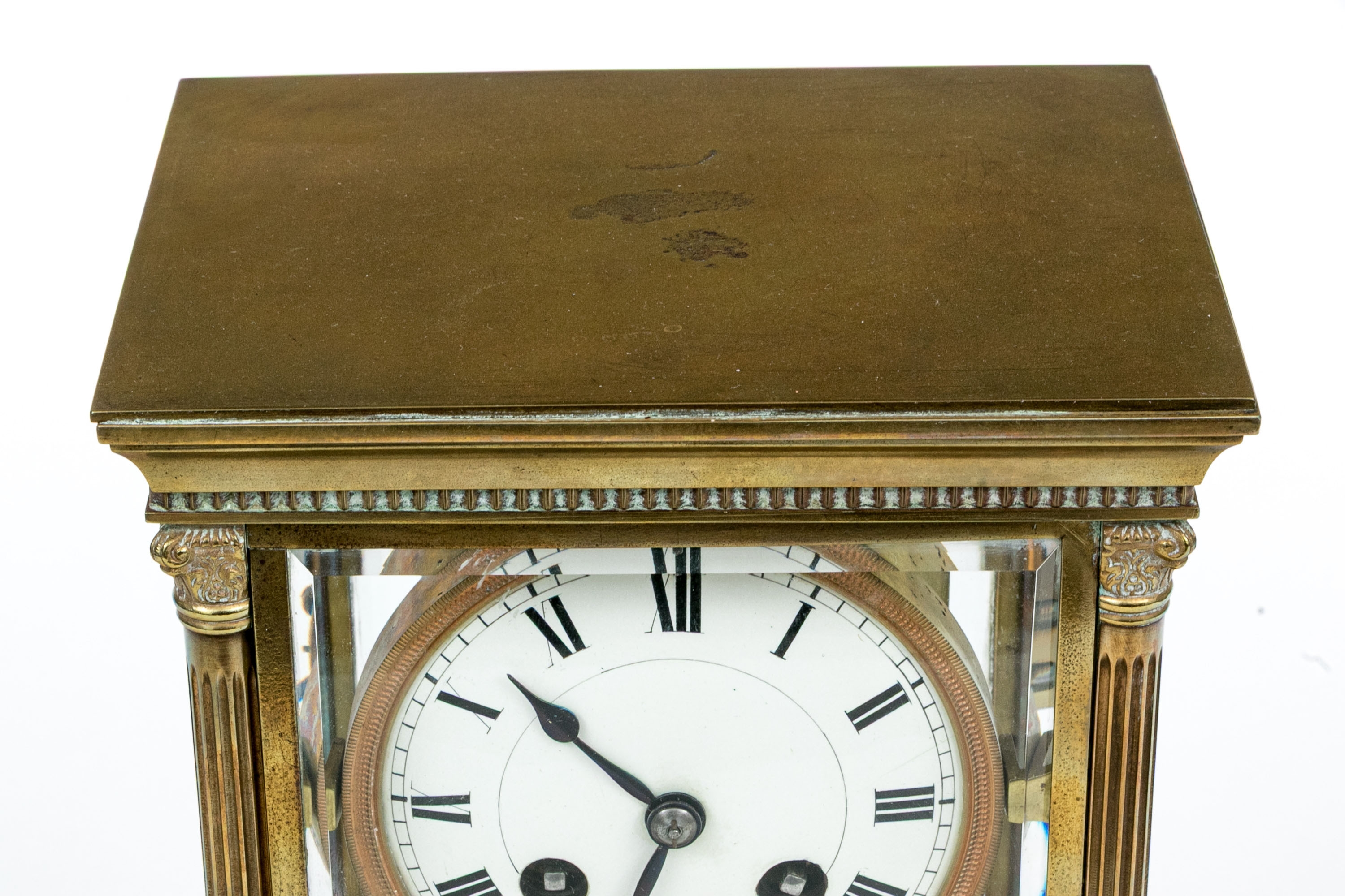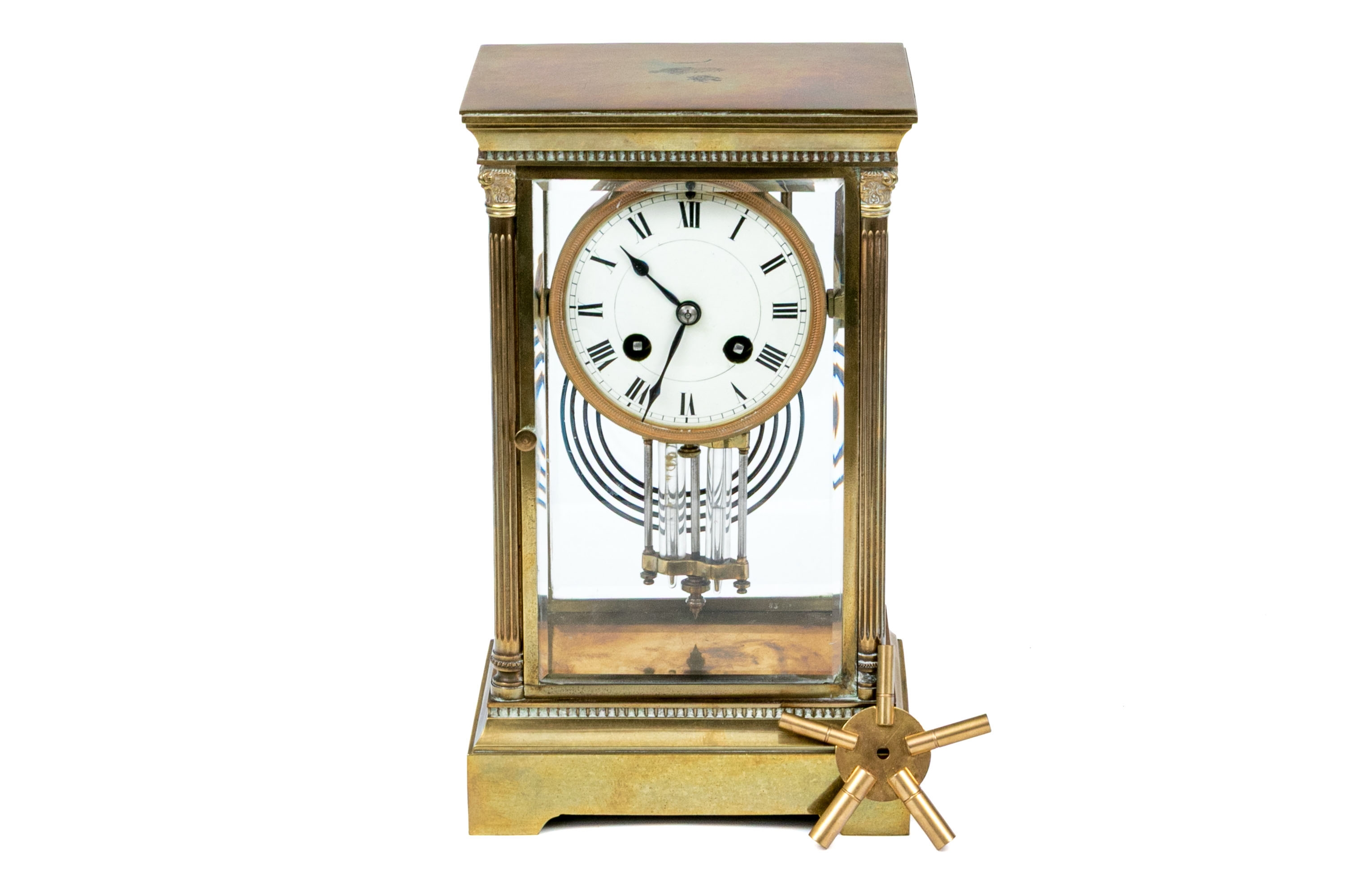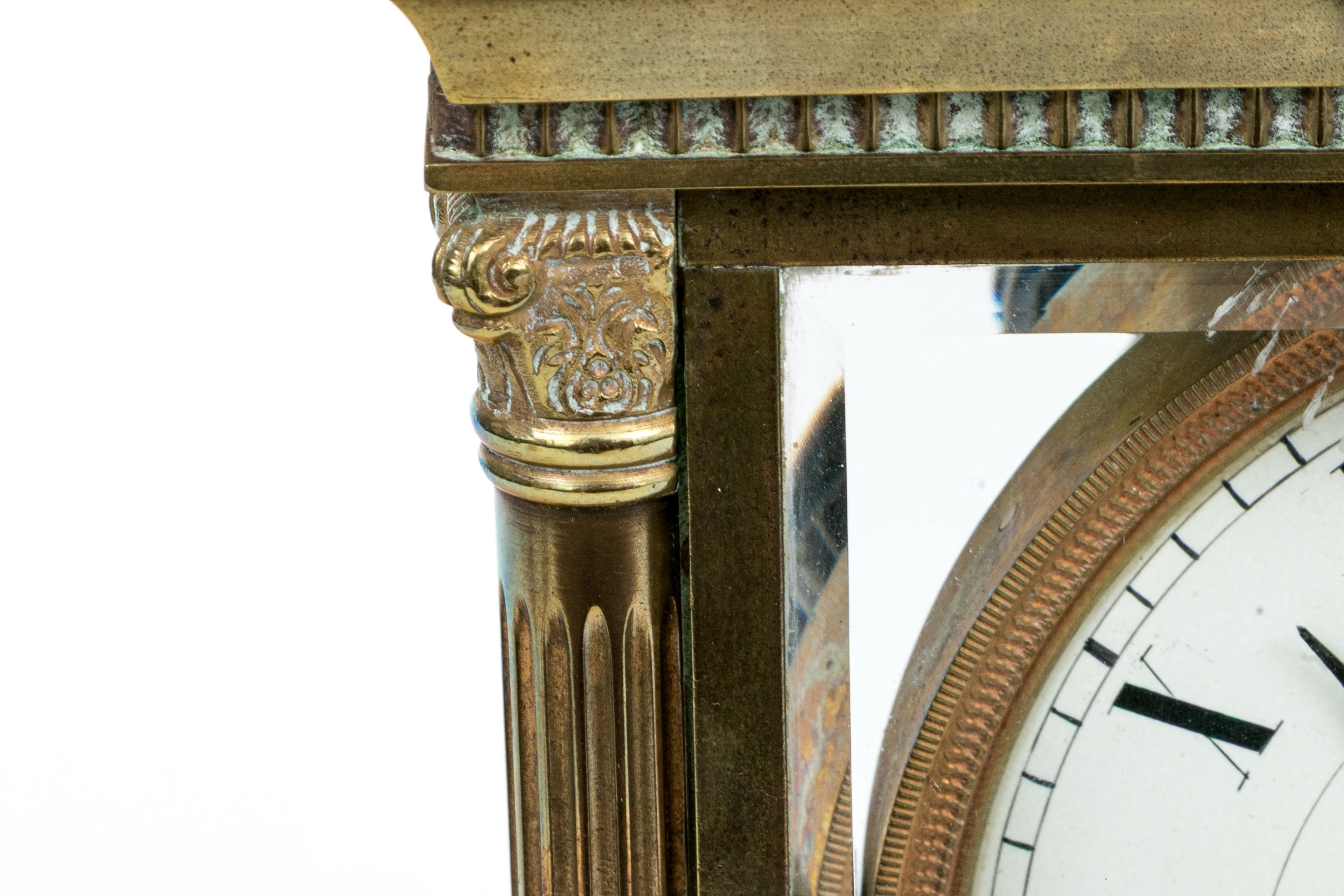 A handsome Neoclassical style brass mantel clock with a flat crown moulded top and dentil trim over finely detailed columns at the corners. With a white dial and black Roman numerals.