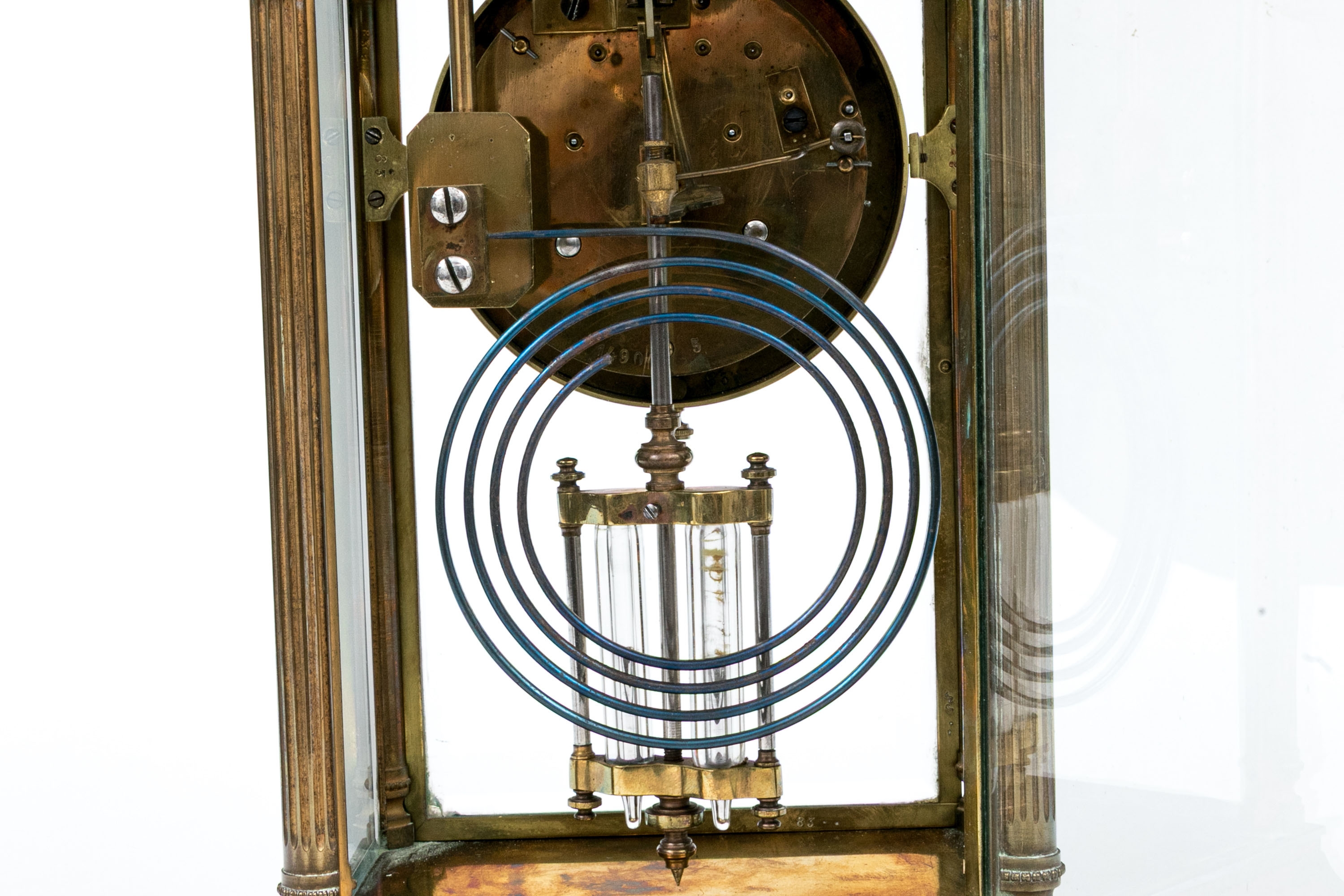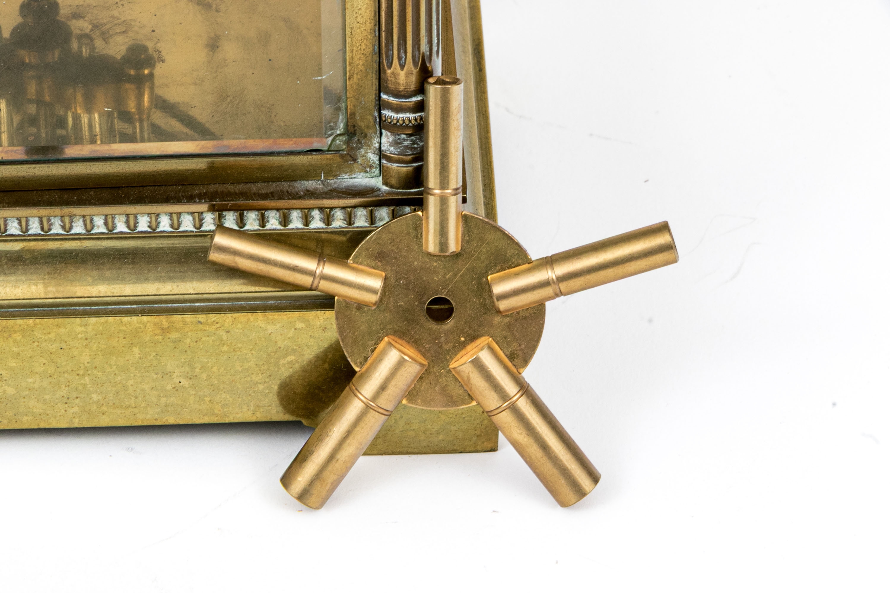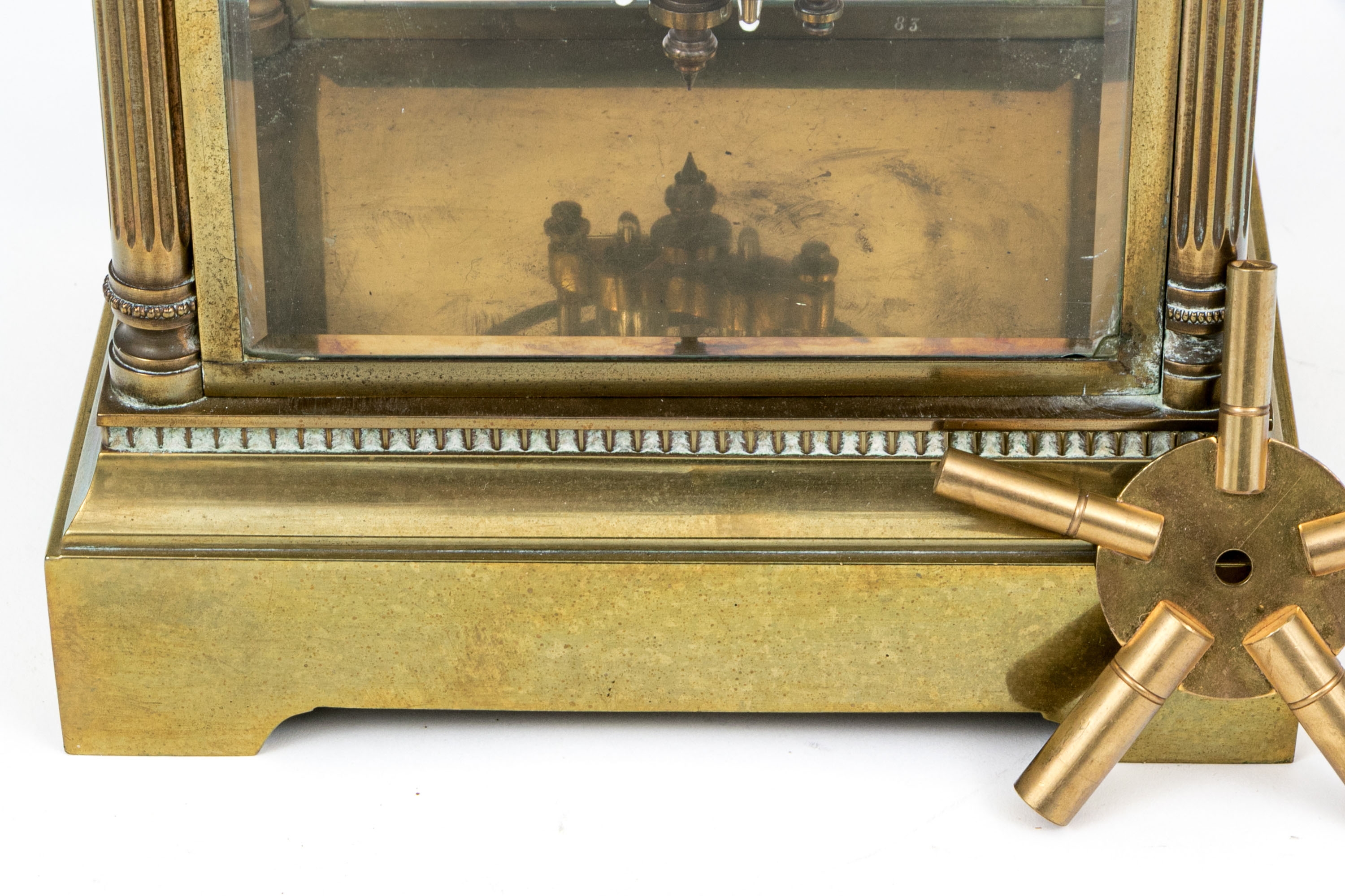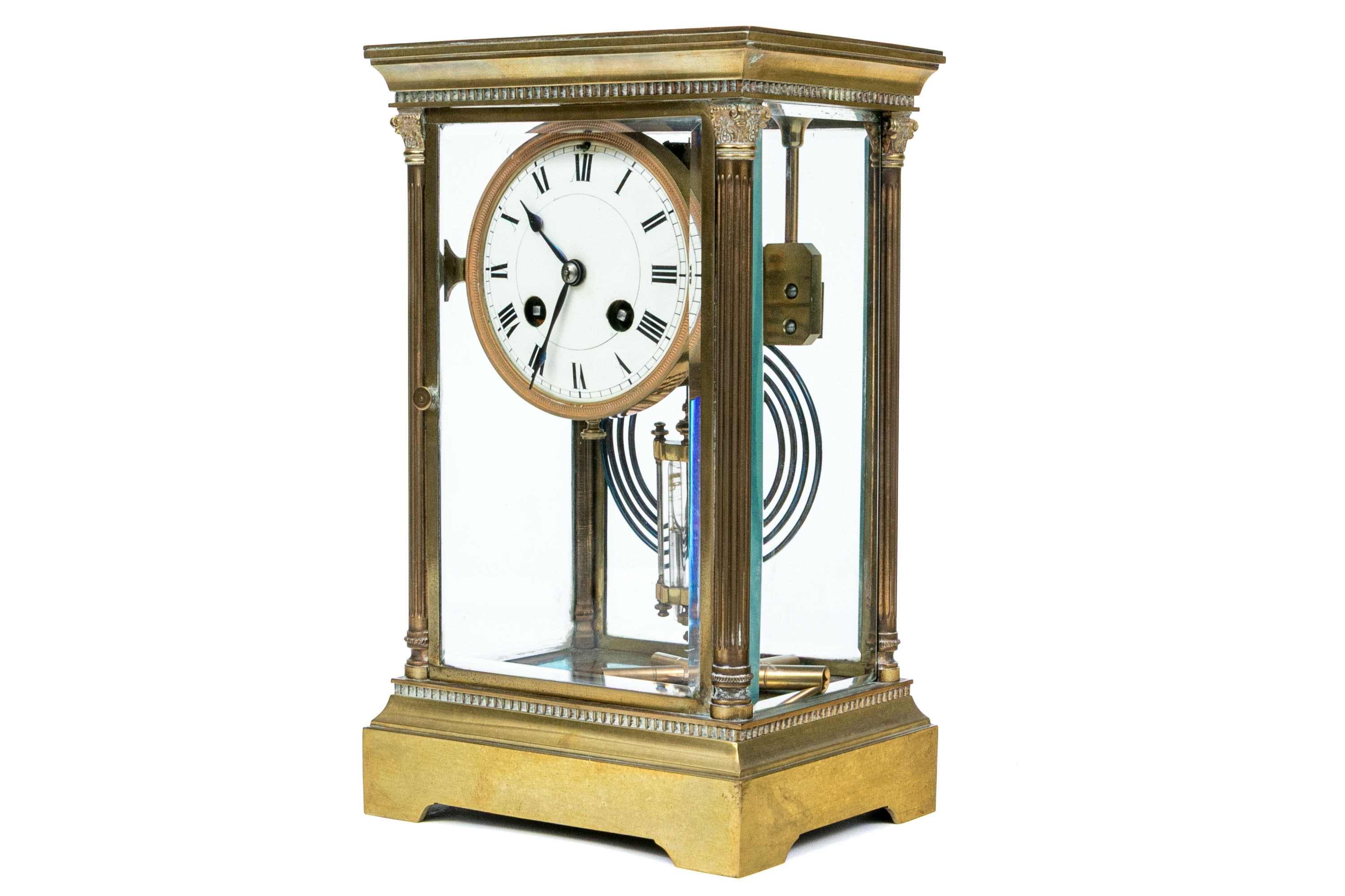 A handsome Neoclassical style brass mantel clock with a flat crown moulded top and dentil trim over finely detailed columns at the corners. With a white dial and black Roman numerals.