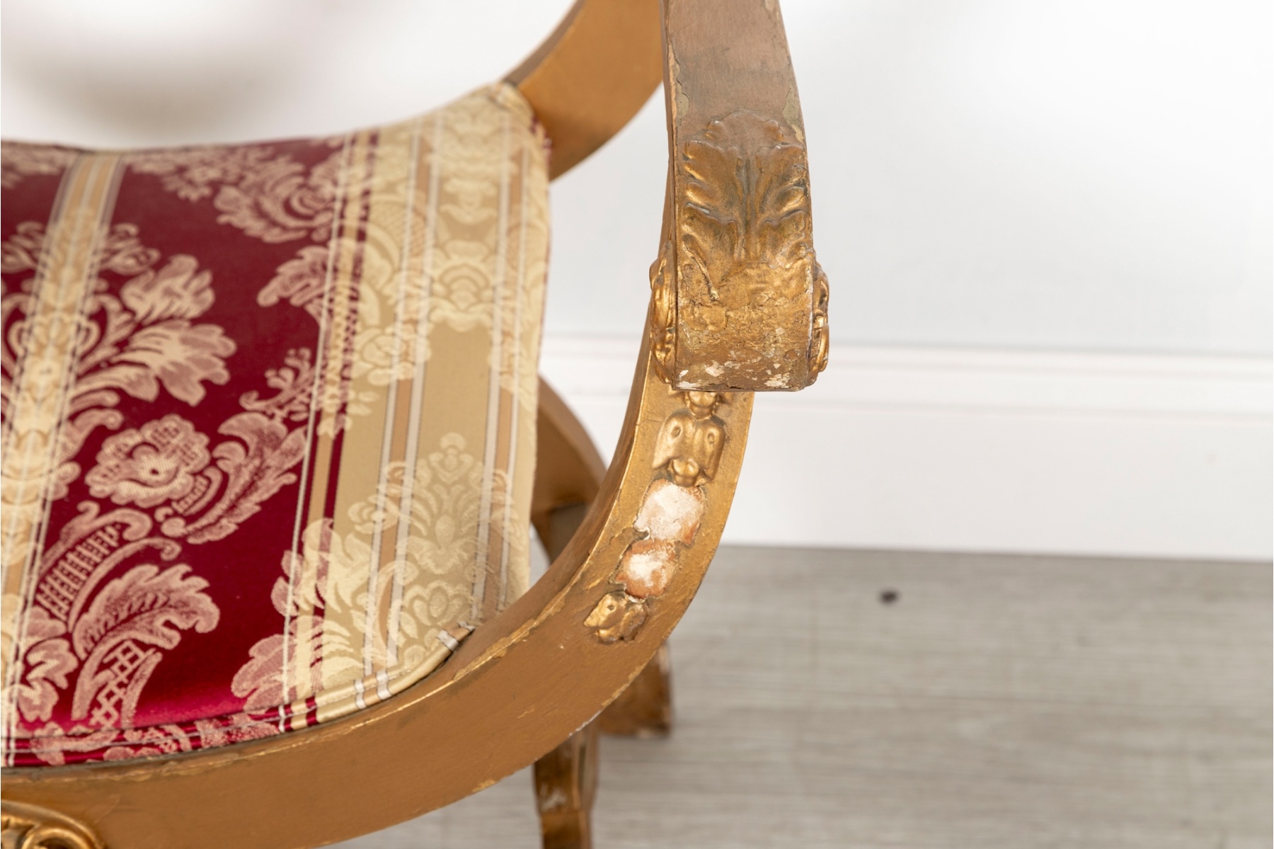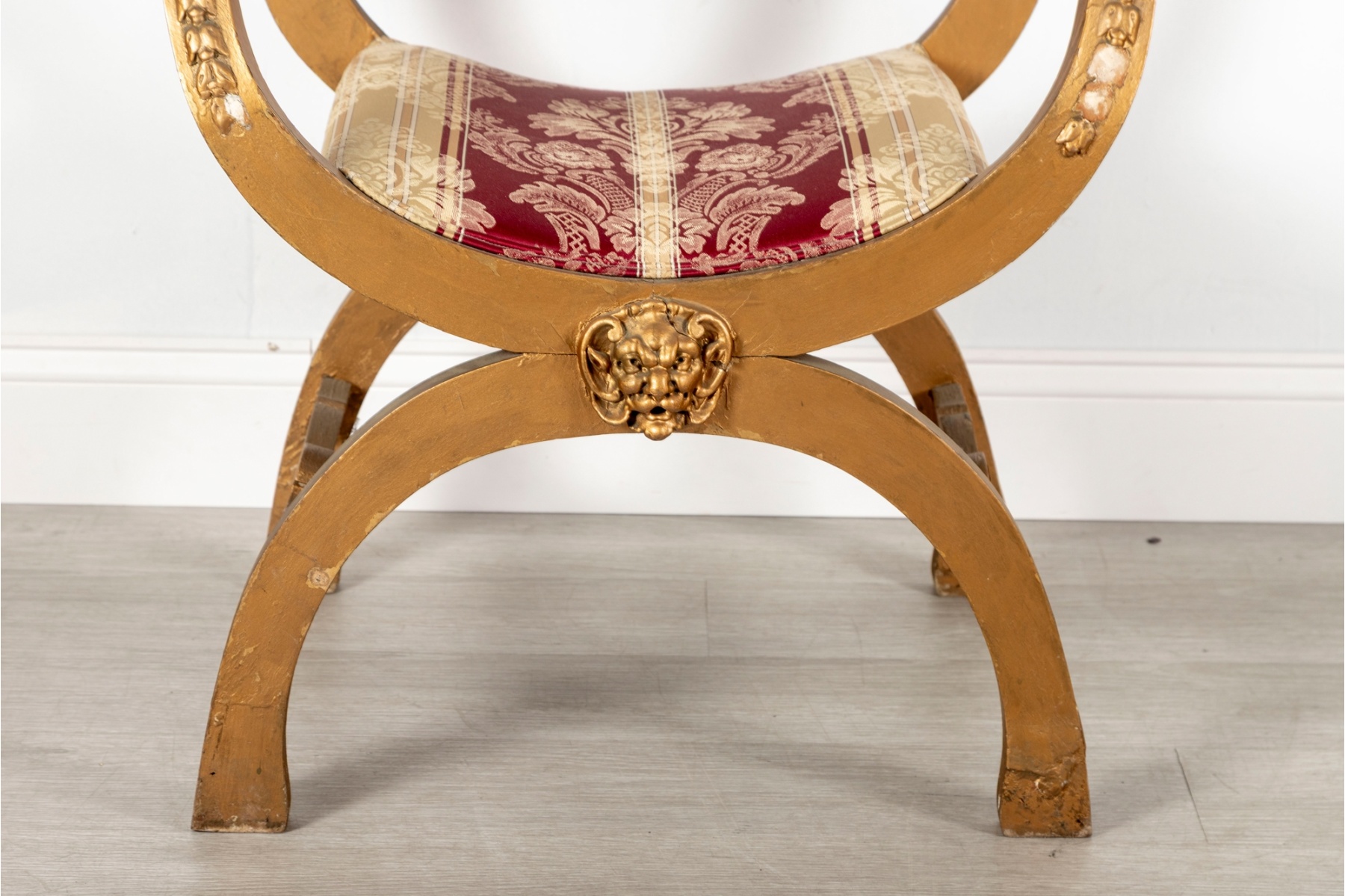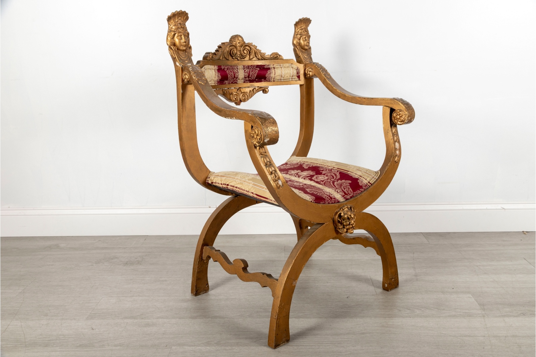 Neoclassical style giltwood curule chair featuring carved female bust arm terminals, scrolling arms, and lion mask detail to the stretcher. Upholstered in red and gold damask fabric. Ornately detailed and regal in presentation.