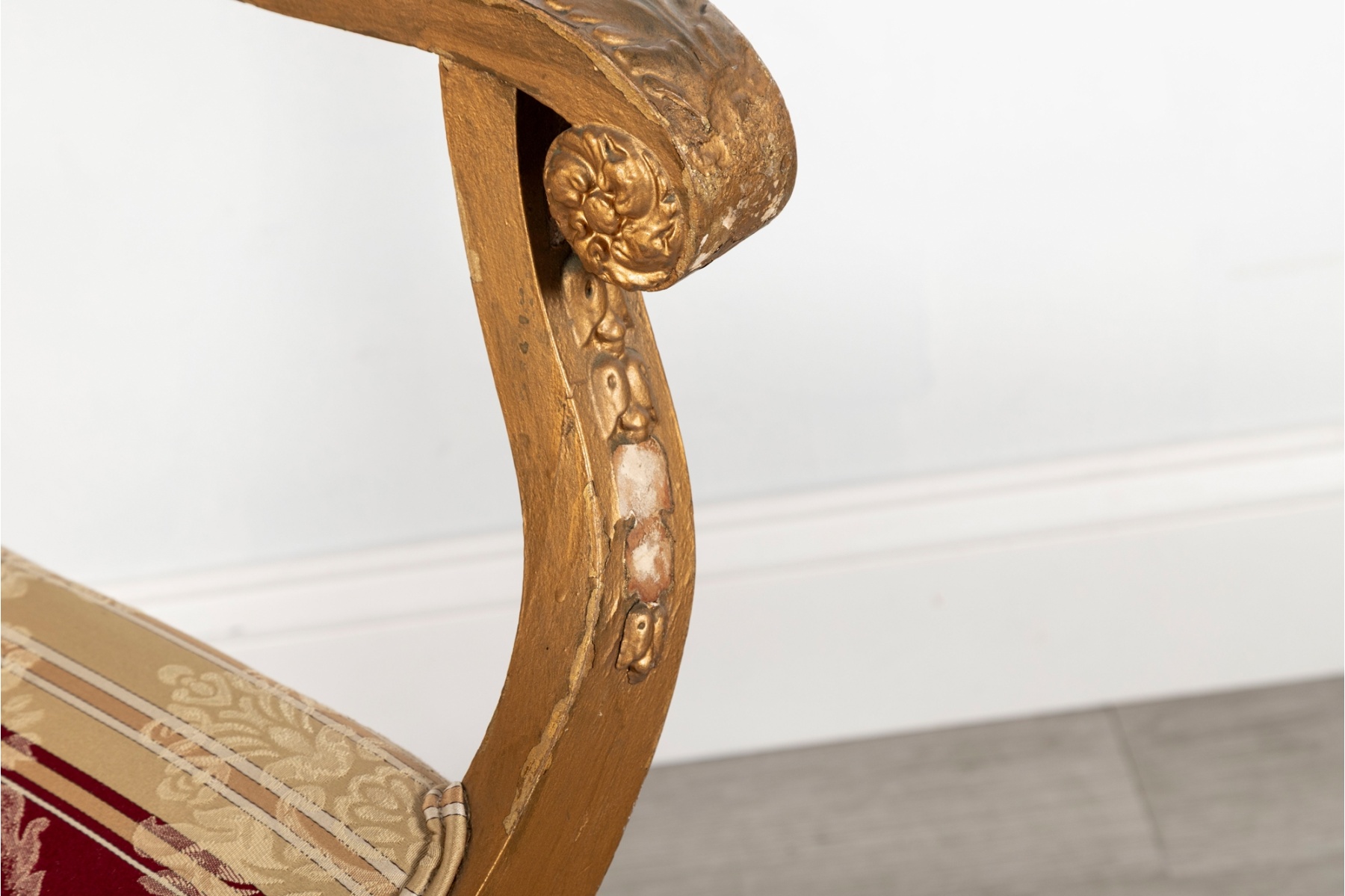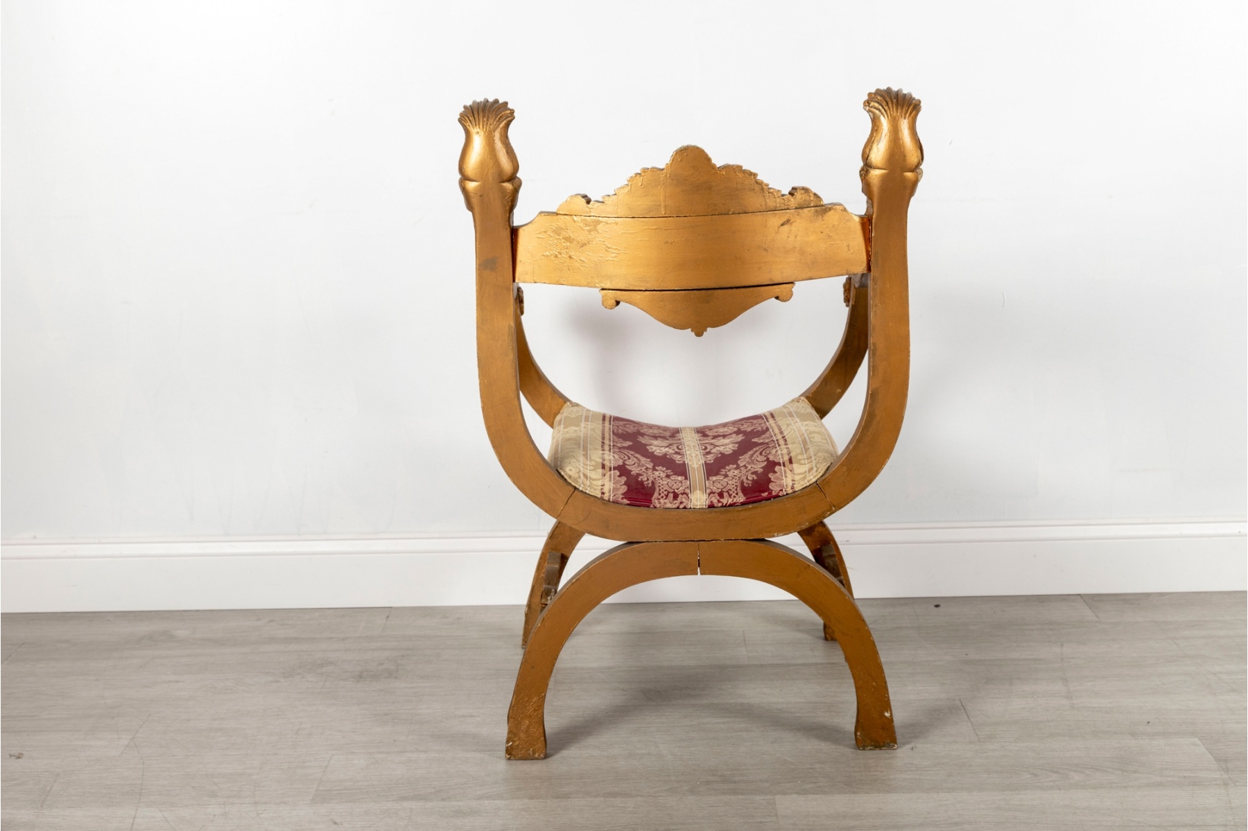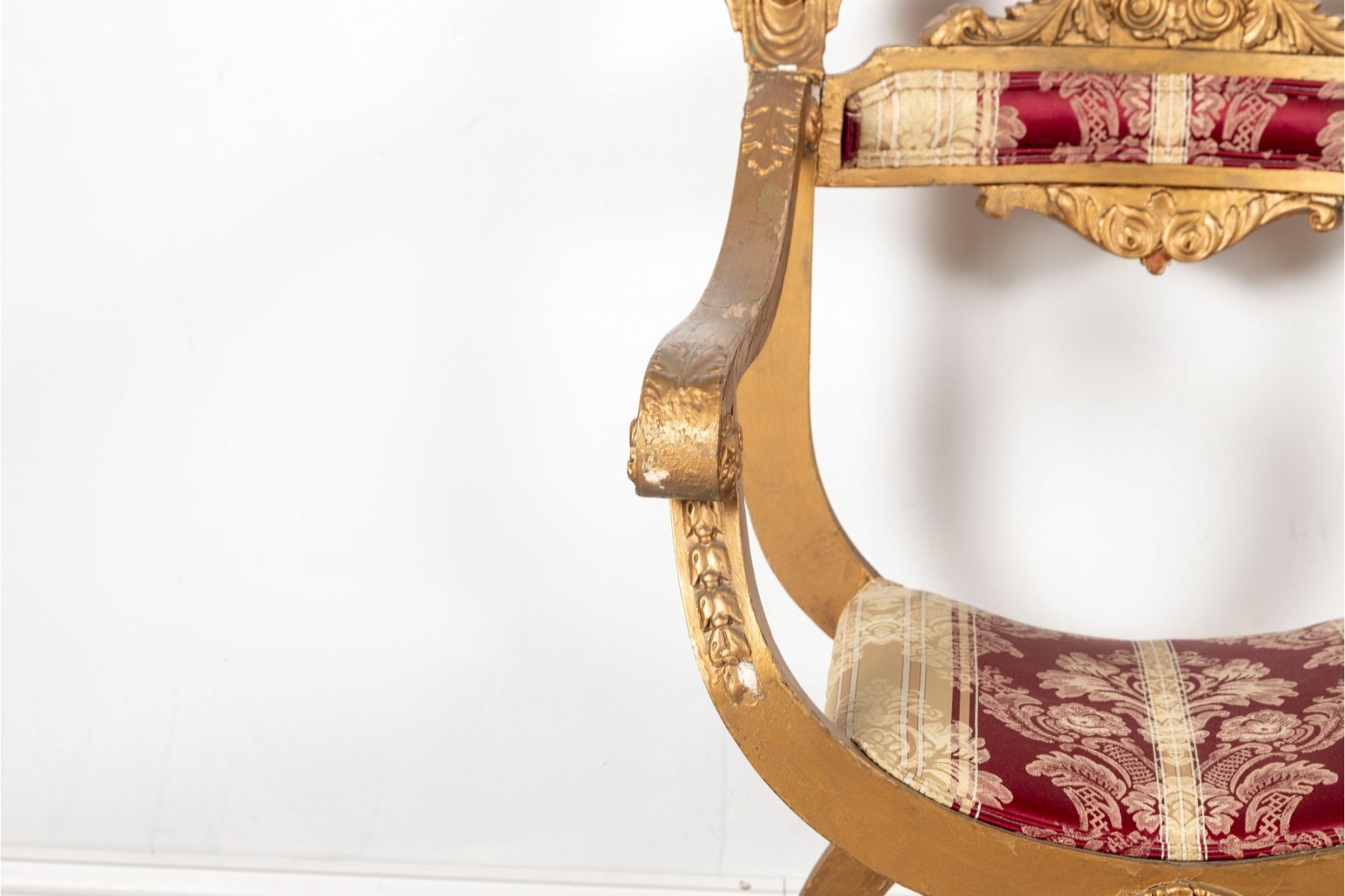 Neoclassical style giltwood curule chair featuring carved female bust arm terminals, scrolling arms, and lion mask detail to the stretcher. Upholstered in red and gold damask fabric. Ornately detailed and regal in presentation.