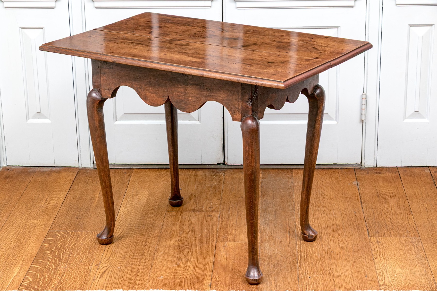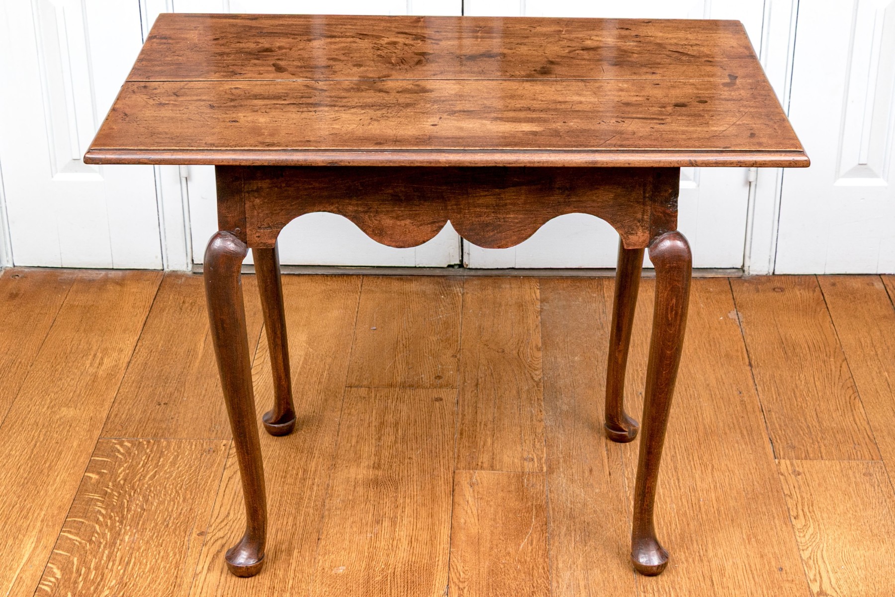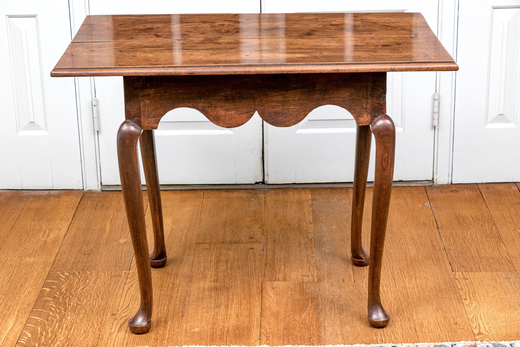 Classic Queen Anne medium brown cherry finish. The rectangular top features an ogee edge overhanging a deeply scalloped apron raised over gently curved cabriole legs with pad feet.