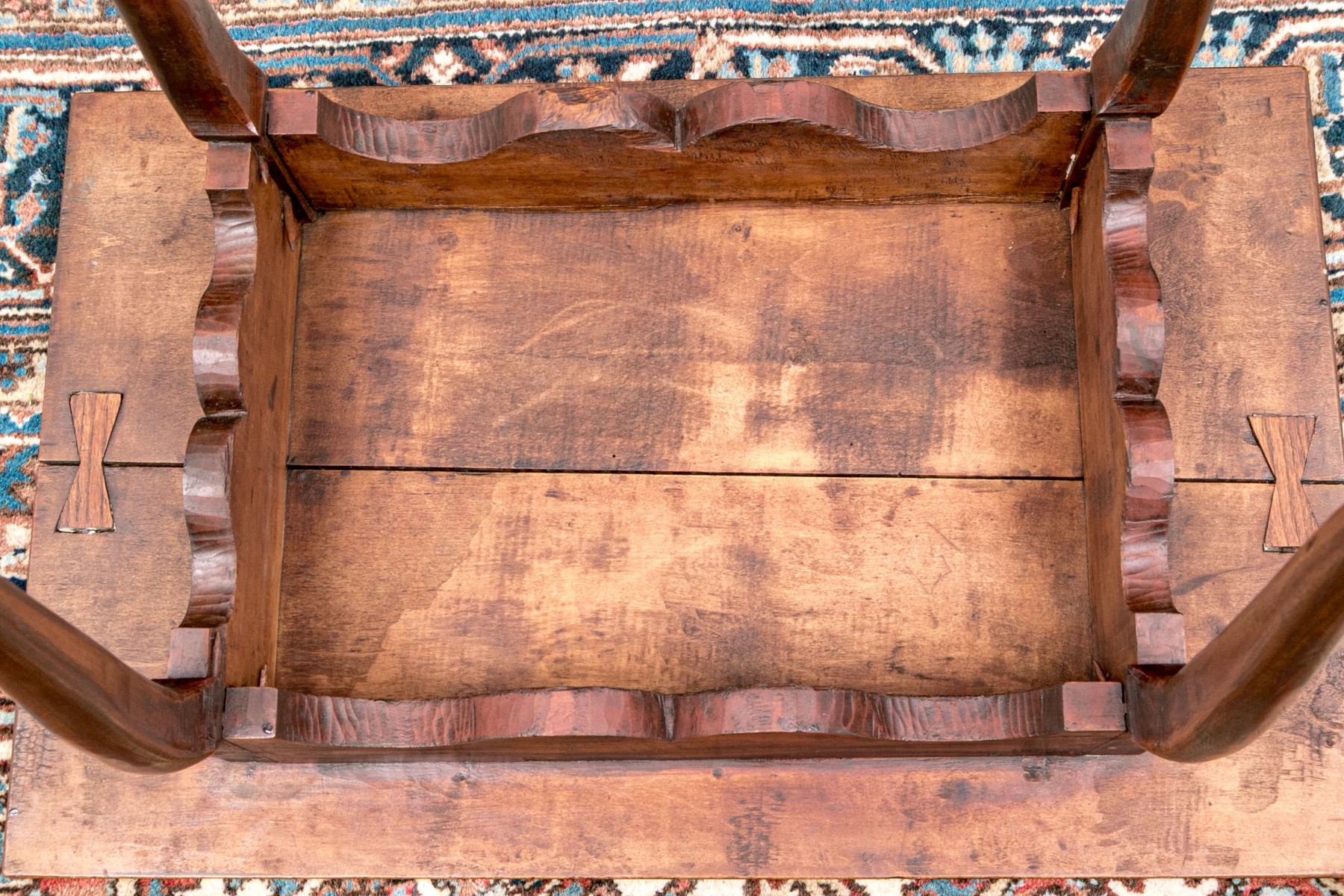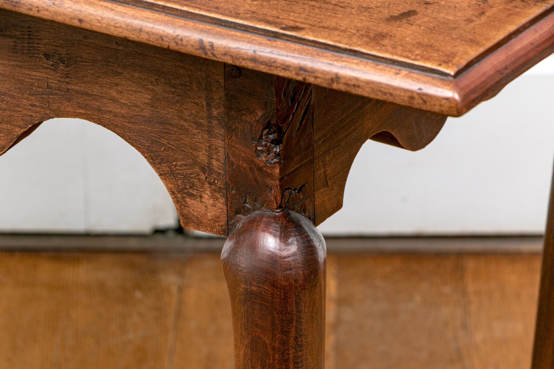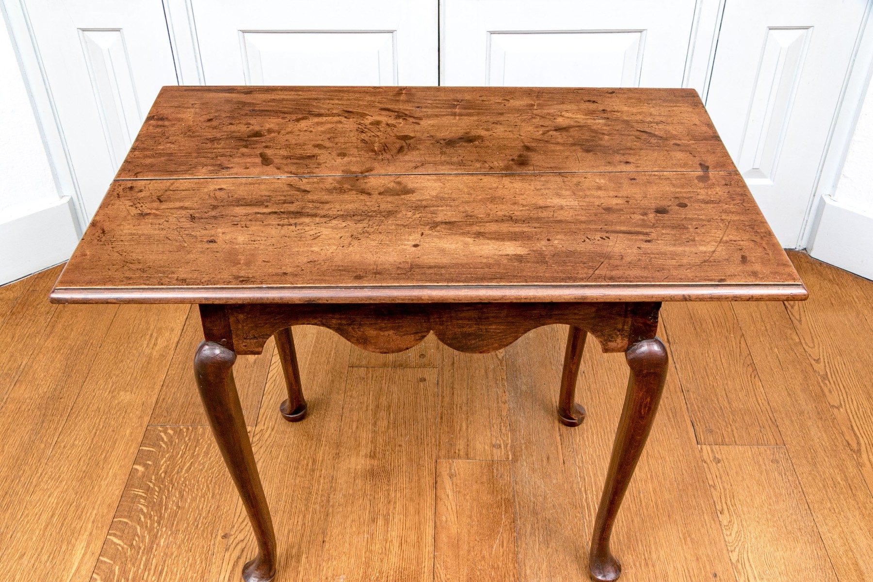 Classic Queen Anne medium brown cherry finish. The rectangular top features an ogee edge overhanging a deeply scalloped apron raised over gently curved cabriole legs with pad feet.
