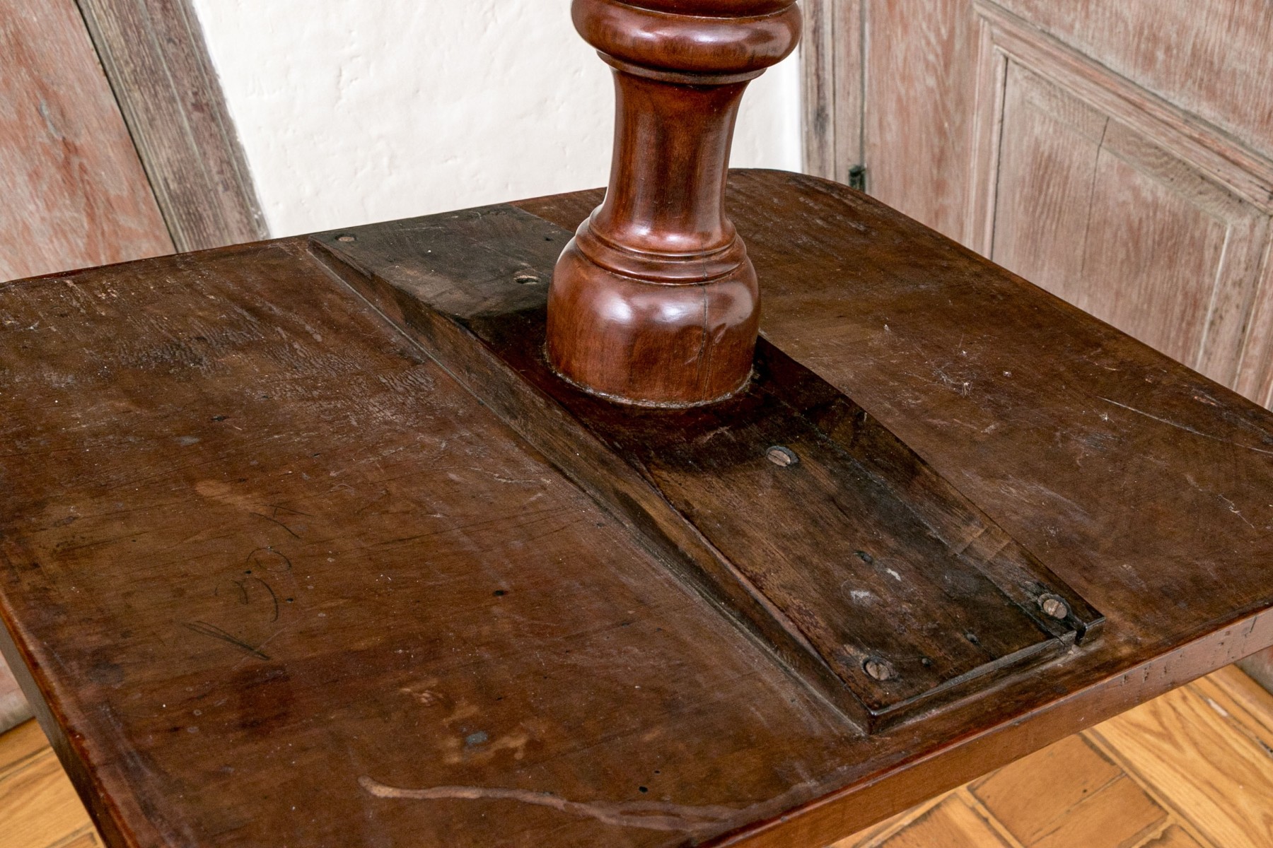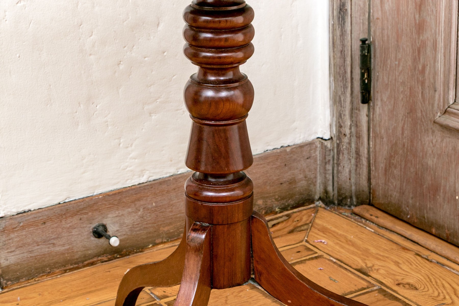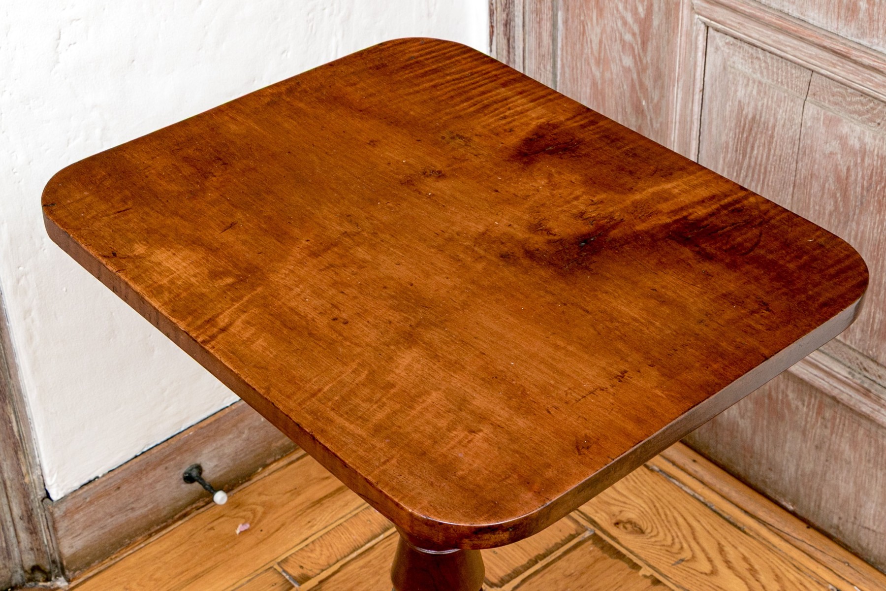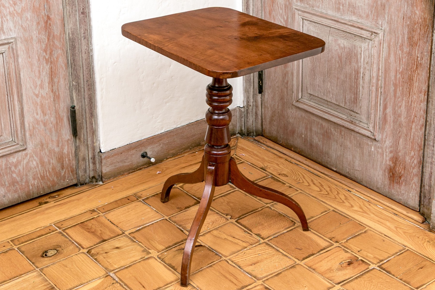 A delightful antique New England gueridon perfect for versatile use as a candle stand, plant stand, lamp table, or wine table, circa 1810-30. The table is beautifully constructed in sturdy maple with a warm, medium brown finish, showcasing a rounded rectangular top supported by a decoratively turned column over a tripod of elegantly curved legs.