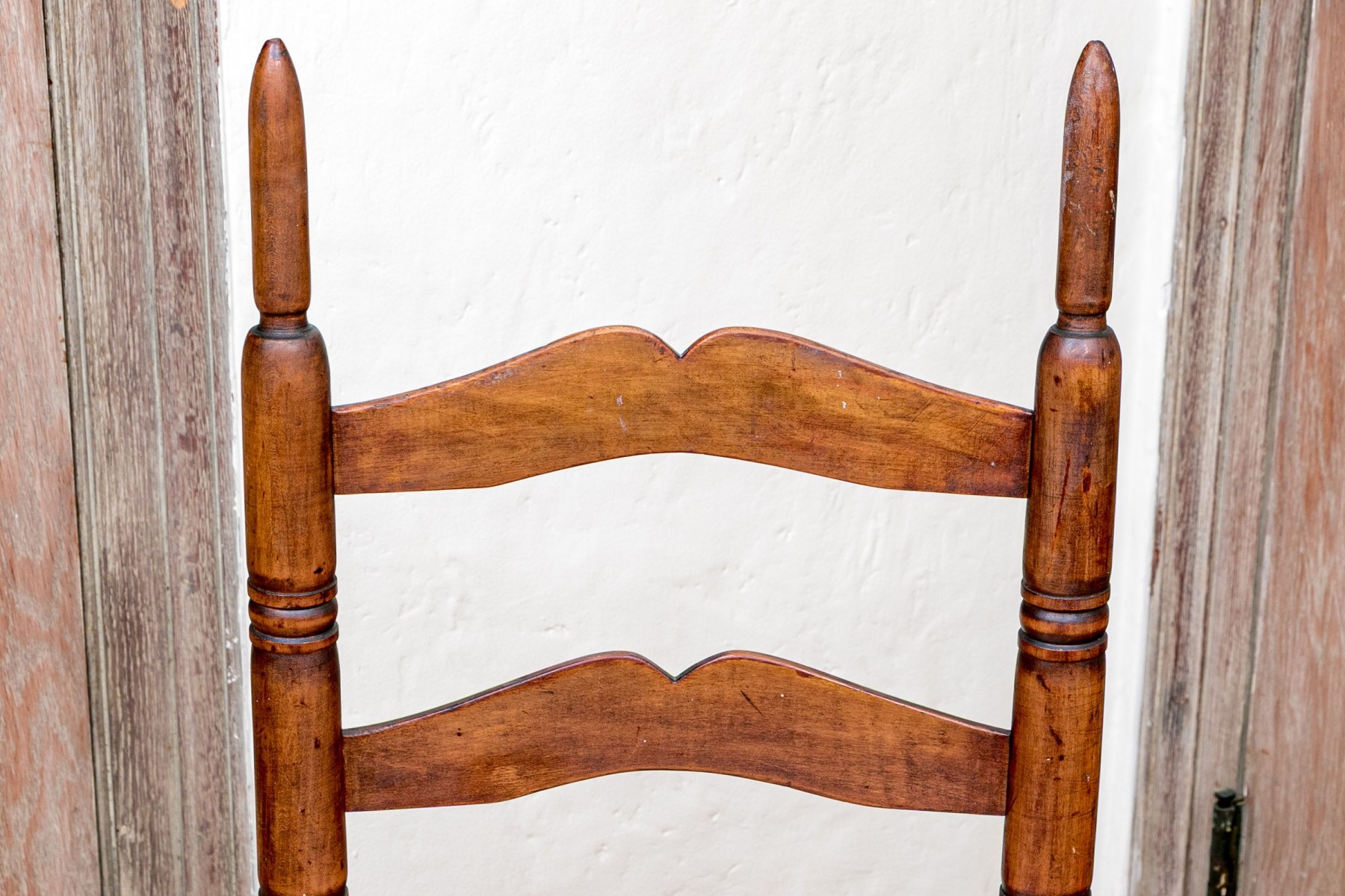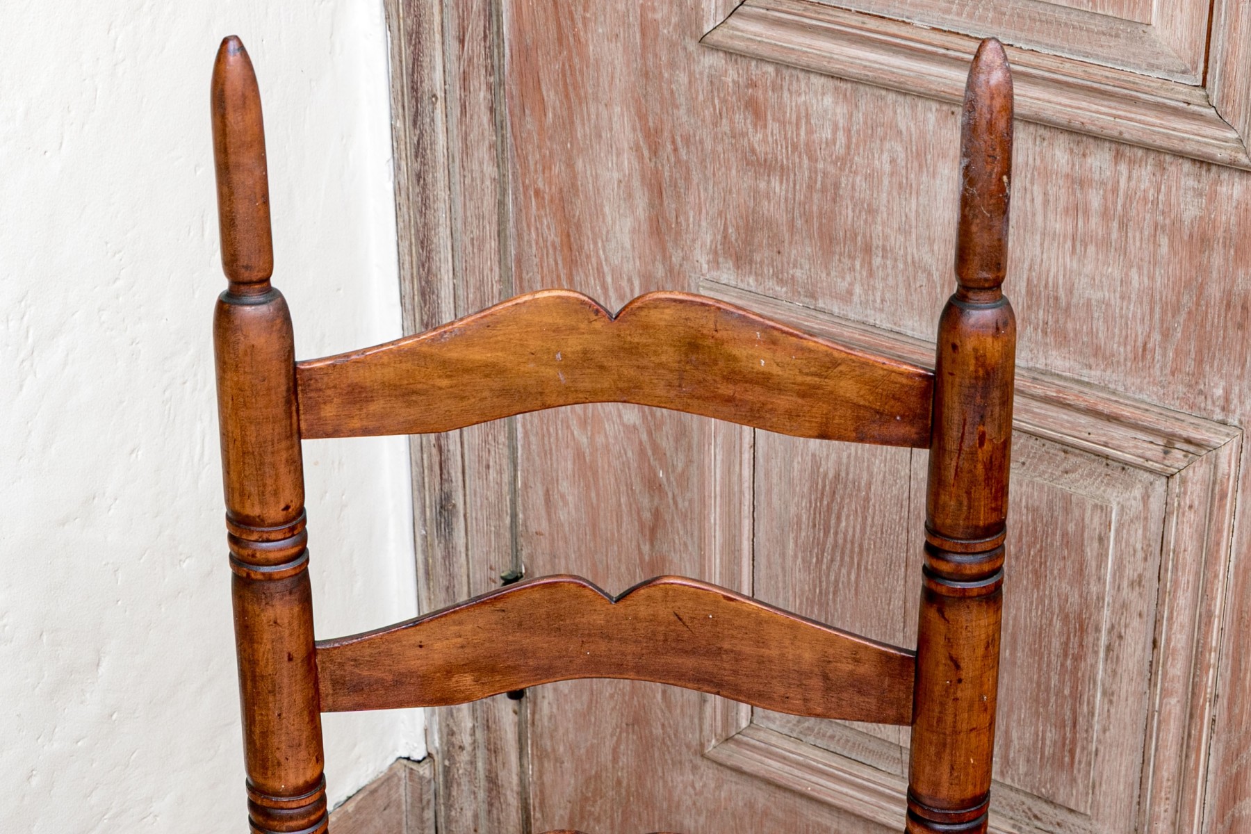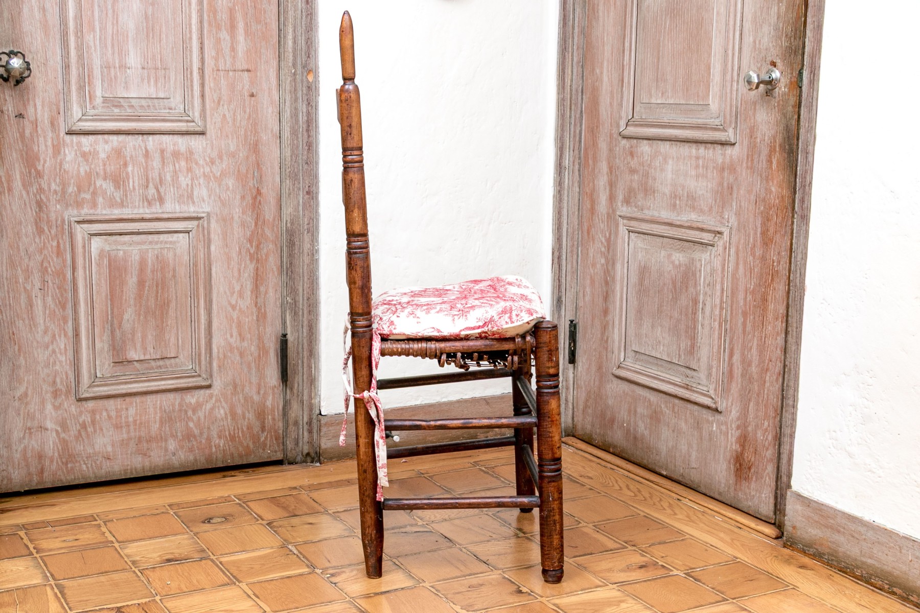 A wonderful antique Queen Anne ladderback chair showcasing three double curved splats along nicely turned posts with tall finials in a beautiful warm brown finish. The seat is woven in a double-banded basketweave pattern, raised over simple turned legs with a double box stretcher. Topped with a loose cushion in white fabric with a wonderful classical red pattern, affixed to the chair with ties around the back.