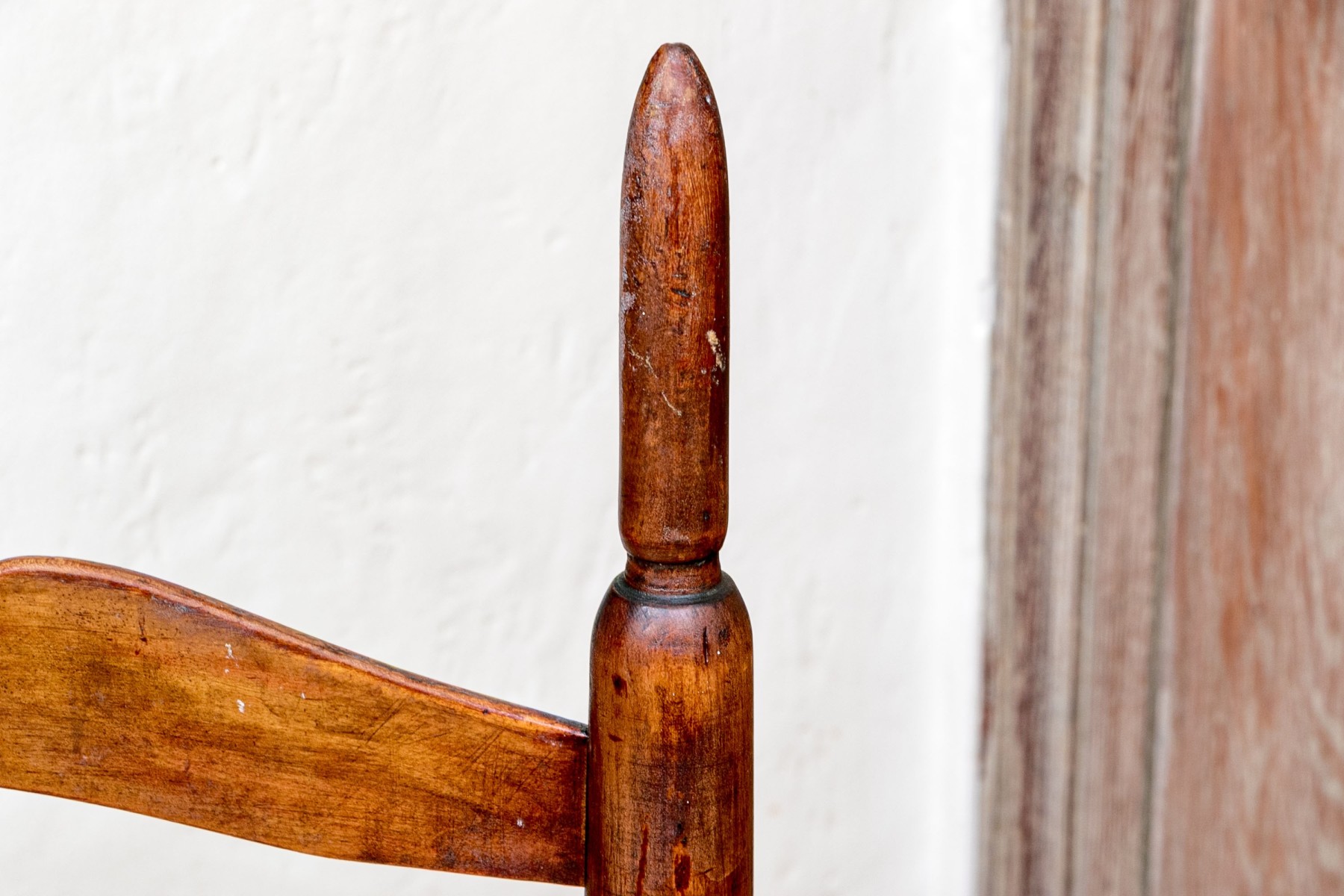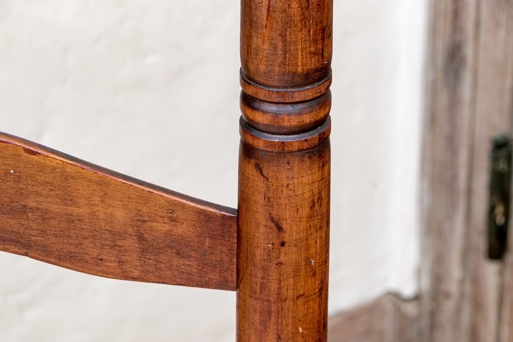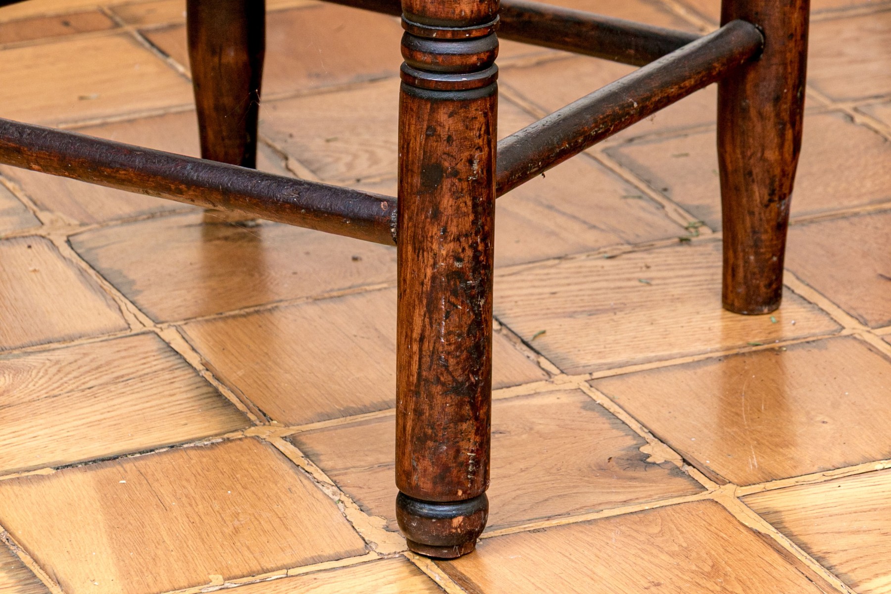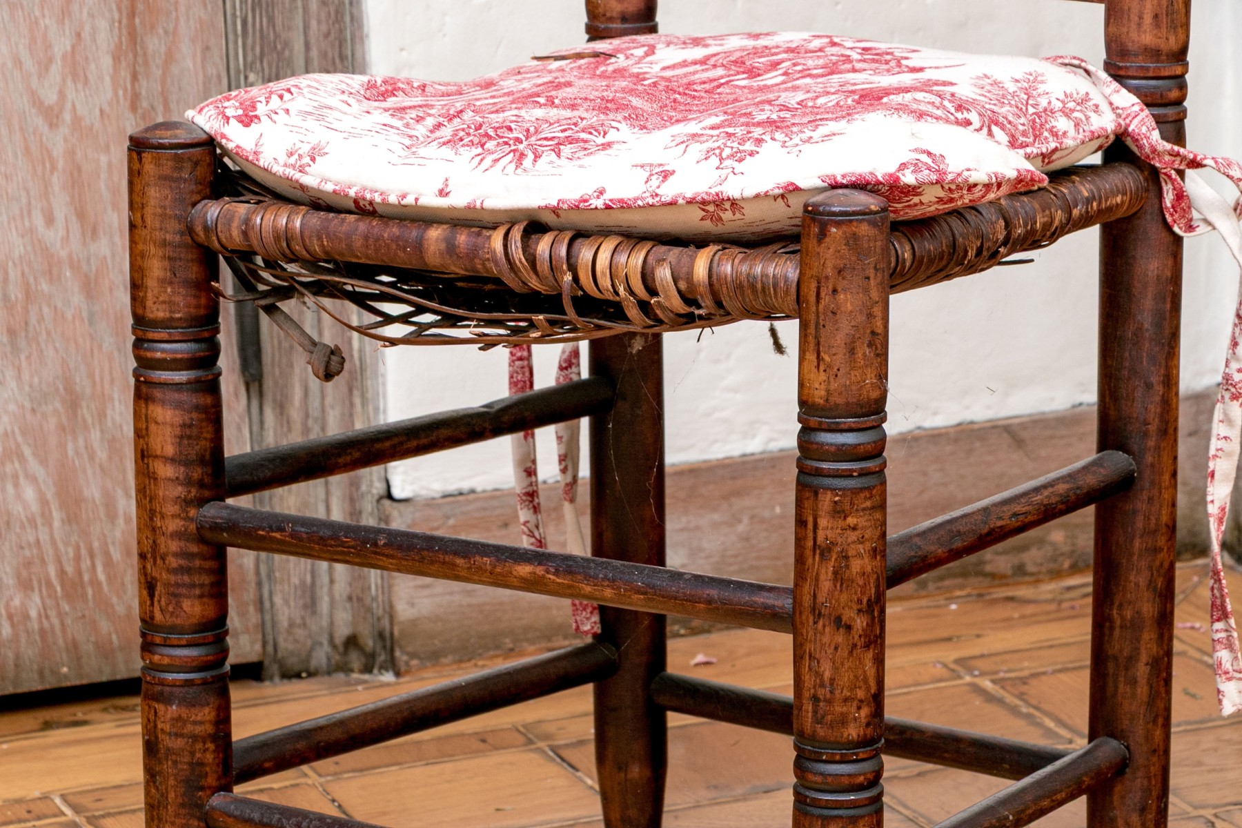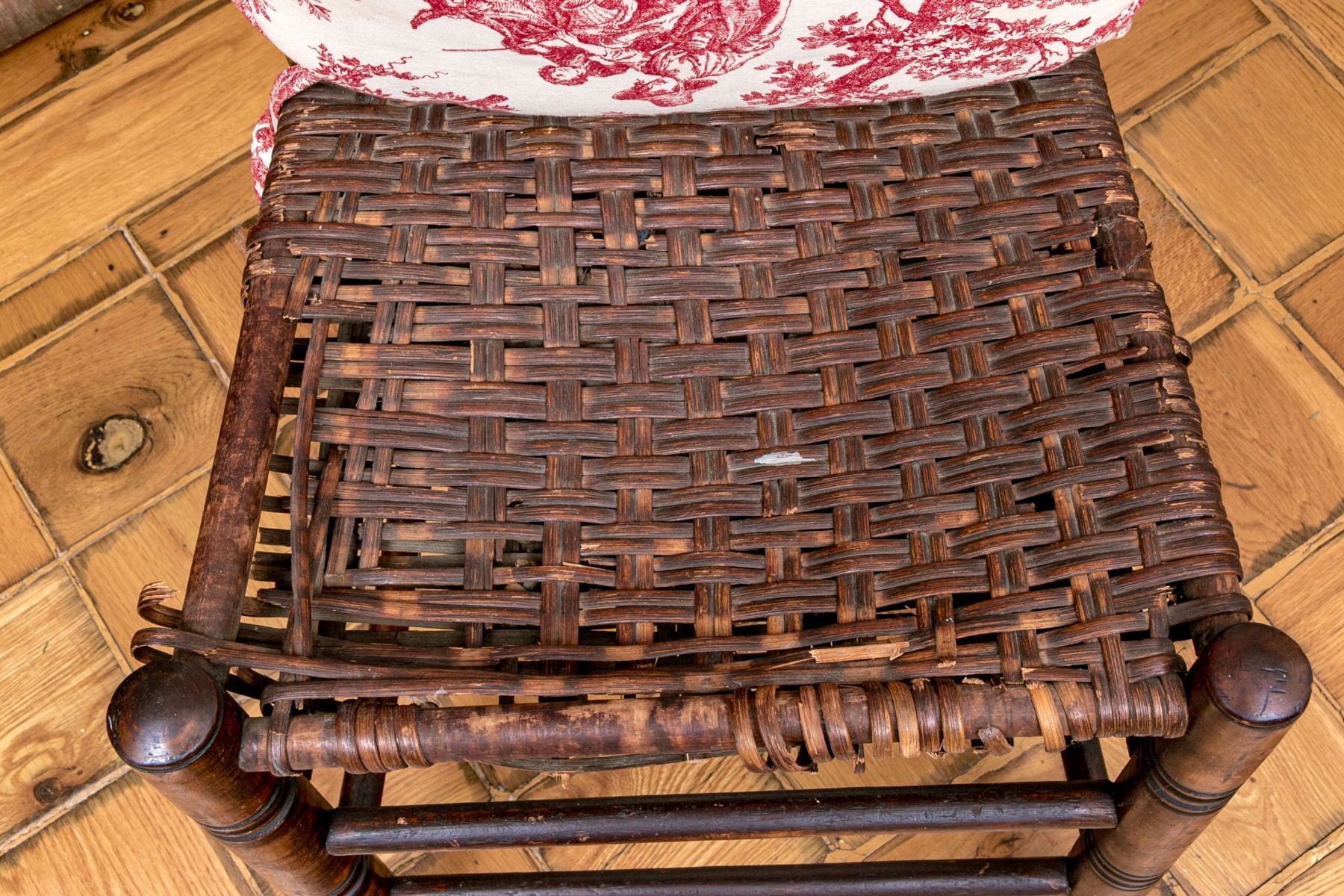 The seat has significant breaks to the weaving. Finish wear, scuffs, and nicks commensurate with age.