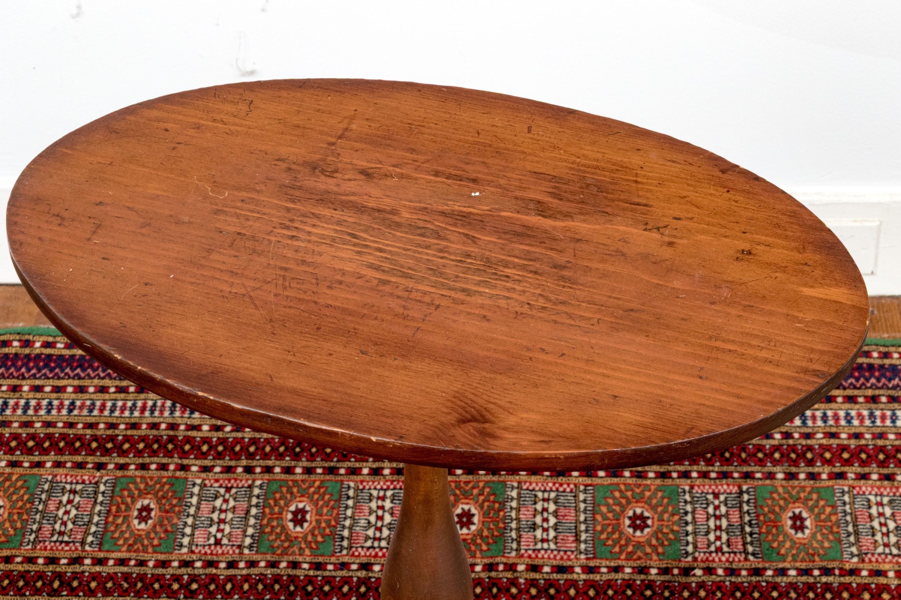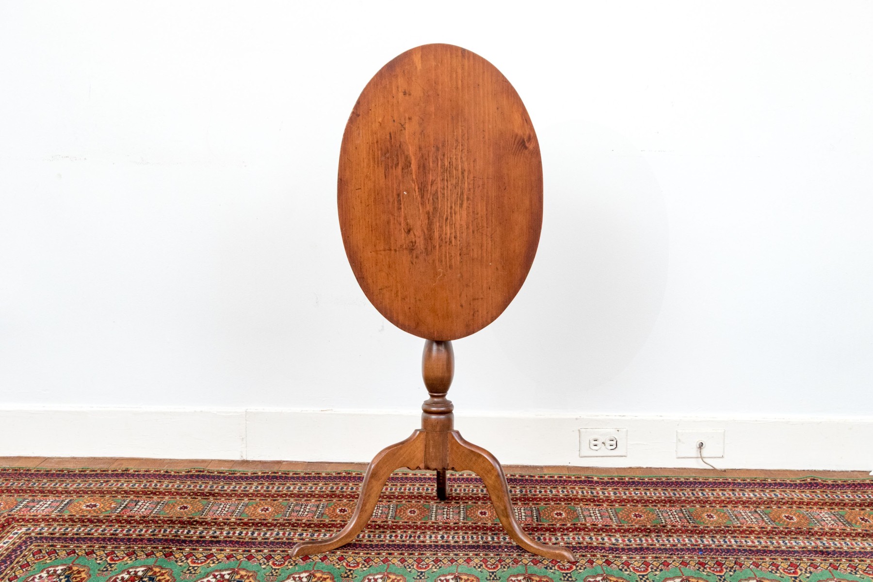 A delightful tilt top wine stand in a warm golden cherry, showcasing an oval tilt top over a baluster pedestal with three cabriole legs and pad feet for a lovely Queen Anne style.