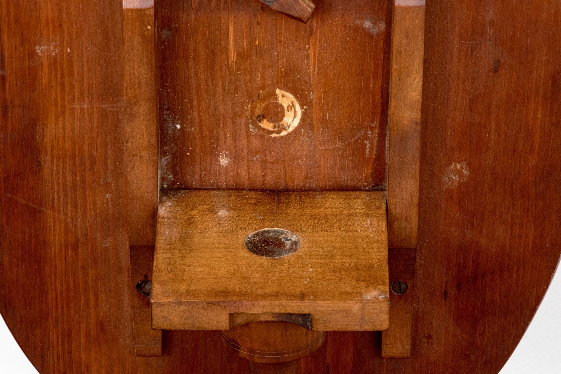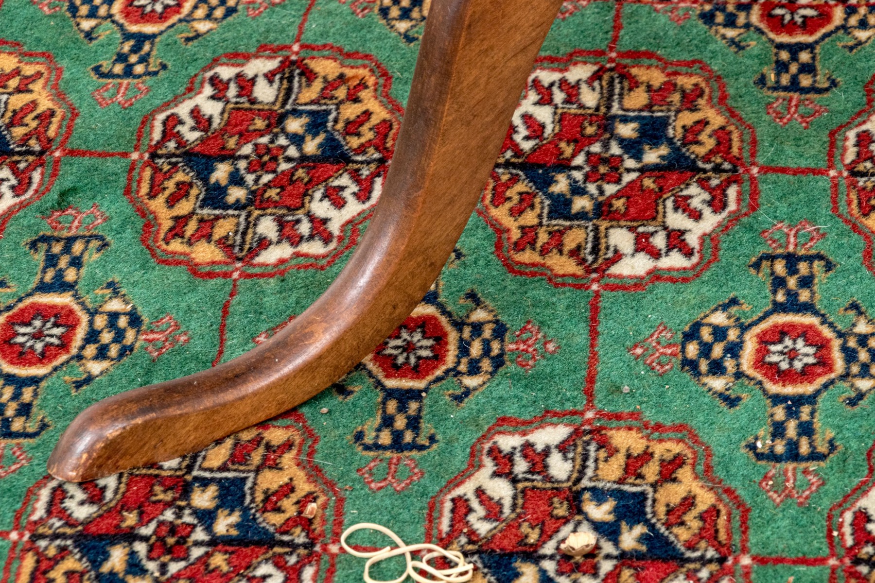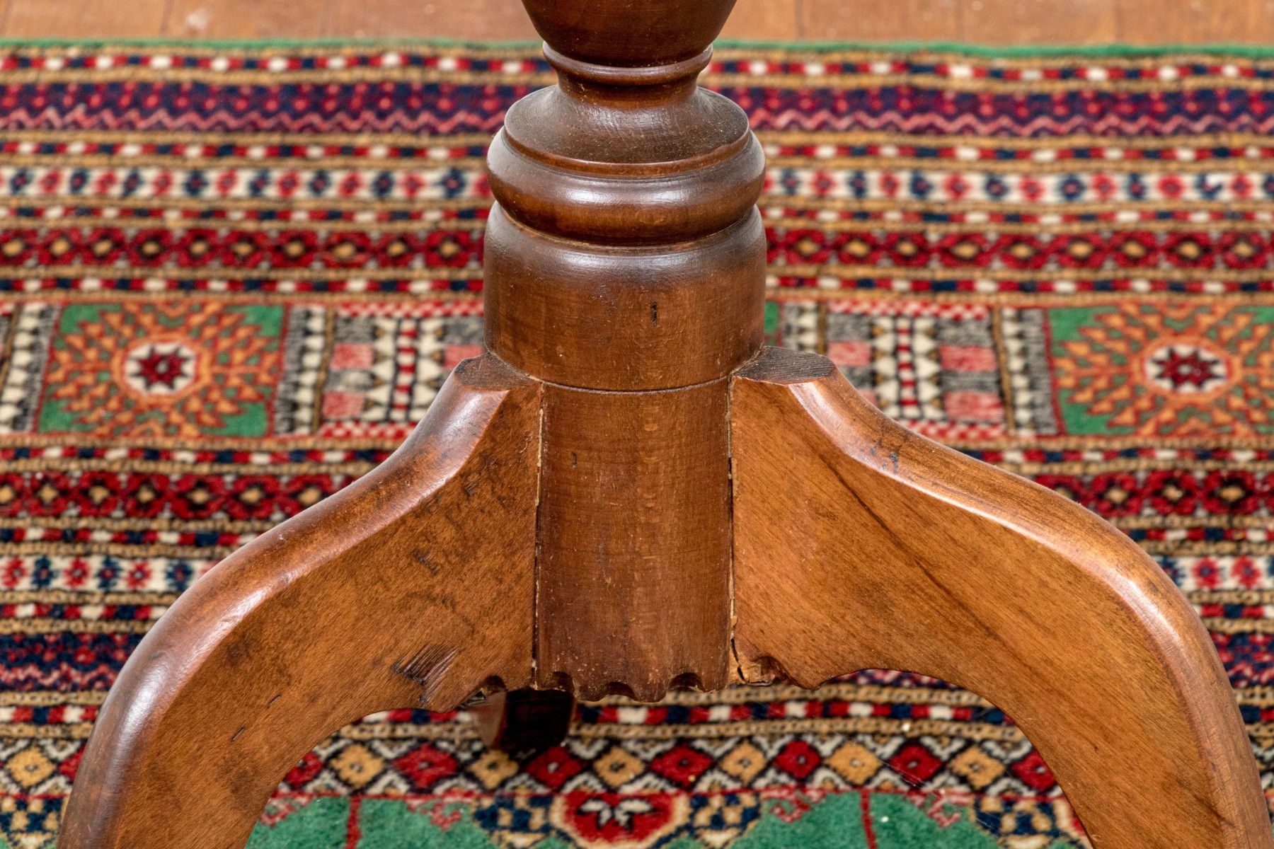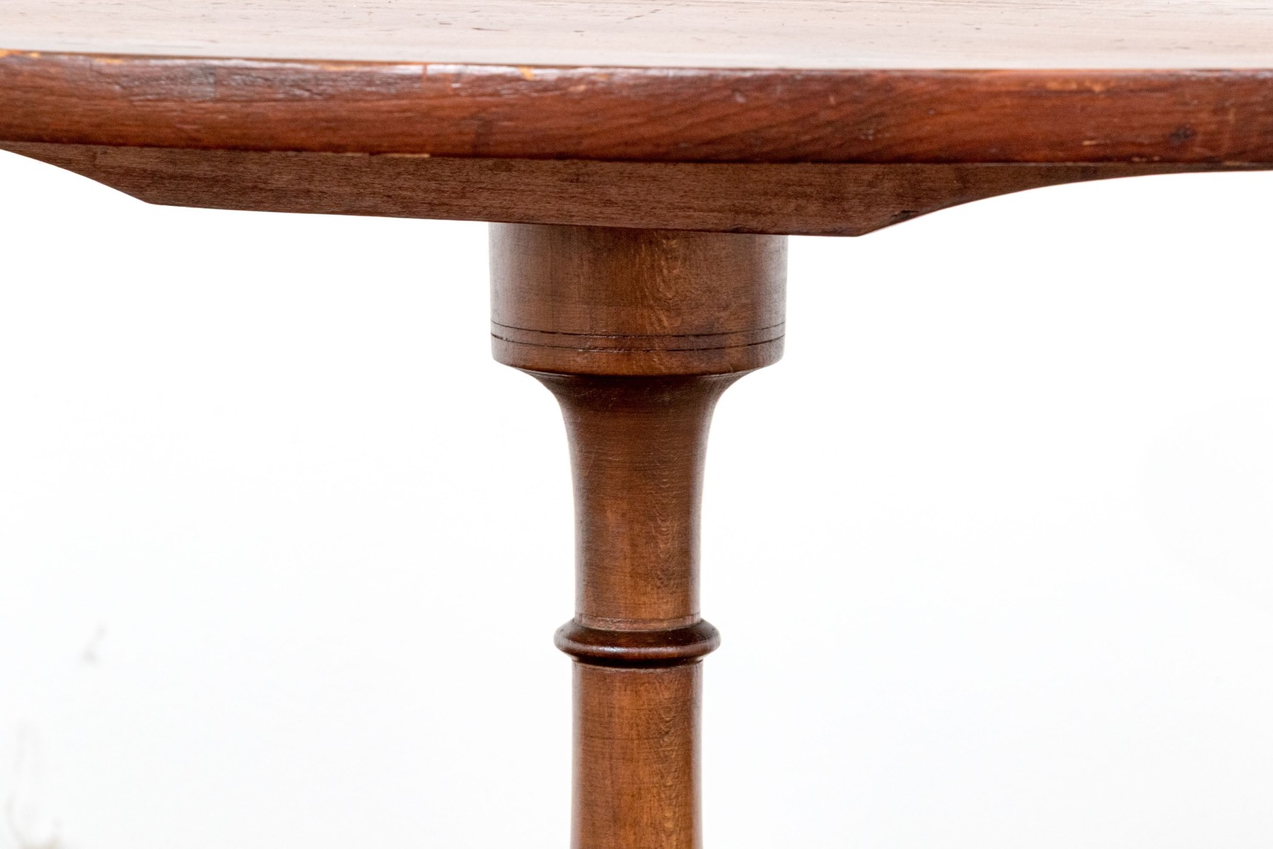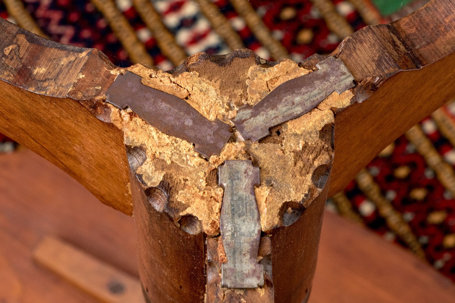 The table has been repaired where the legs meet the base of the pedestal. Finish wear to the top.