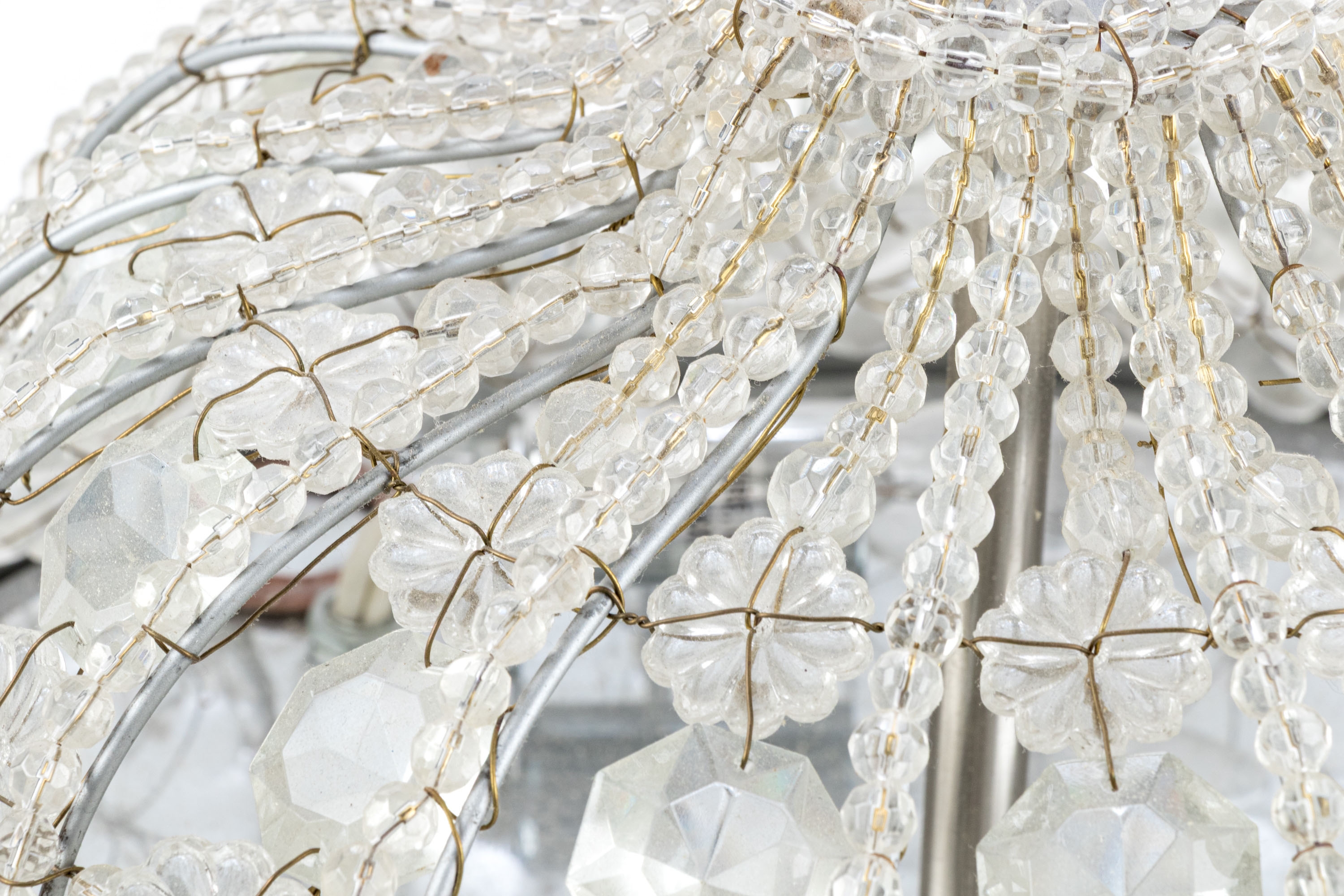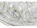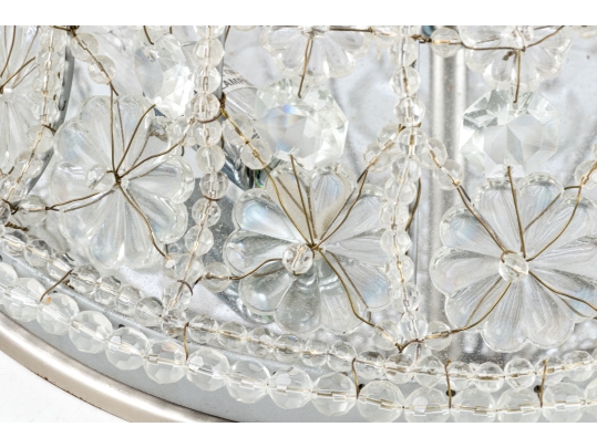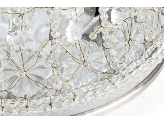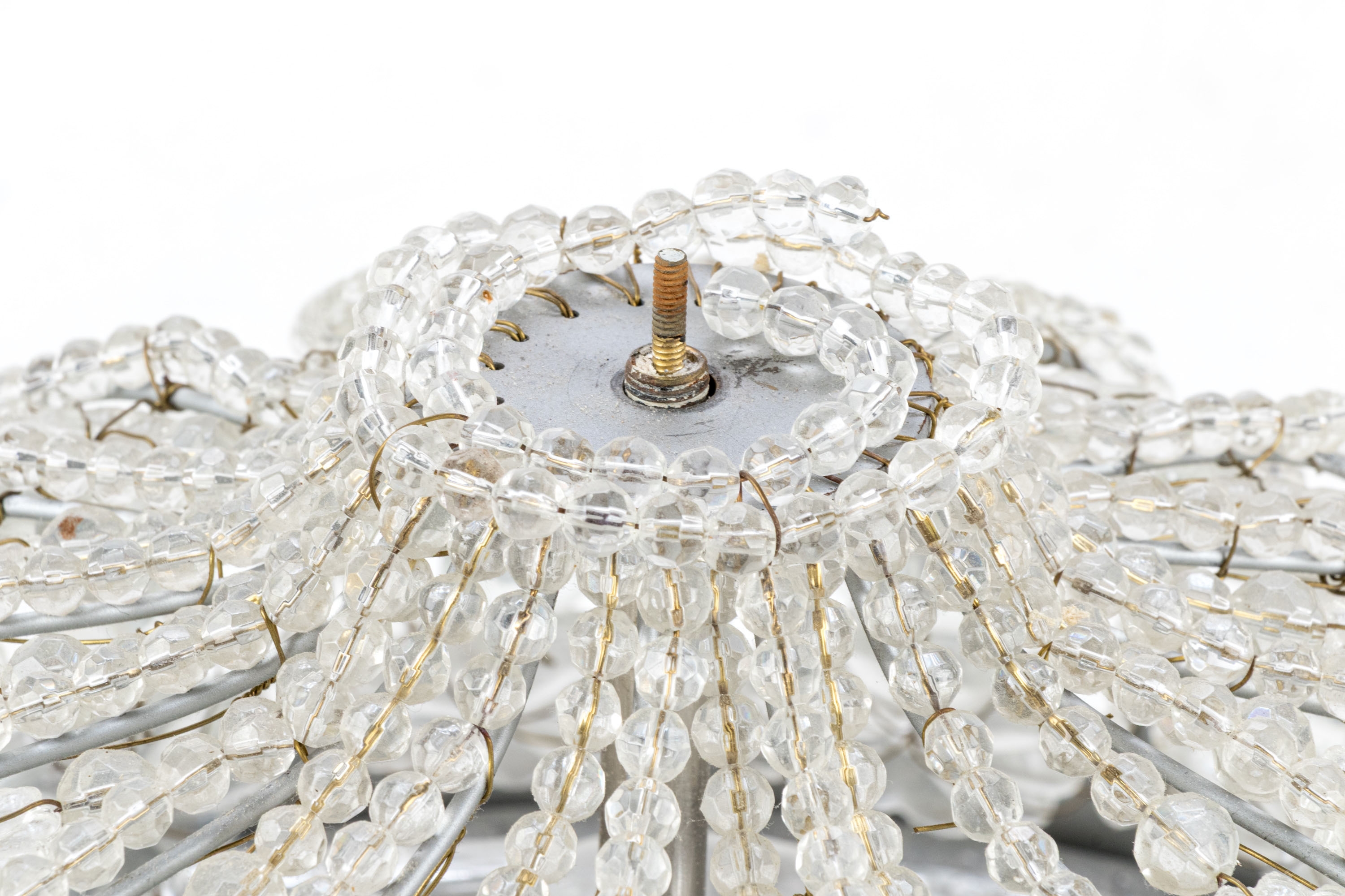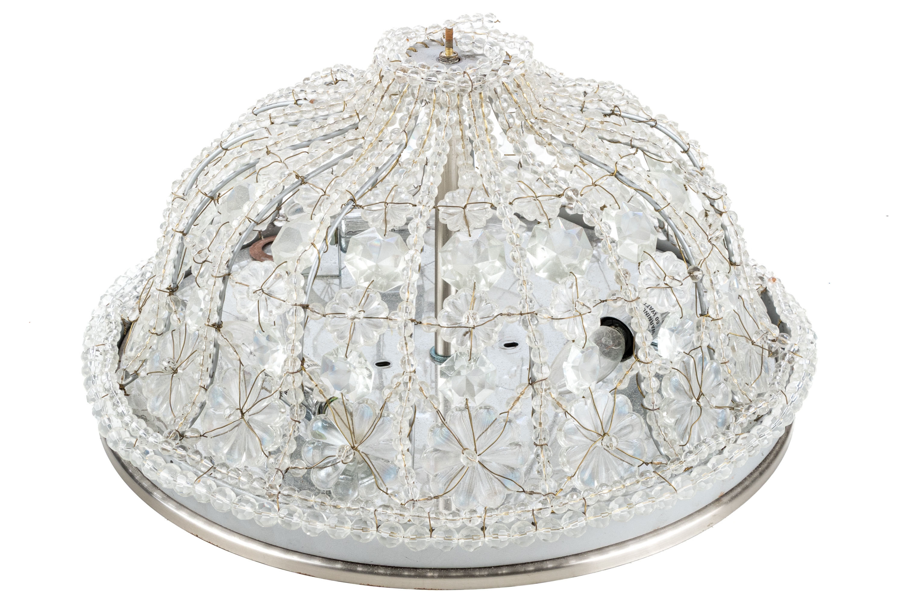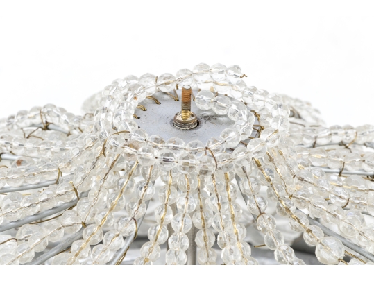 Vintage crystal macaroni beaded basket chandelier made by New Metal Crafts Inc. The chandelier has a domed shape, constructed with a wire frame adorned with numerous round, faceted and flower form clear crystal beads. These beads create a textured, almost net-like appearance. The lower portion of the chandelier is finished with a metal ring, which appears to be chrome. The overall design is reminiscent of a retro or vintage style, and it's designed to be mounted flush against a ceiling. Retains the original label.